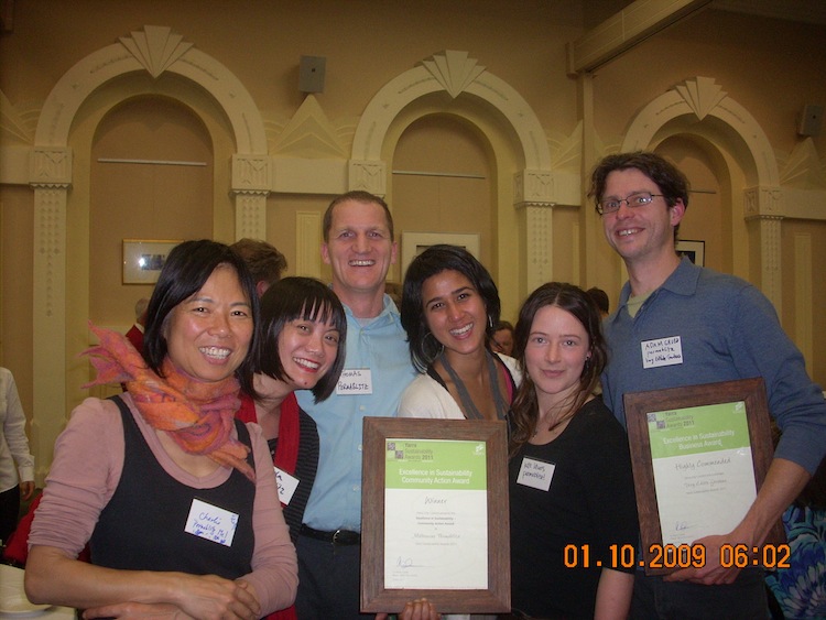 - And here are members of the 2011 Melbourne Permaculture Collective: Charlie, Angela, Thomas, Asha, Kat and Adam after accepting the winners award in the Community Action category at the Yarra Sustainability Awards 2011 (ignore the timestamp).