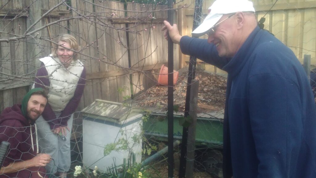 Terry (Obi Wan), Daniel and Noreen stabilise the espalier post while minding the bees!