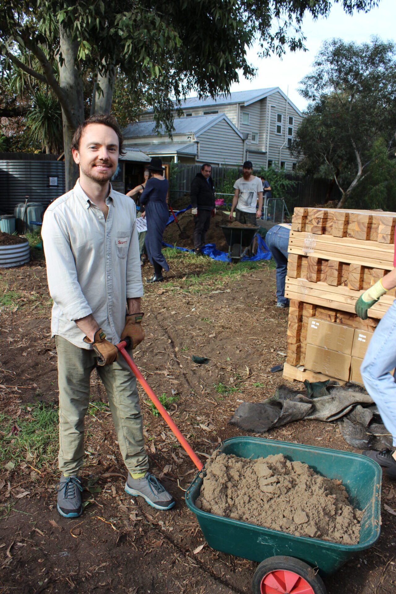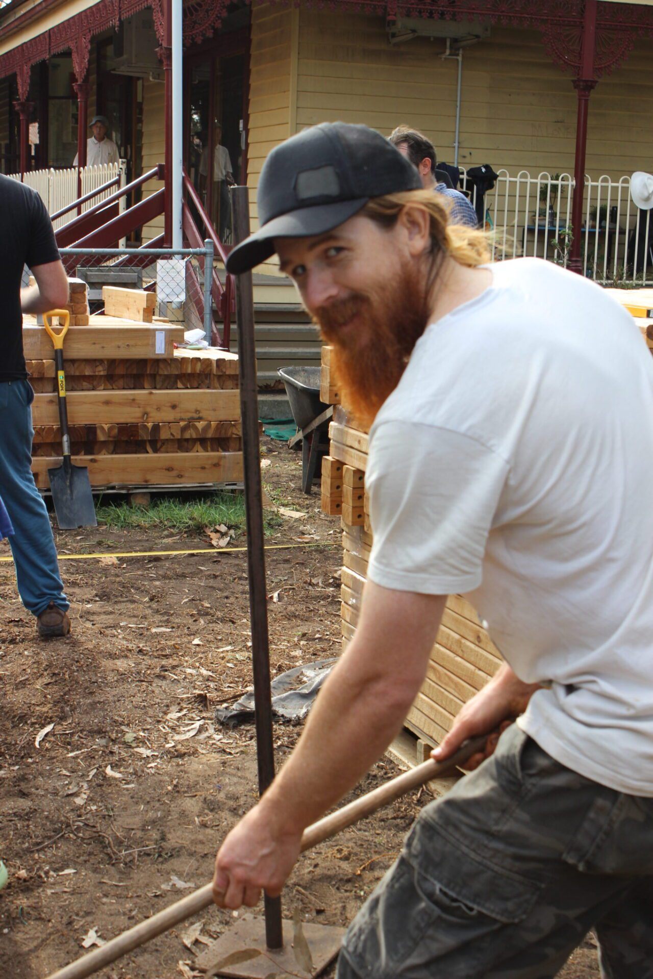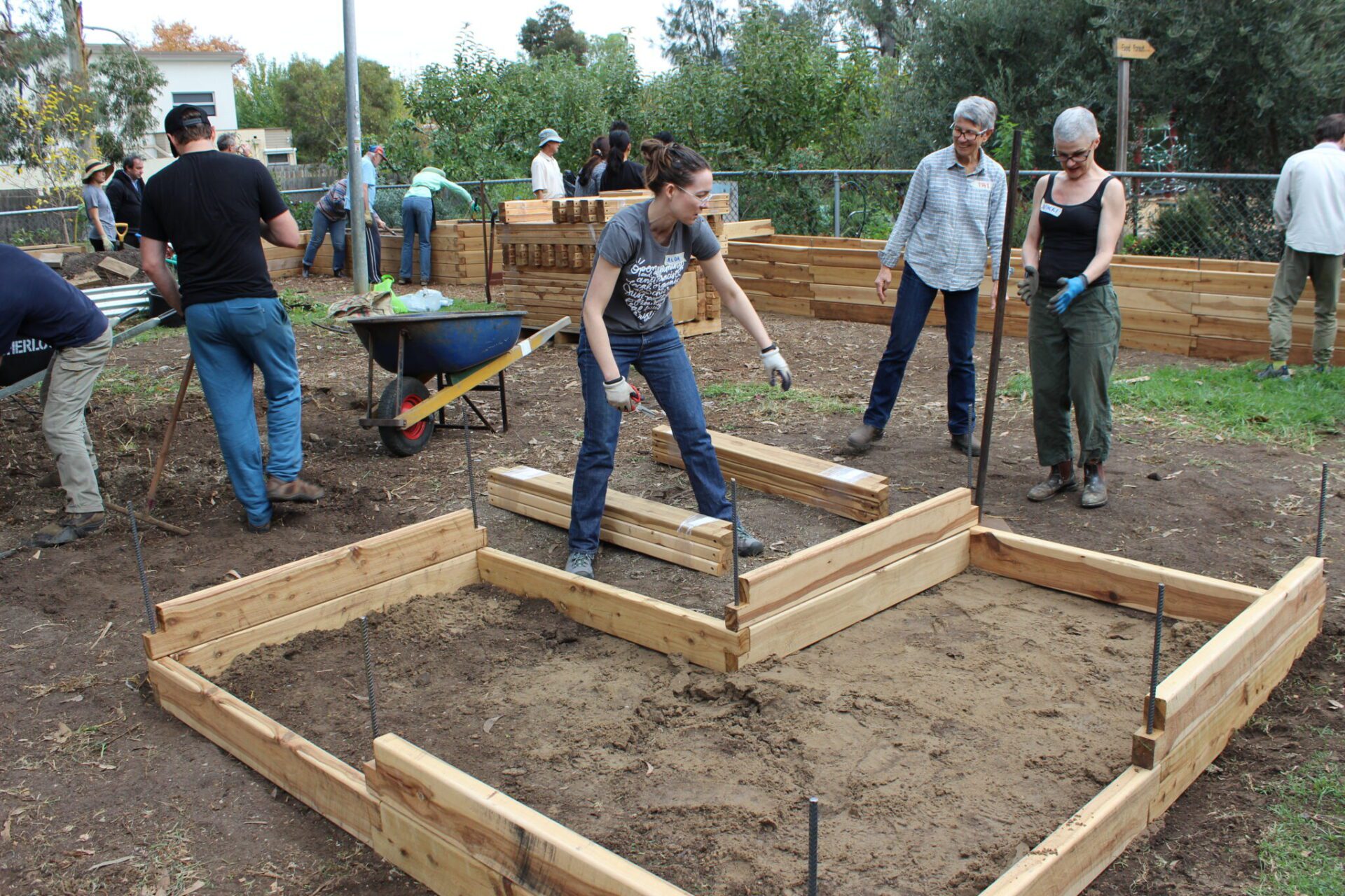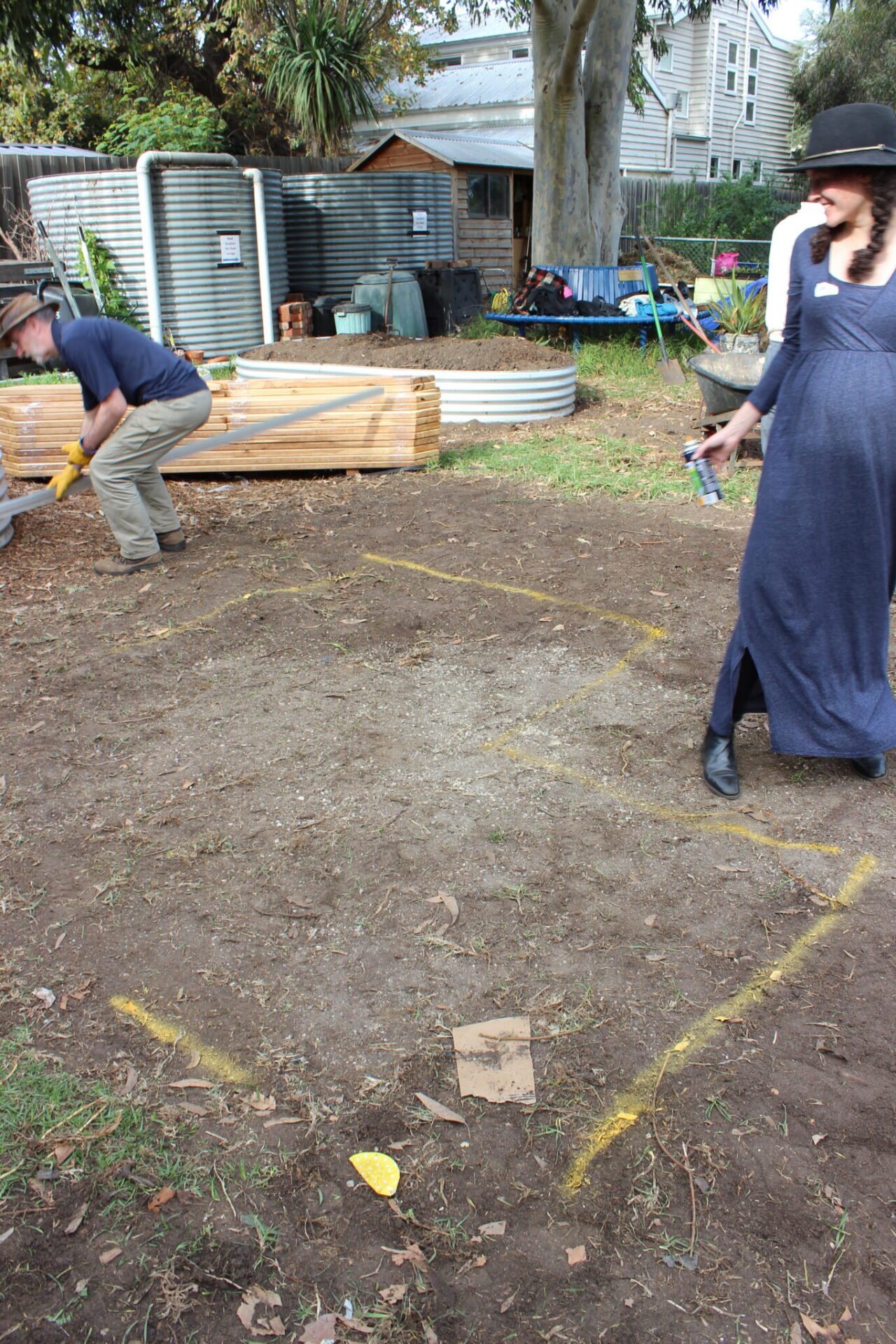 Finding solutions to site problems and sustainability are core considerations in a permaculture design process. Chatting with Jo of The Desert Echo, the author of the design plan for the blitz, I learned that the water uptake of the magnificent eucalypt towering up the centre of the site was one of the ‘problems’ needing to be solved. Other problems were the intensity of labour required for the watering roster over the summer months that could be difficult to sustain and ease of accessibility to the beds for the diverse community using them. The answer? Raised beds and Wicking Beds — of course!