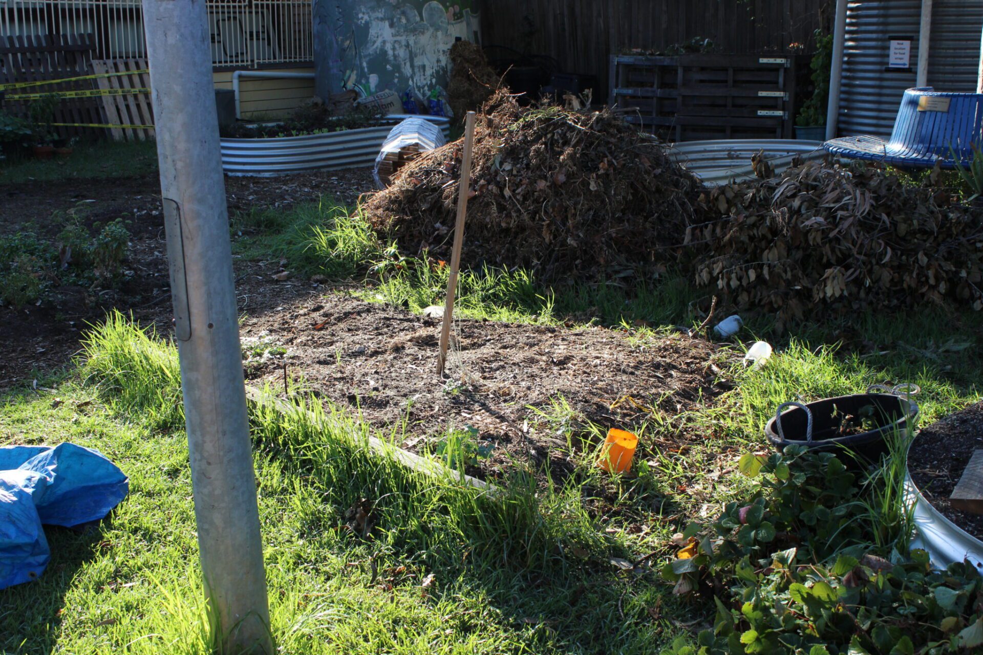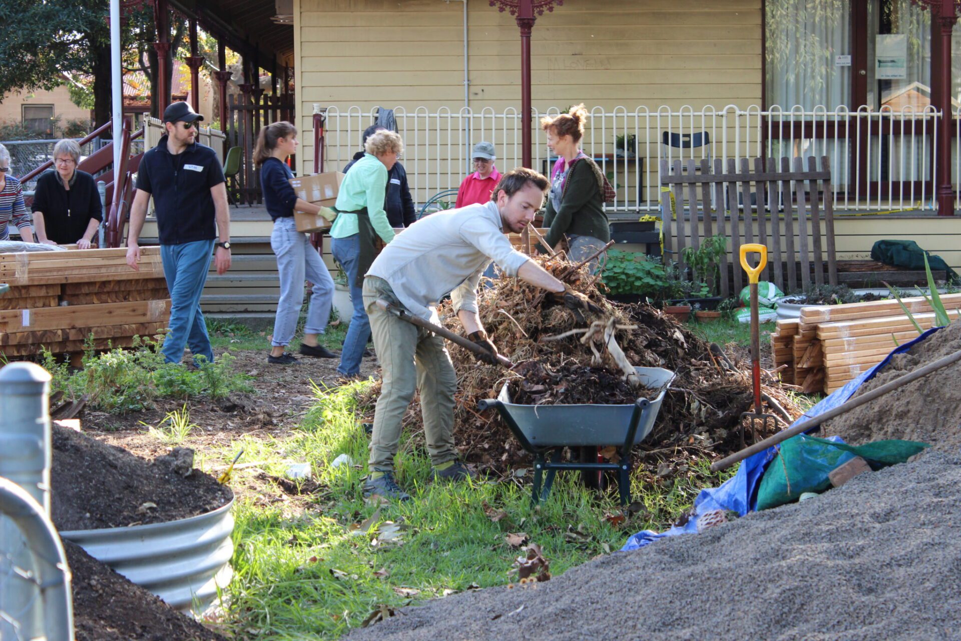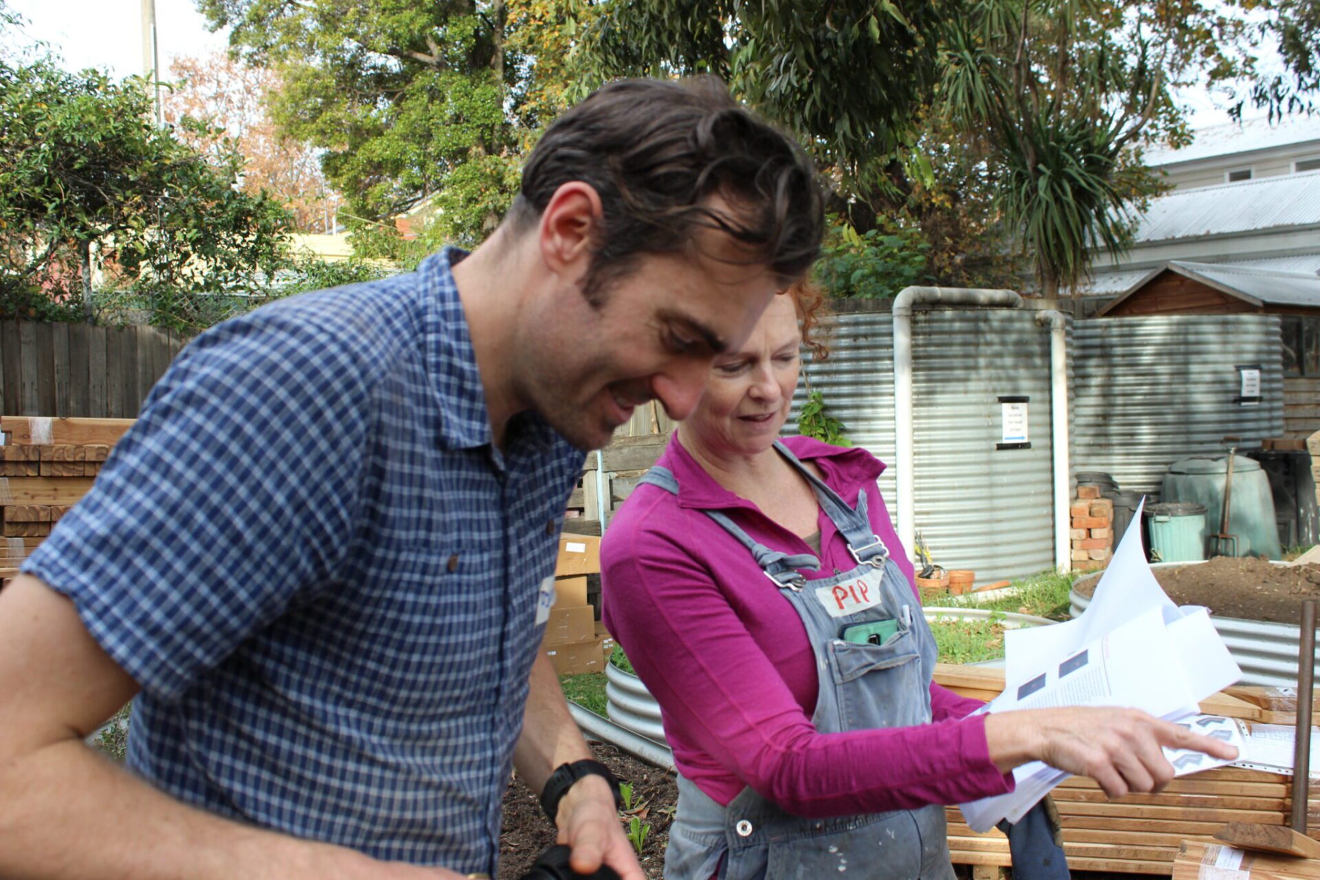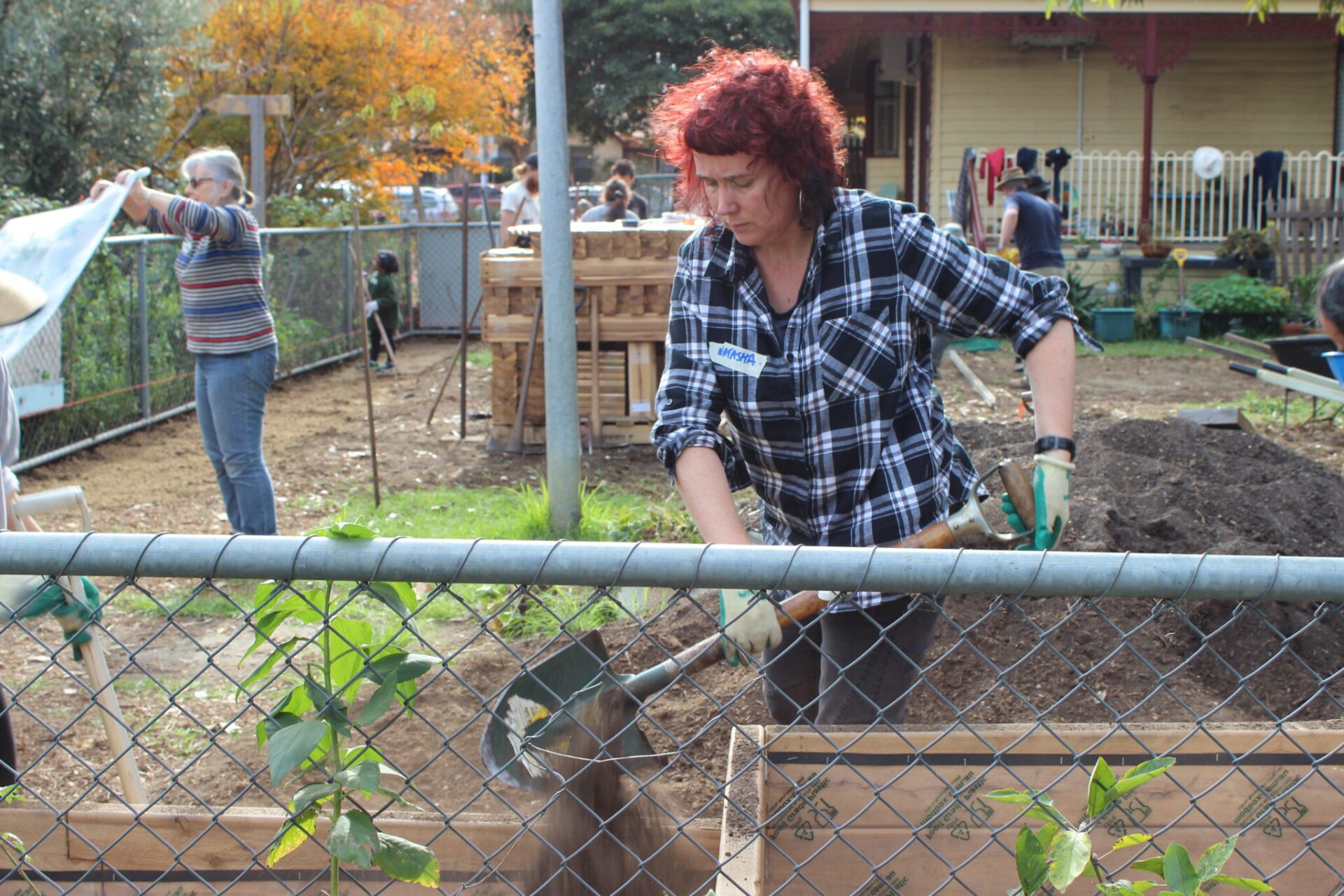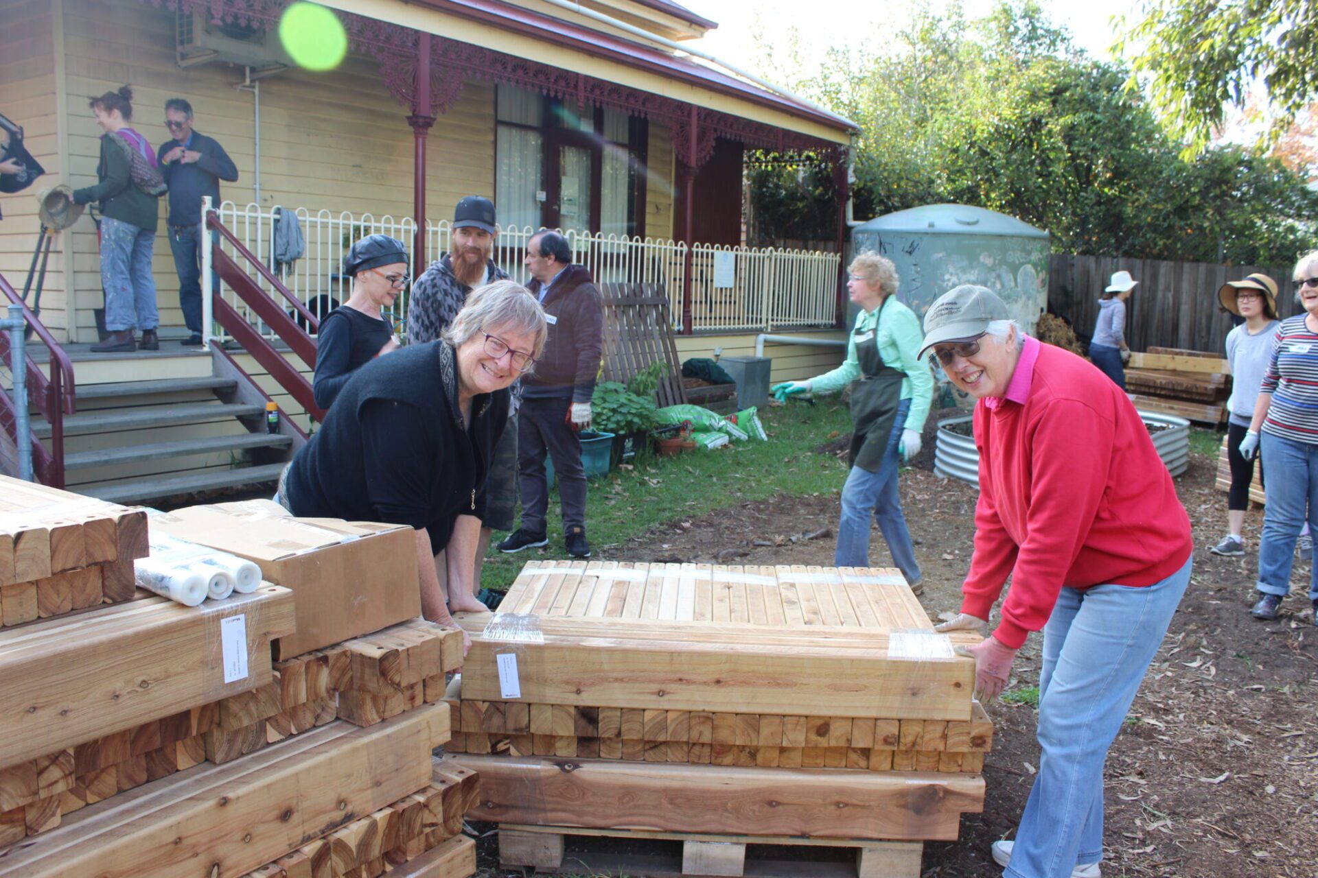 Finding solutions to site problems and sustainability are core considerations in a permaculture design process. Chatting with Jo of The Desert Echo, the author of the design plan for the blitz, I learned that the water uptake of the magnificent eucalypt towering up the centre of the site was one of the ‘problems’ needing to be solved. Other problems were the intensity of labour required for the watering roster over the summer months that could be difficult to sustain and ease of accessibility to the beds for the diverse community using them. The answer? Raised beds and Wicking Beds — of course!