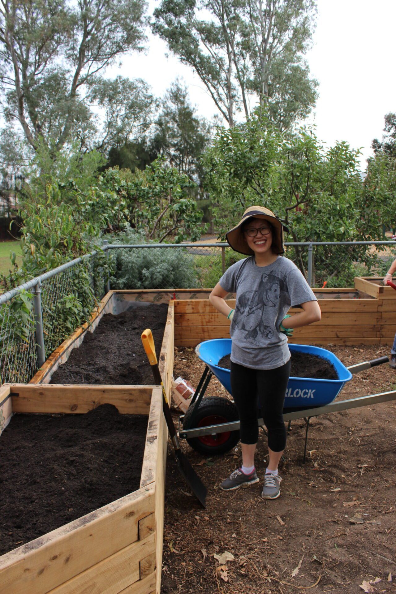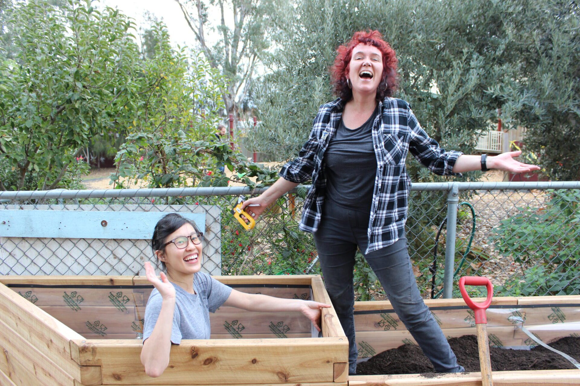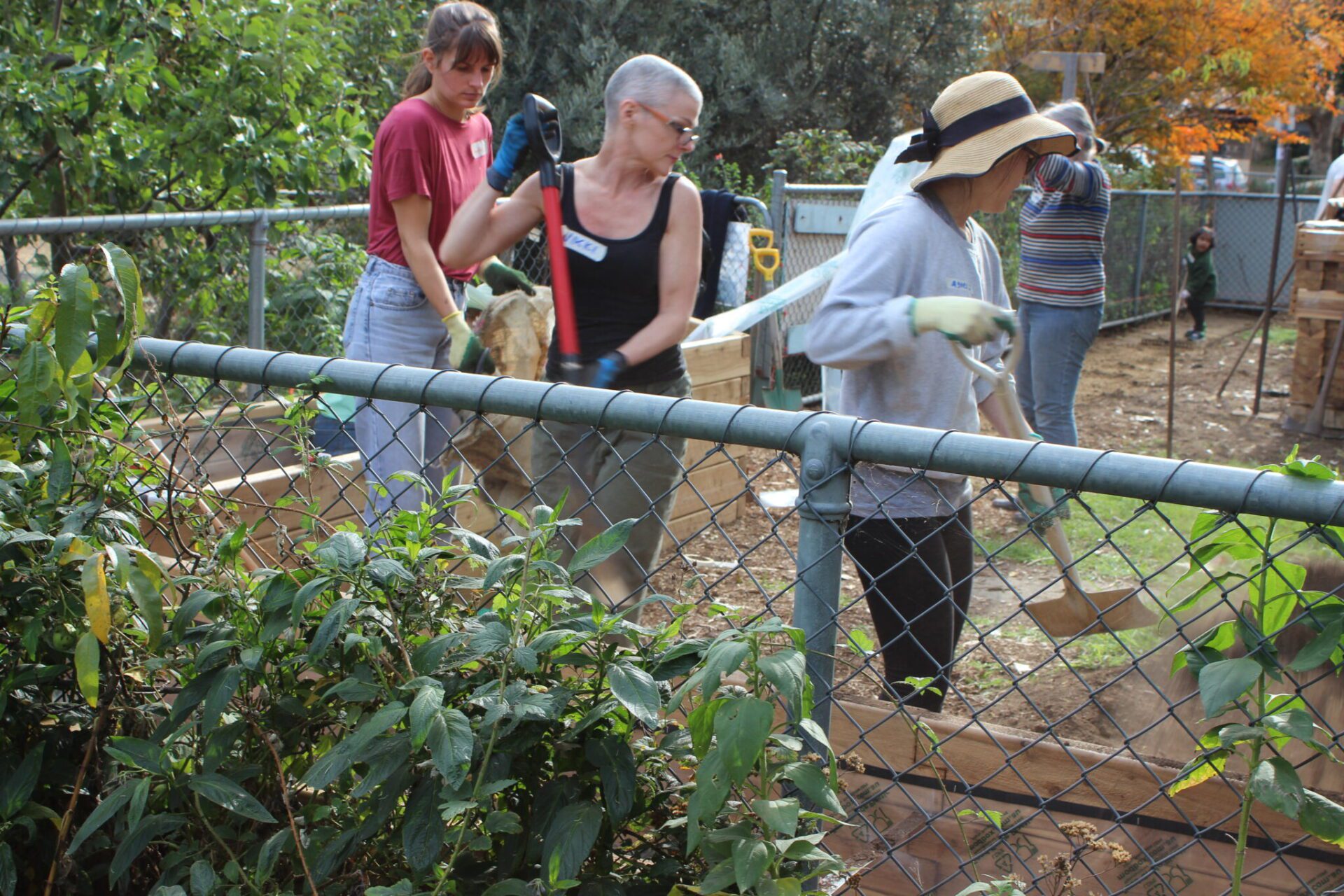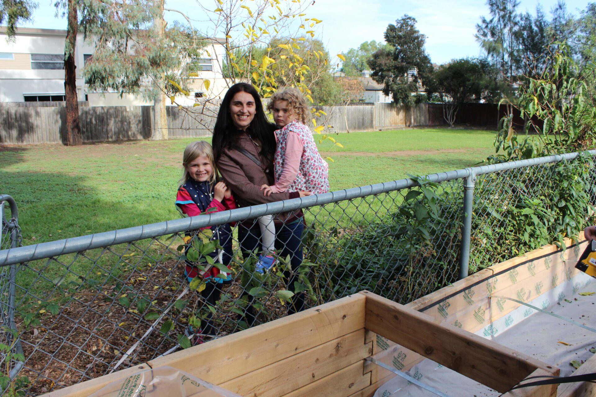 Finding solutions to site problems and sustainability are core considerations in a permaculture design process. Chatting with Jo of The Desert Echo, the author of the design plan for the blitz, I learned that the water uptake of the magnificent eucalypt towering up the centre of the site was one of the ‘problems’ needing to be solved. Other problems were the intensity of labour required for the watering roster over the summer months that could be difficult to sustain and ease of accessibility to the beds for the diverse community using them. The answer? Raised beds and Wicking Beds — of course!