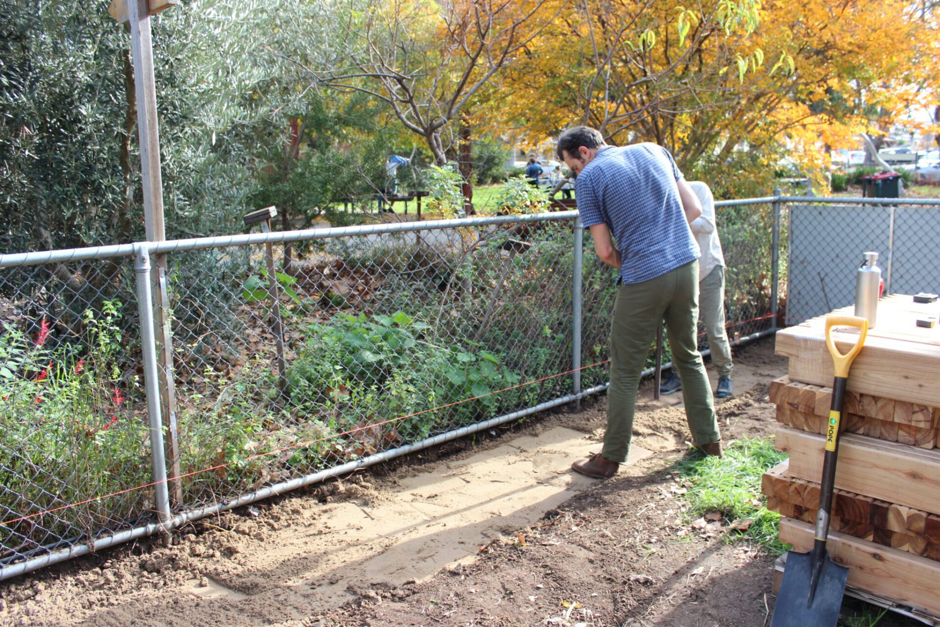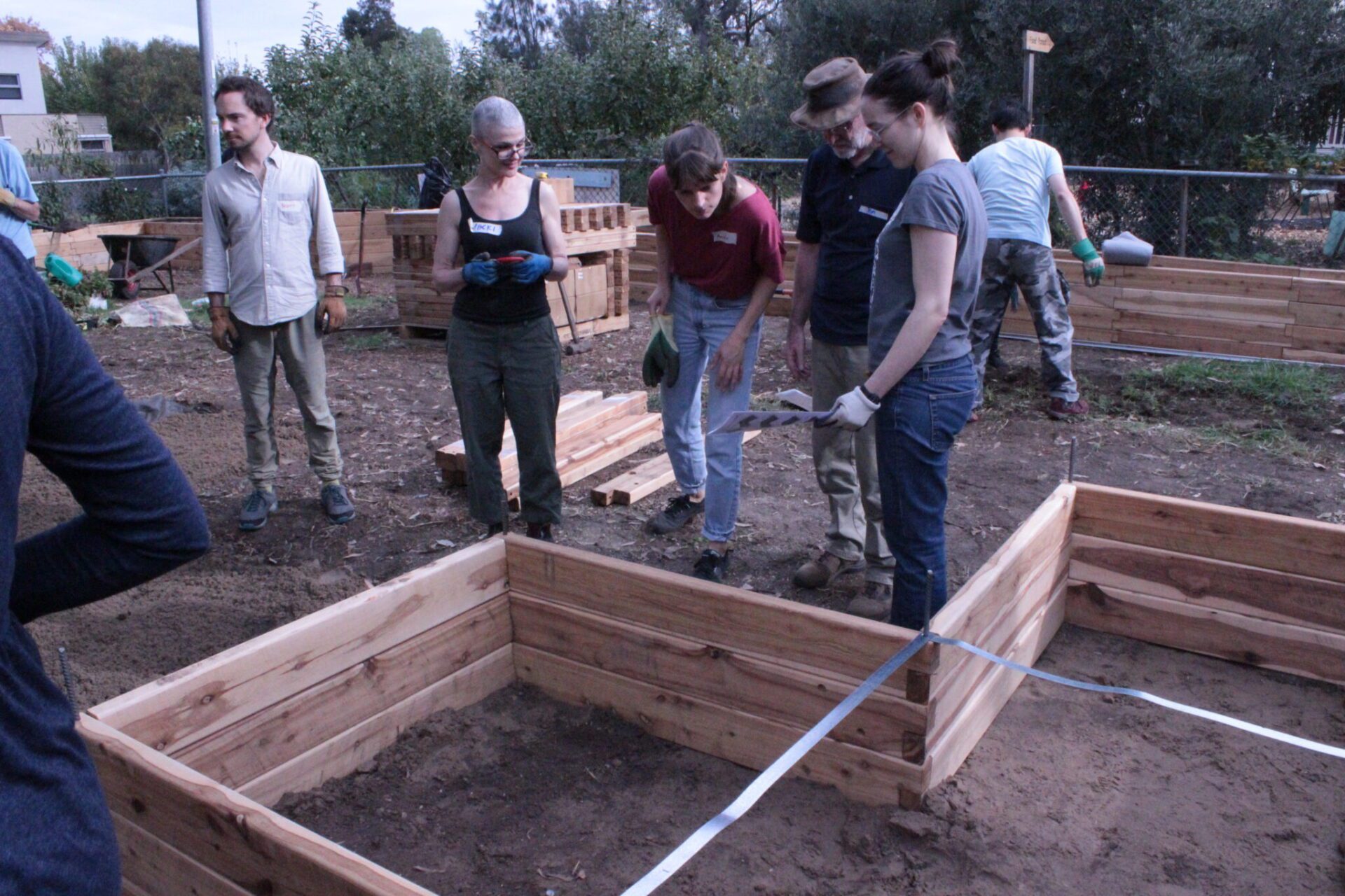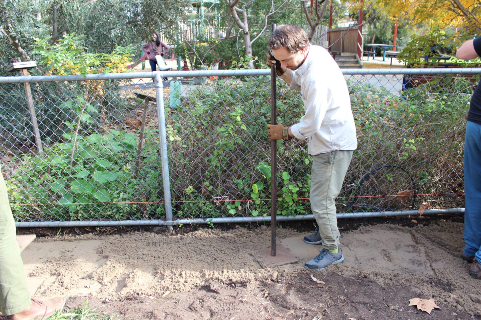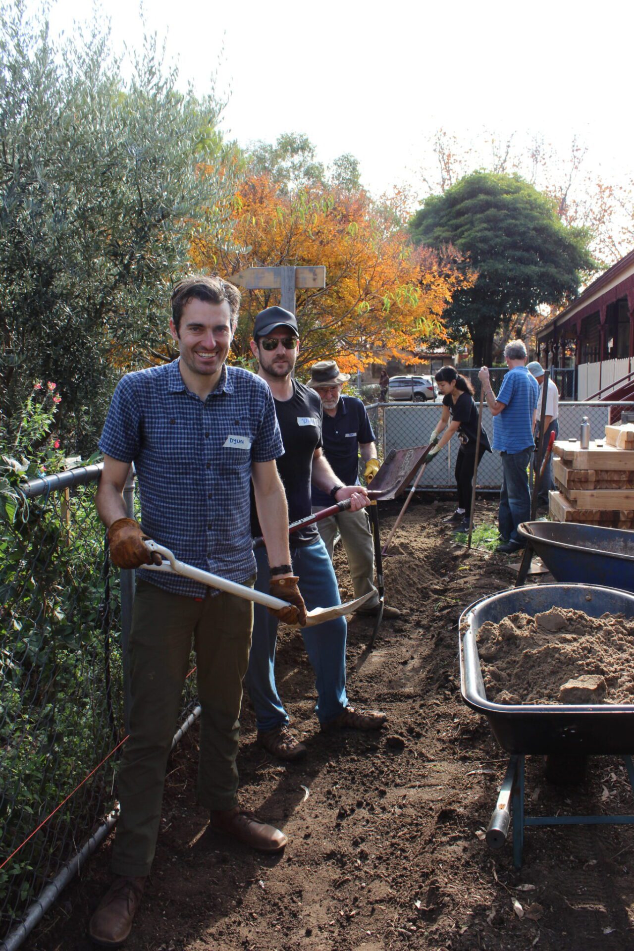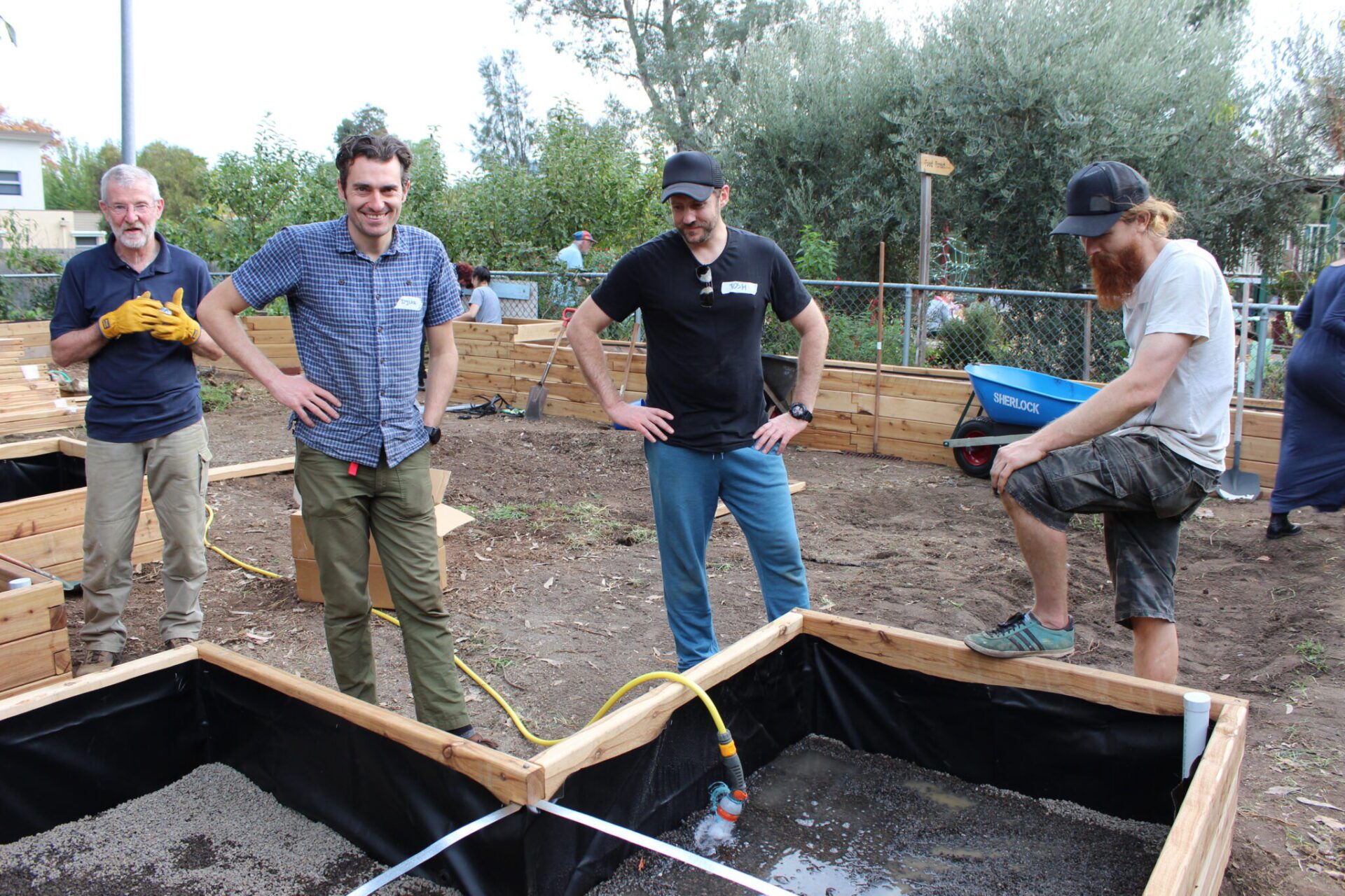 - Dylan, Joel, Rob, Maki, Rob, and Thomas levelling and preparing the ground with sand for the installation of a very long Modbox raised bed.