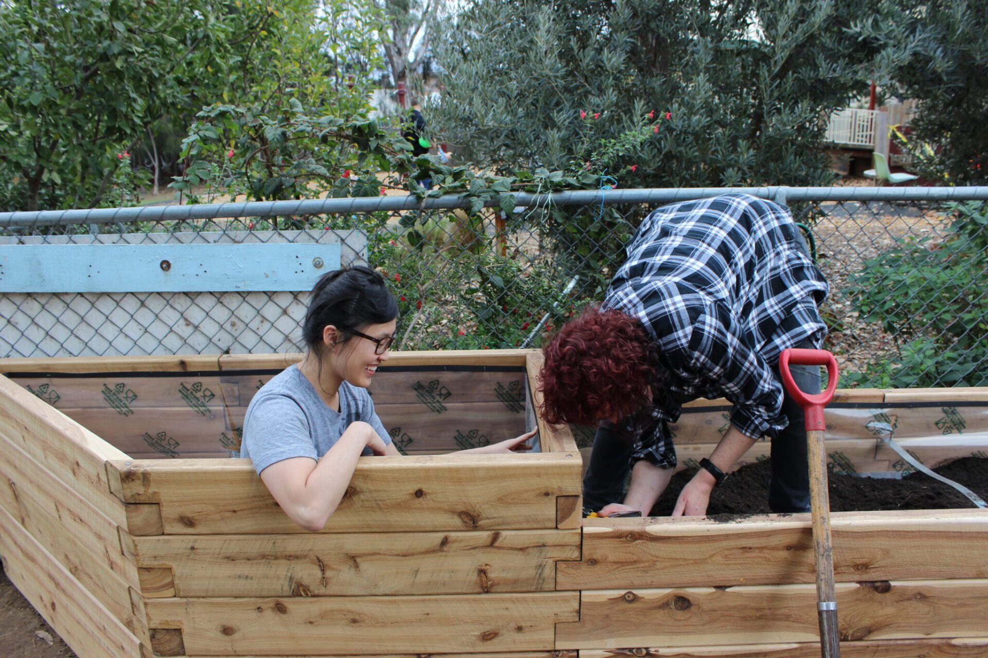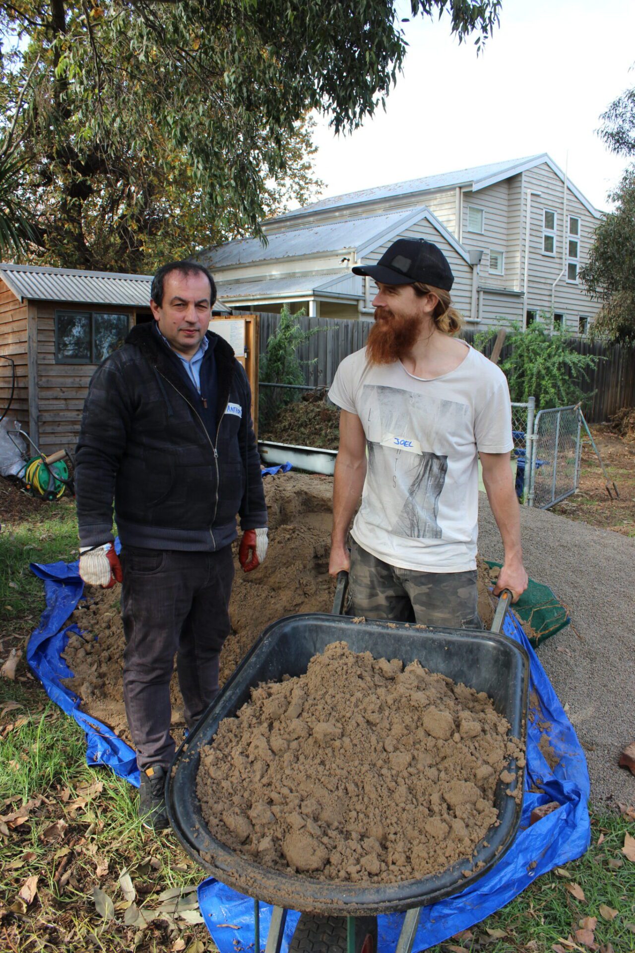 Dylan and Scott levelling the sand base out for the garden bed bases.