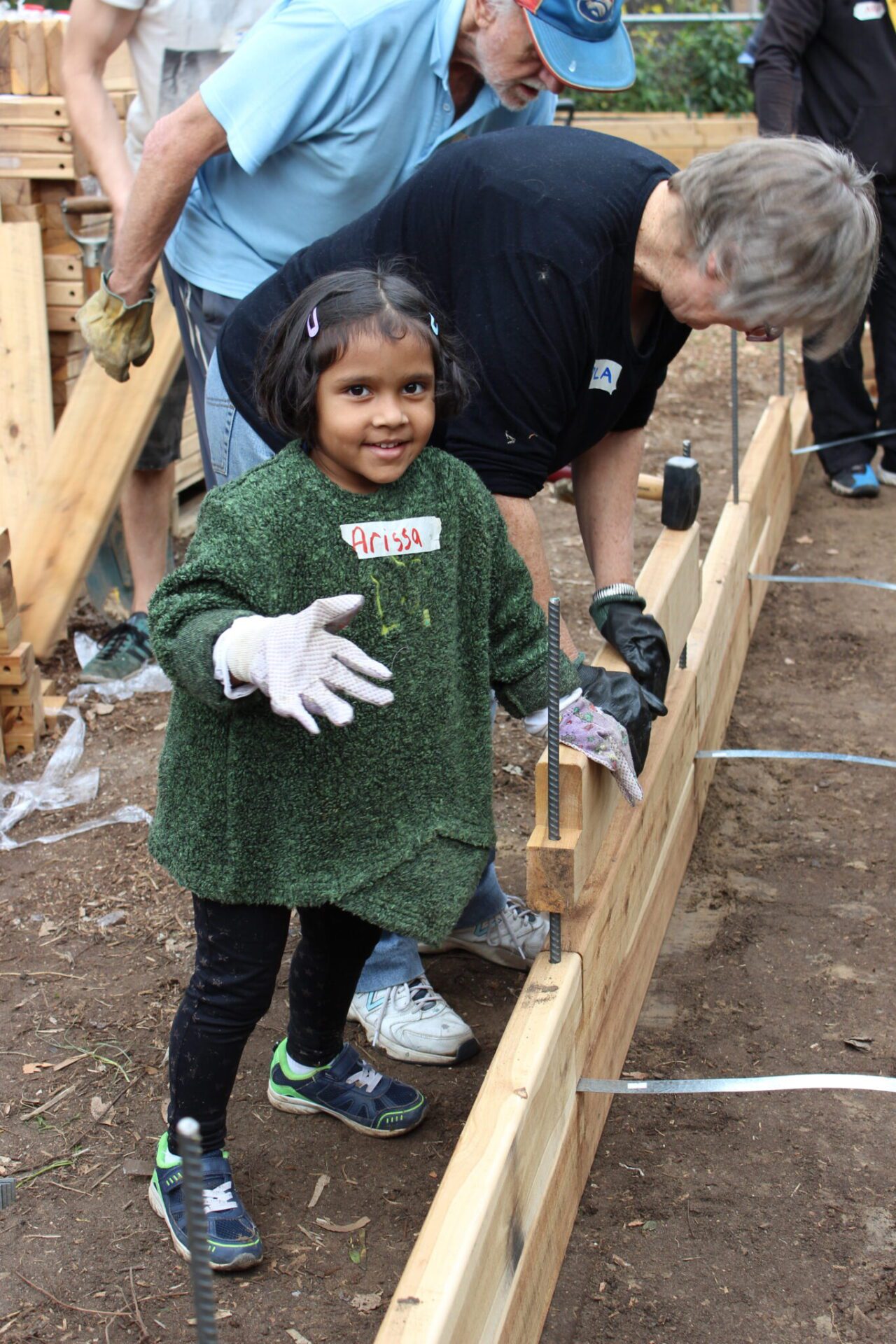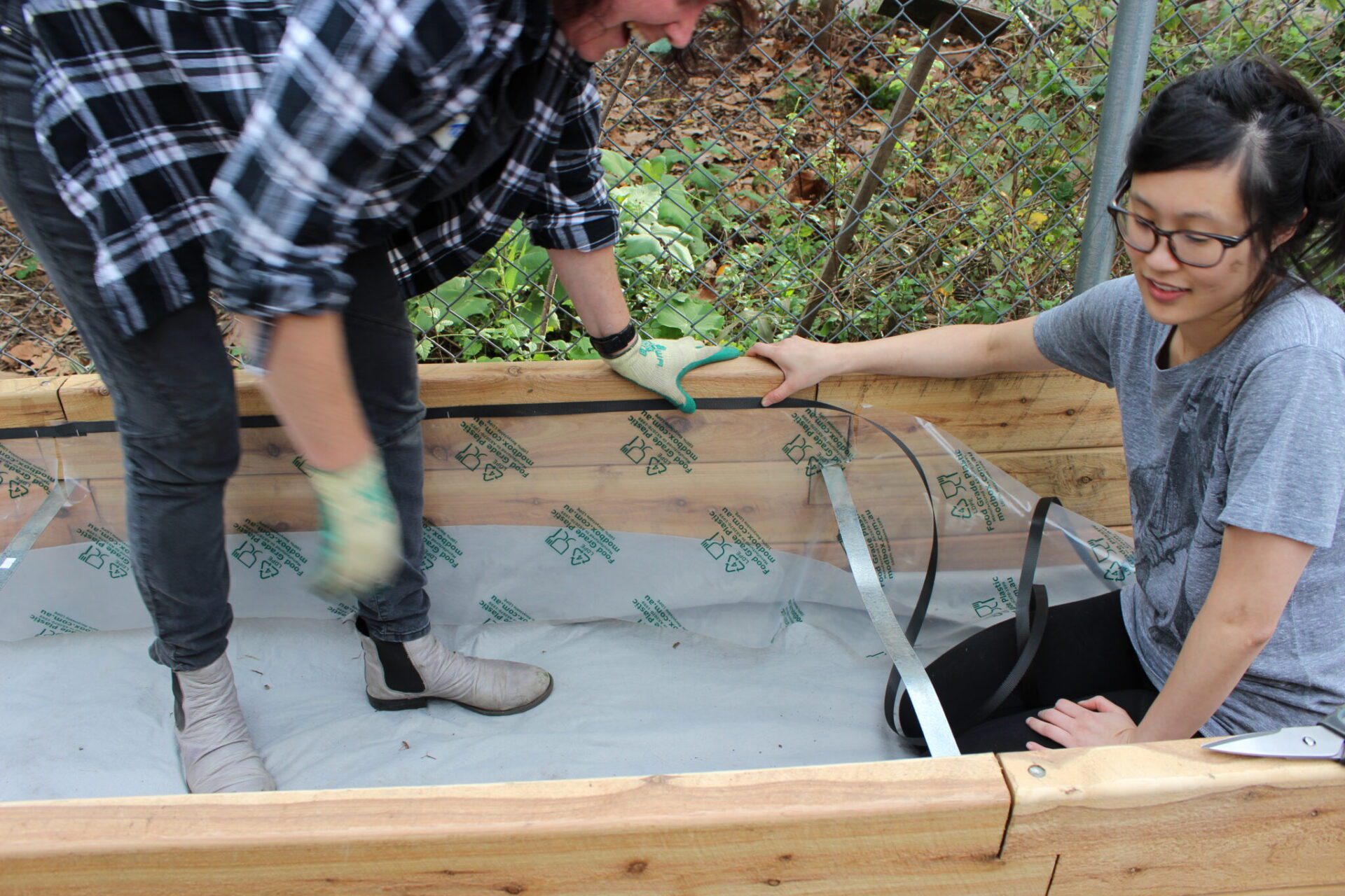 Some interested onlookers and Agnes and friend working on the attaching food grade plastic with a little help from Arissa and her mum, Sabrina. Loads of teamwork went into getting this bed ready for filling – some nice work by Ros, Elaine & Anthony.