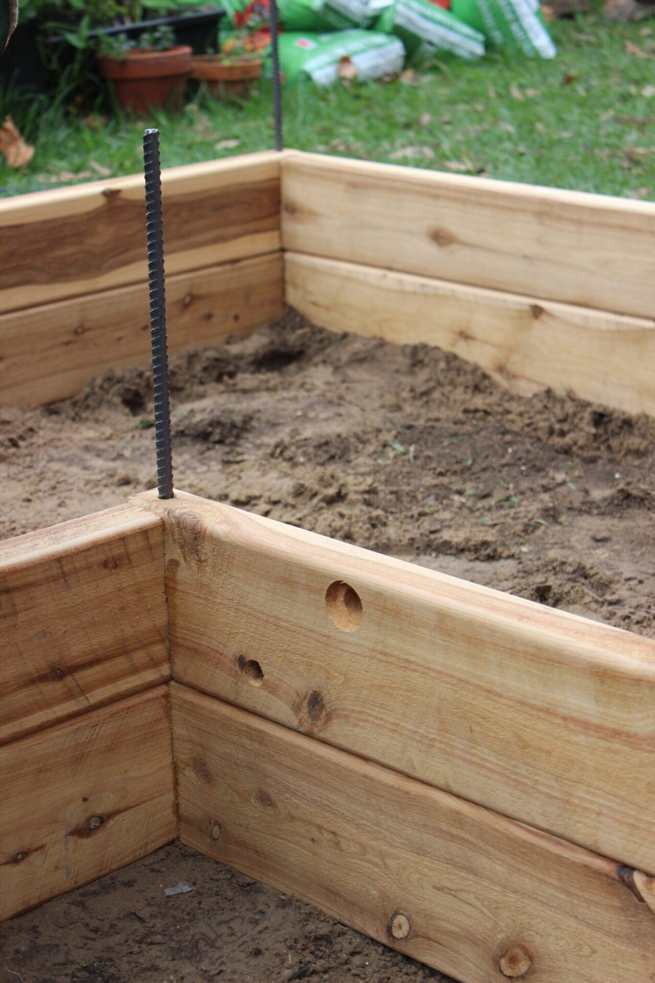 - Geofabric was stapled up the side of the bed covering the scoria (a.k.a. gravel or metal) to prevent root invasion and separate the soil from the scoria.