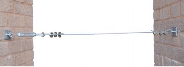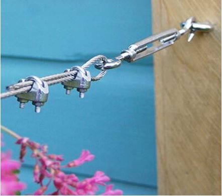 - The wire run to the other post, which is also fitted with eye screw, thimble, turnbuckle and rope grips. Wire pulled taut onto thimble, and lightly tightened by pulling and then fitting via wire rope grips (2 off). Turnbuckle set up initially with adjustment threads open (turnbuckle is slack with no tension). Initial tension is by pulling only. Once initial tension is set up and all fittings tightened, the turnbuckle can be adjusted (by hand) to apply tension to the wire.
