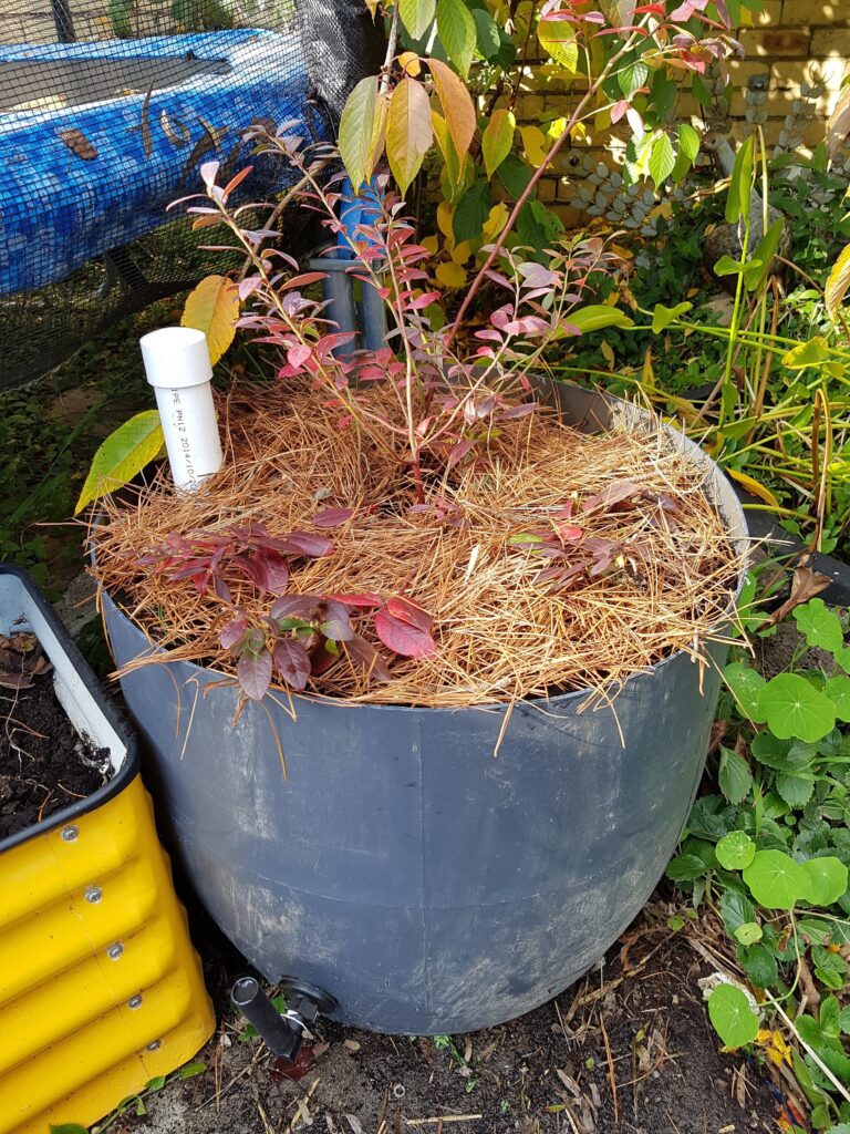 This finished barrel below has a deciduous blueberry bush in it. They say can grow to 2m, so I’ve got it in a nice sunny spot. The concrete will act as a heat bank and will add to the overall warmth that the barrel will enjoy. I’ve also added some pine needles that I got from a local park instead of pea-straw as I’e read that they provide the blueberry bush root system with an environment that significantly improves fruit production. And that sounds good to me!