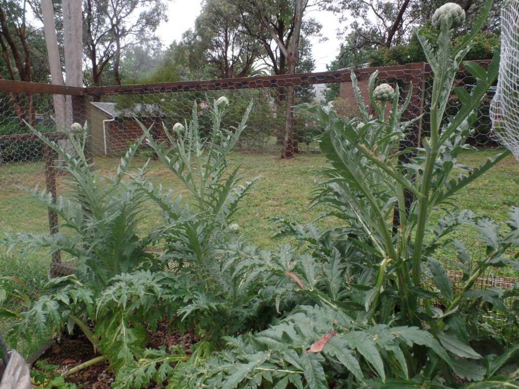 In keeping with permablitz principles, Carol collects her own seeds as much as possible – no bought seedlings where possible – and there is a wide variety of produce. One of the beds was being allowed to go to seed, so she can use them for the next planting. The lone artichoke mentioned in the first blitz article has become half a dozen, with mouthwatering artichokes nearly ready!