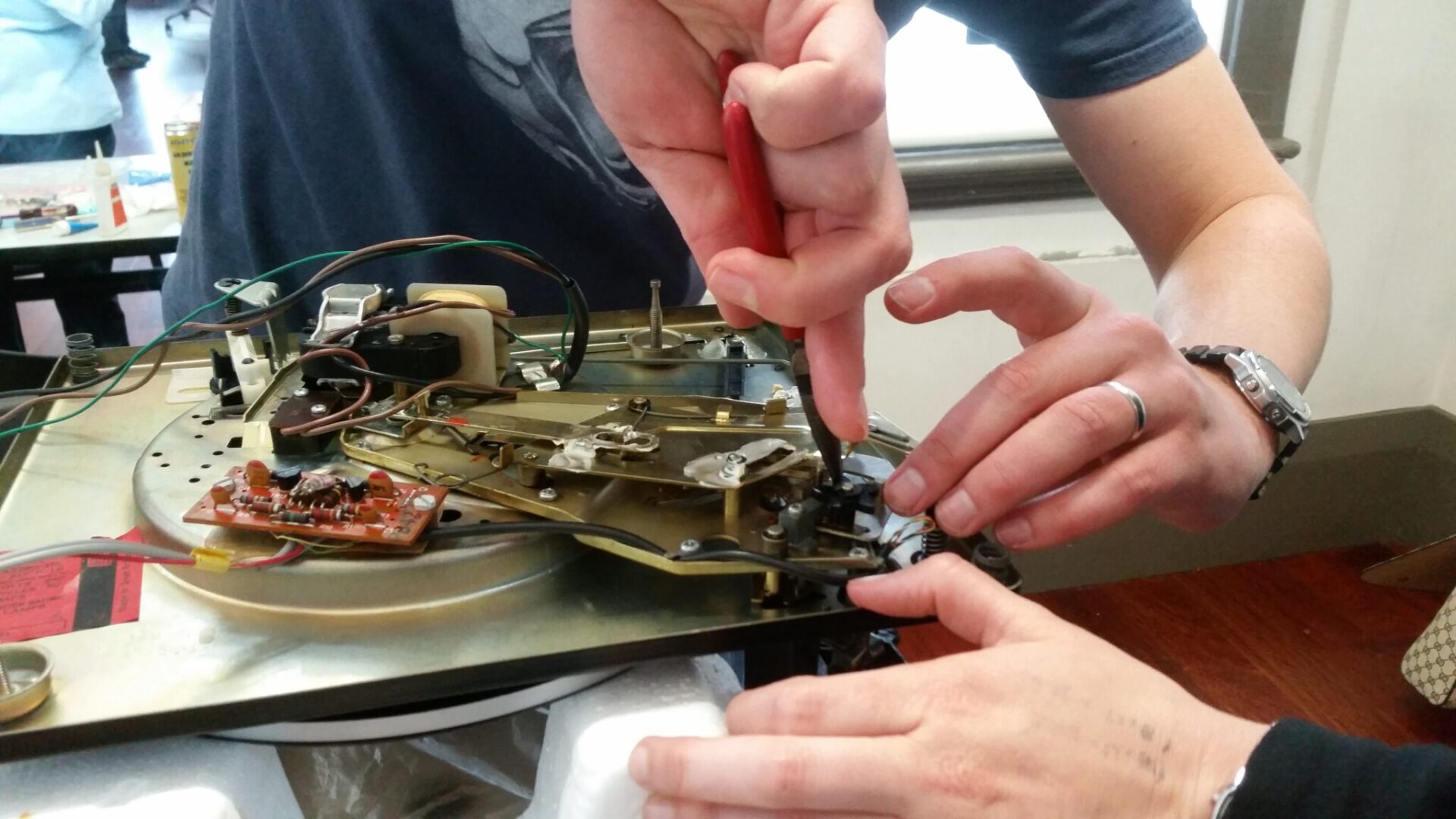 Sometimes a fix may be more complicated or require specialist skills, so you might not learn how to fix it but you still get to see and appreciate the intricacies of how it’s done. For instance, at our most recent repair session, a number of visitors were drawn in to see a turntable being repaired, fascinated by what’s “under the hood” and how Mikel went about working out what the trouble was and fixing it. We also occasionally hold workshops on things like basic hand sewing techniques or bike maintenance and repair.
