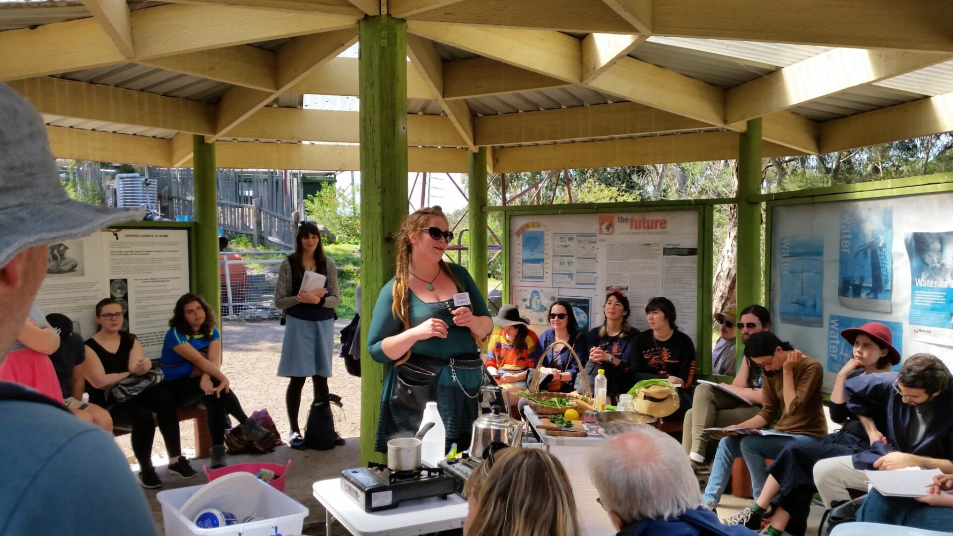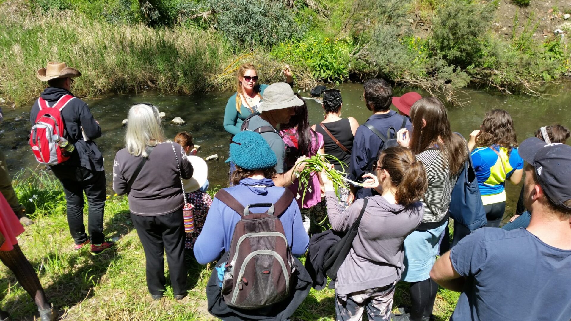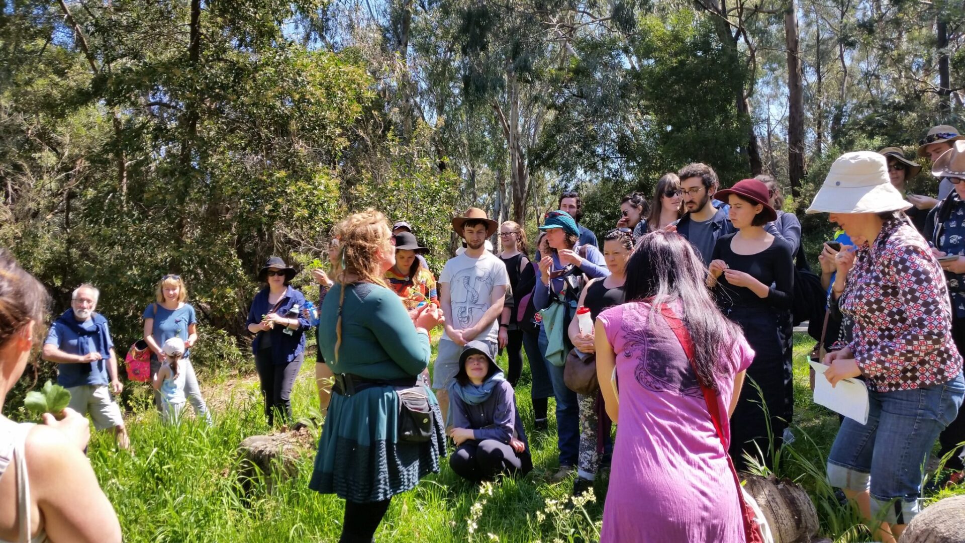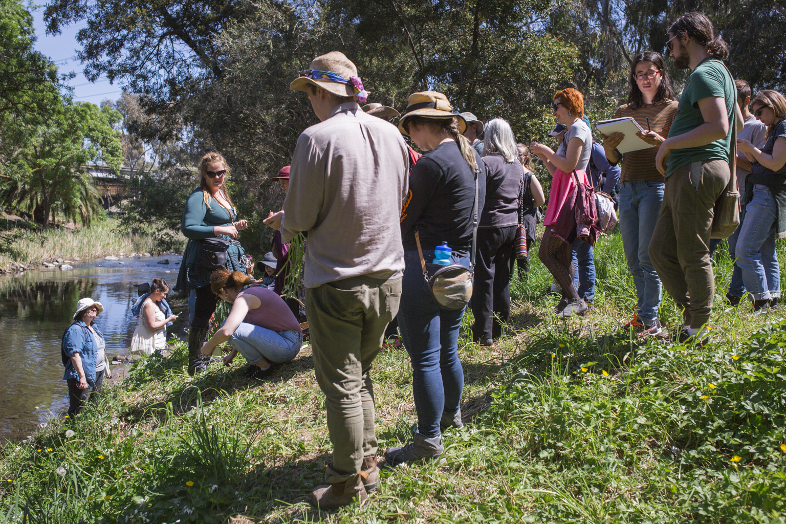 October saw guild members and folk from other walks of life join Free Food Forager‘s Ingrid Button for two very popular sessions (one on the 15th and another on the 22nd) for a meander down to the Merri Creek to forage for food. We learnt about the culinary and medicinal properties of herbs and other plants that we’d otherwise just walk on by, including warrigal greens as a spinach equivalent to wild fennel for tea. Ingrid demonstrated the perils of brushing skin against nettle, quickly followed by various herbal antidotes to take the sting out – including dock leaf and plantain. We discovered that cleavers (or sticky weed) could make a great poultice or pressure bandage when you have nothing else at hand out in the bush.
