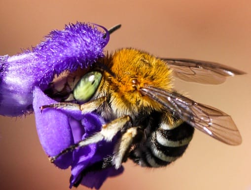 For home gardeners keen on obtaining higher yields and better quality edibles in the Solanaceae family (eggplants, tomatoes, chillies, capsicums), blueberries, cranberries and kiwifruit, plant highly attractive flowering plants such as Salvia to entice native pollinator to buzz pollinate edibles will have your garden buzzing with blue-banded bees. However, even though this is one of our larger native bees in Melbourne (10-12mm), the blue-banded bee is much more restricted in their foraging radius compared to a honeybee, venturing only around 350 metres from nesting burrows. They require long flowering reliable food sources rich in both pollen and nectar to be available between Spring and Autumn, making their active presence in your garden paramount to a bountiful harvest.