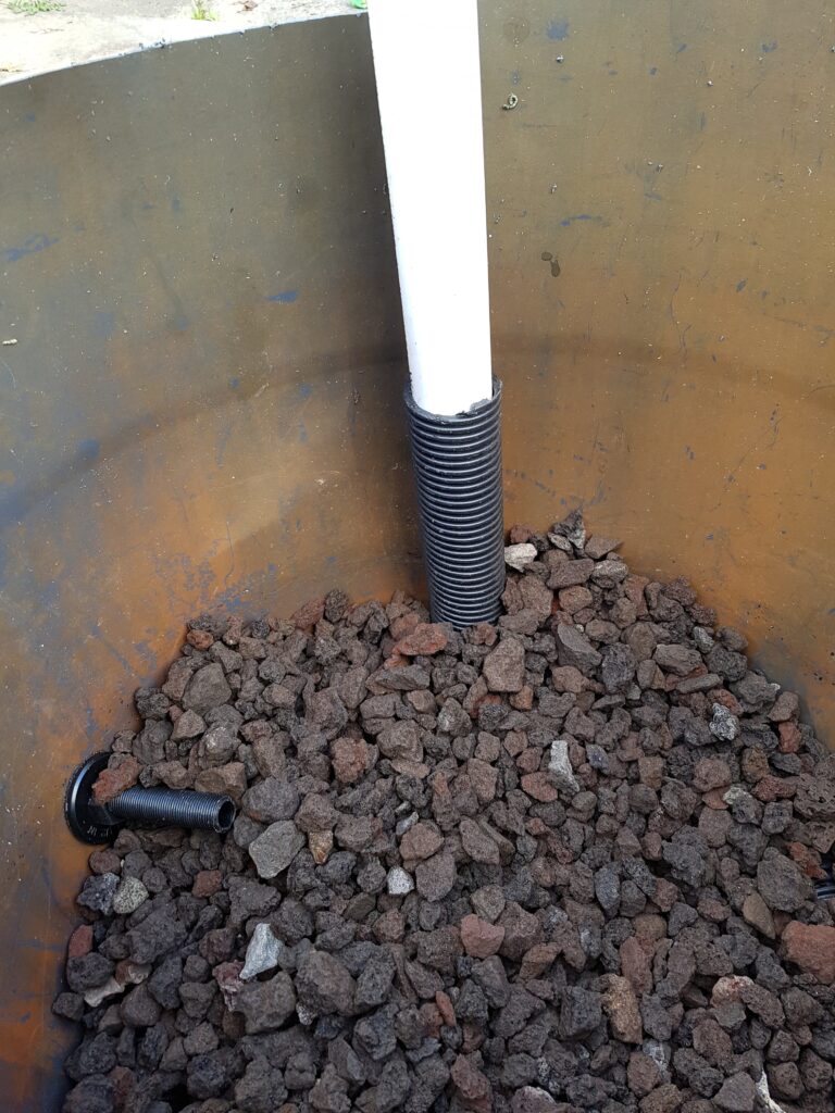 When you’re happy with the scoria levels in the barrel it’s crunch time – time to add the water! You can use the hose to pour it down the PVC pipe if you like, or just fill the barrel through the stones. No biggie either way – just make sure that the scoria is level and barely covered by water.