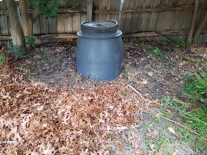 Oh – and the other half of the barrel? That’s now happily full of leaves I harvested from the surrounding streets and some food scraps. Instant compost bin – yay!