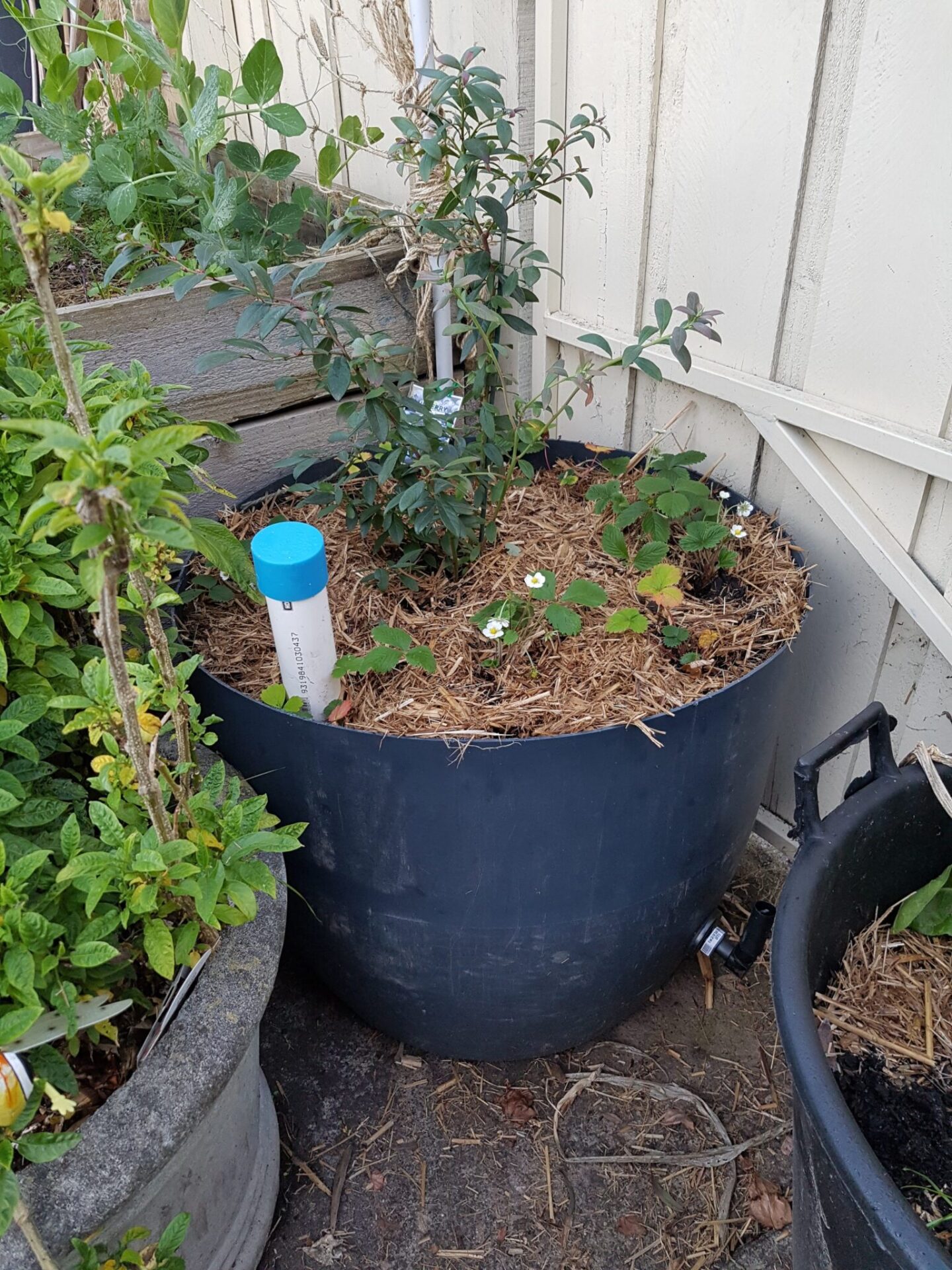 This finished barrel below has a deciduous blueberry bush in it. They say can grow to 2m, so I’ve got it in a nice sunny spot. The concrete will act as a heat bank and will add to the overall warmth that the barrel will enjoy. I’ve also added some pine needles that I got from a local park instead of pea-straw as I’e read that they provide the blueberry bush root system with an environment that significantly improves fruit production. And that sounds good to me!
