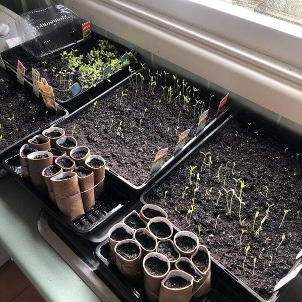 Larger seeds like zucchini, cucumber and pumpkin can be planted in toilet rolls with one end tucked in, or you can make your own little pots from newspaper. Make sure to group them tightly (a rubber band or some string can help) otherwise they topple over and dry out. Smaller seeds like lettuce and herbs can be planted in egg-cartons.