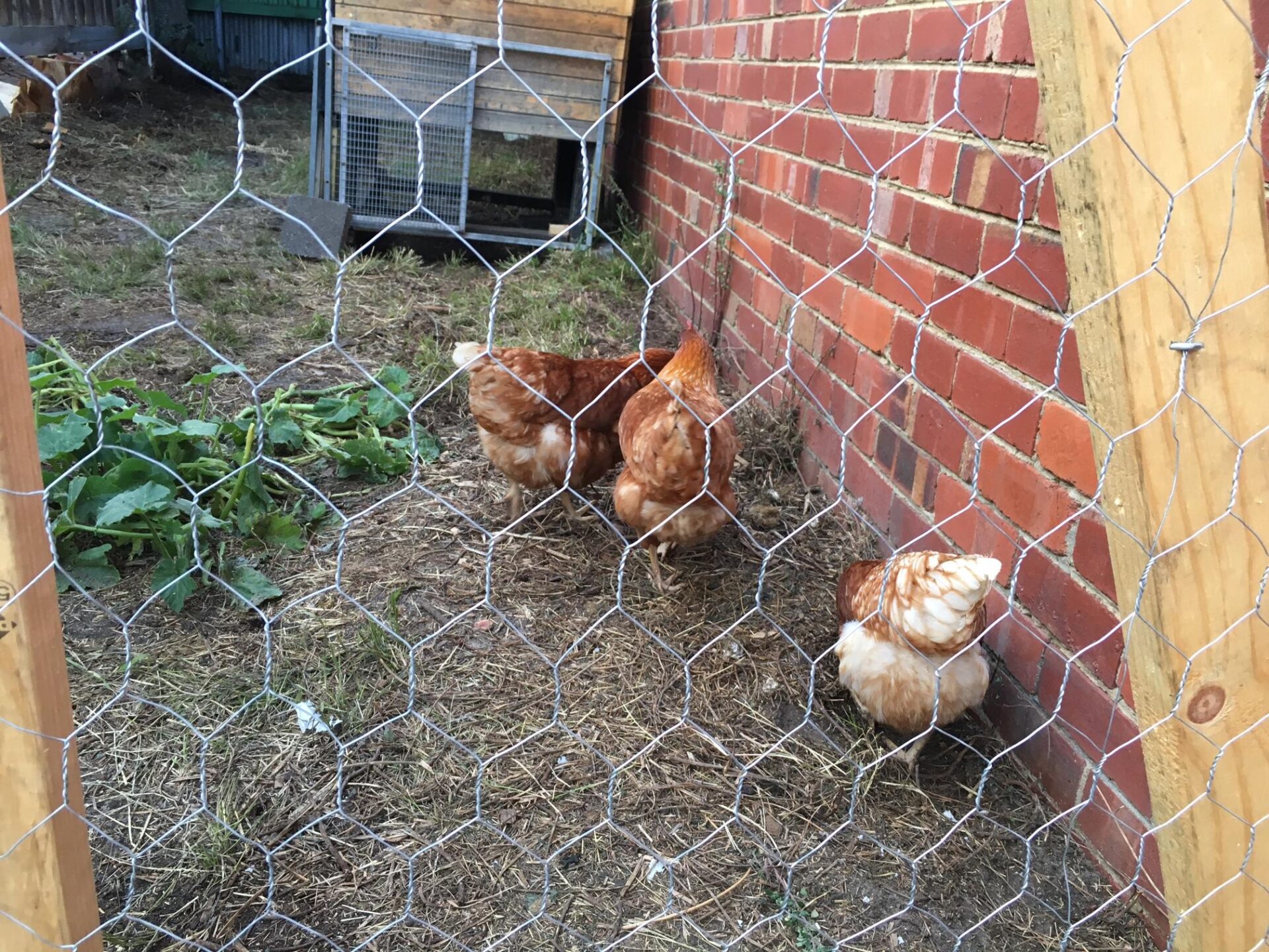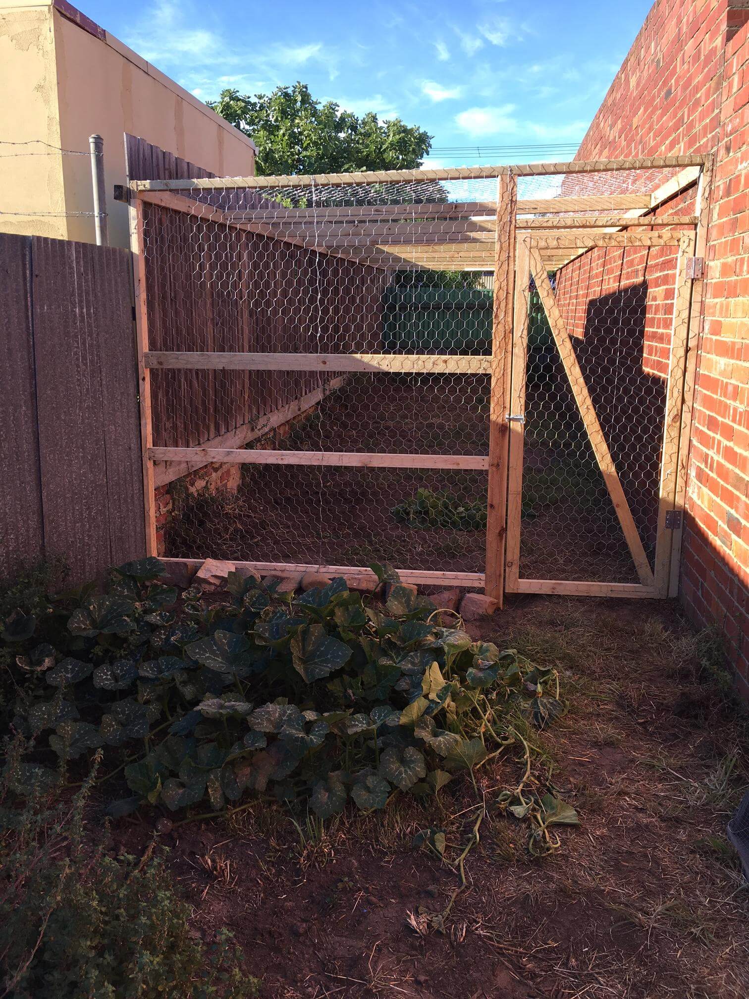 We’ve constructed a chook run 3×10 meters between the garage and the fence and have totally enclosed the area.