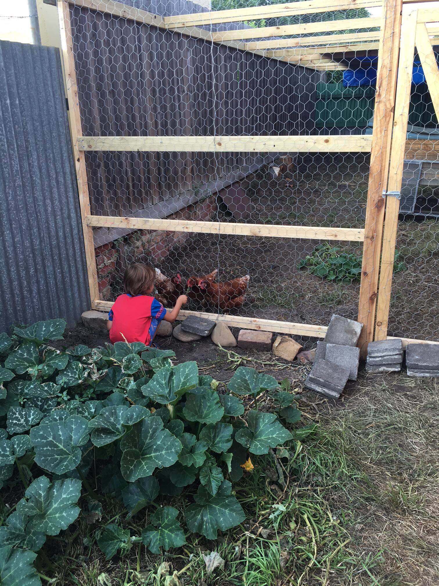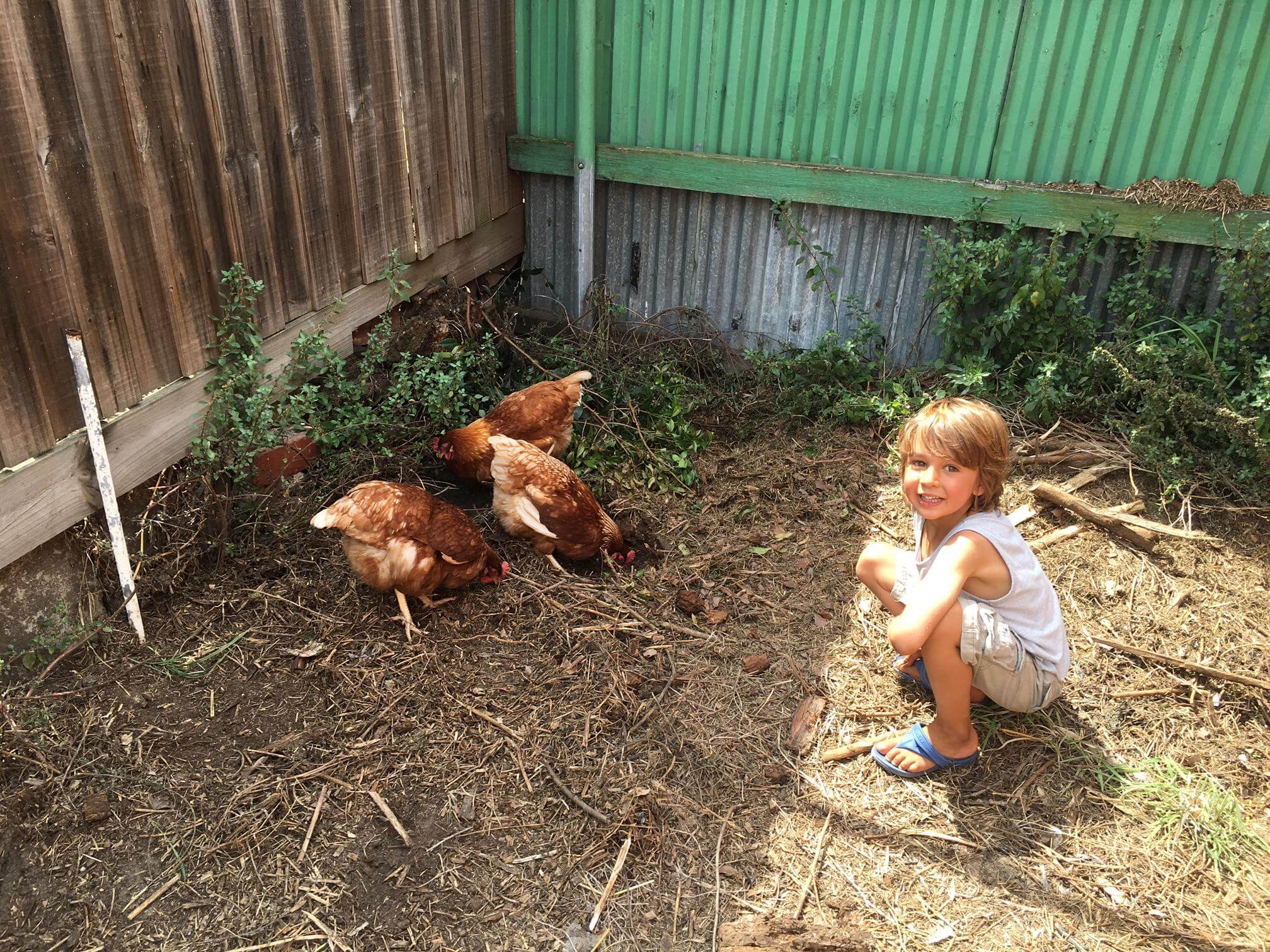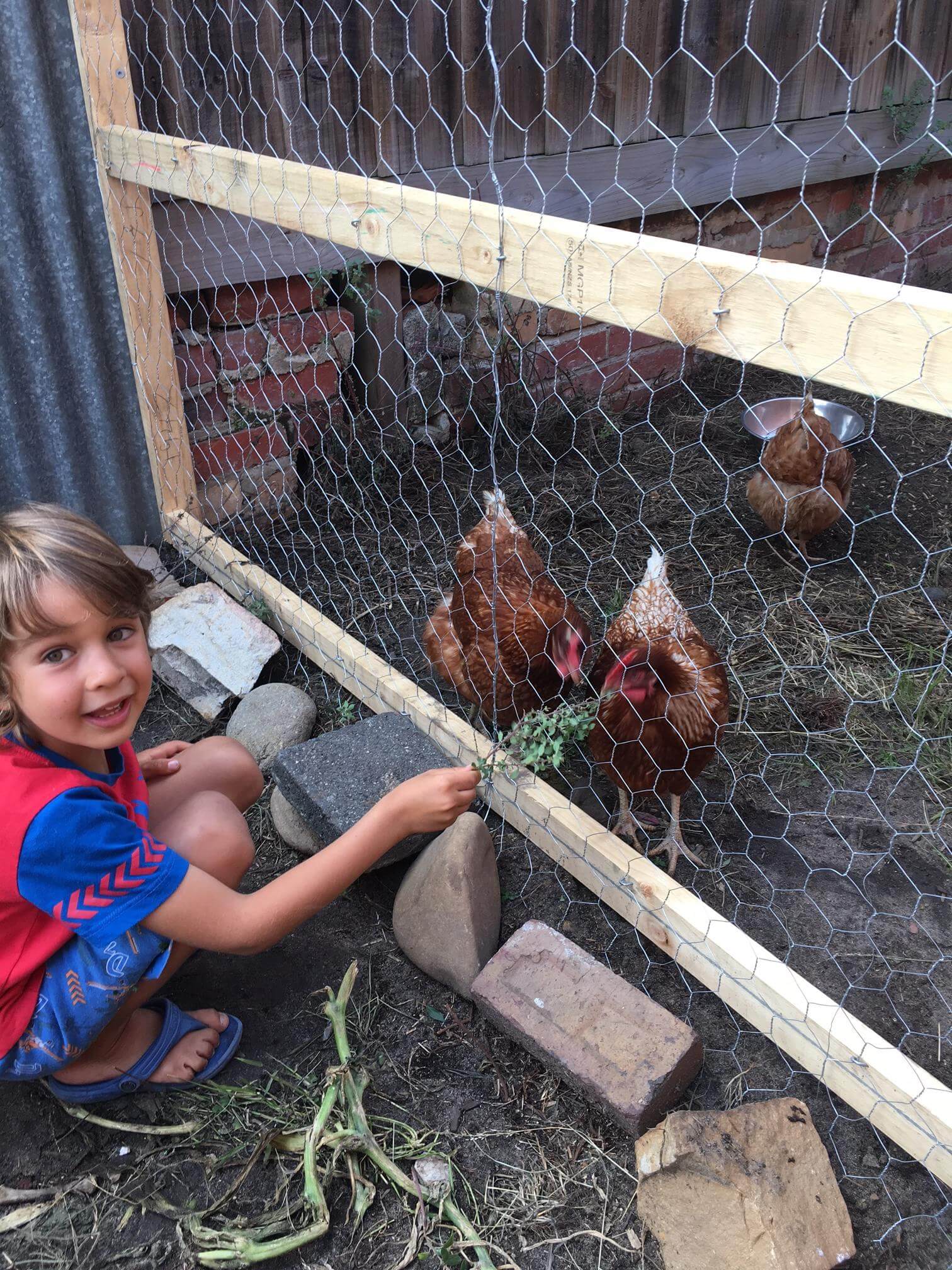 Permablitz recently put the call out to re-house Val’s much loved chooks – Val was moving, and couldn’t take the girls with her. There was an overwhelming response with over 70 people putting their hands up with promises of a loving home, but alas – there could only be one! Paul has re-housed the chickens in his backyard in Bentleigh – and it looks like his son is pretty excited by the new arrivals!