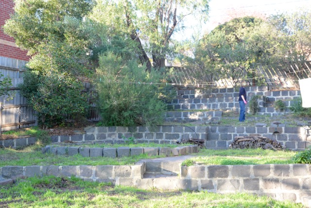 - Don’t have any good garden shots out back except of bluestone walls, most of the permablitz activity was in the front yard.