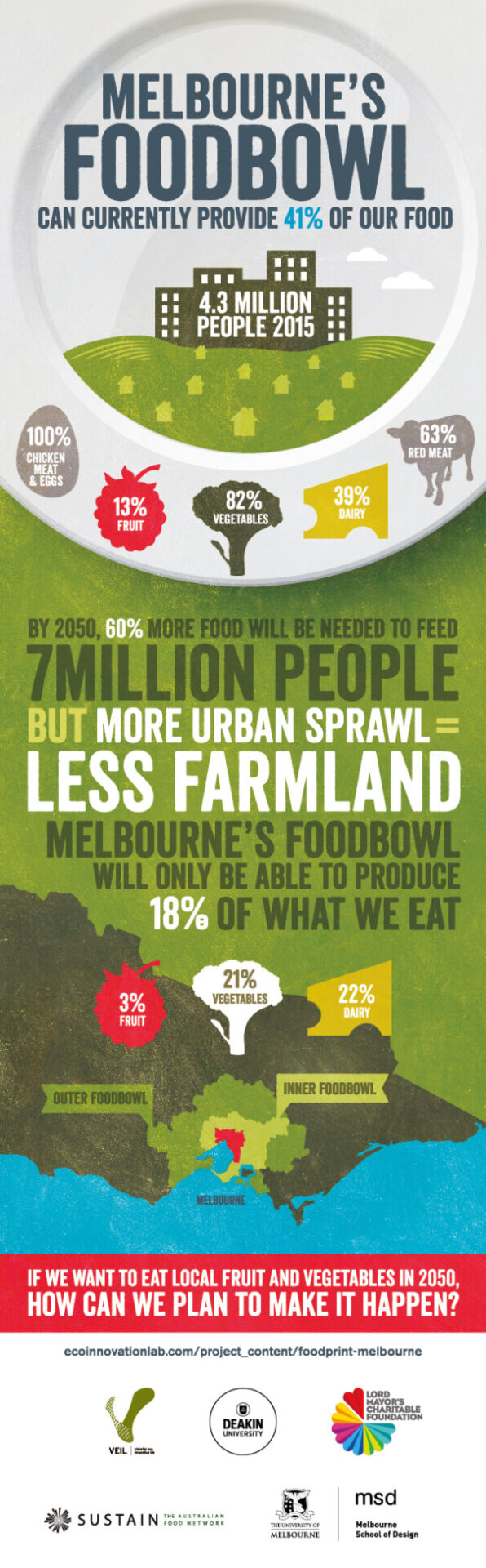 The Foodprint Melbourne project has released its first infographic on Melbourne’s foodbowl, highlighting the potential threat to supplies of fresh, locally grown fruit and vegetables as Melbourne grows to 7 million people by 2050.