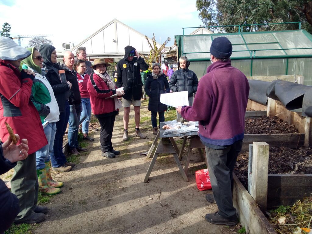 After lunch Richard ran a hot compost workshop using the community garden’s awesome system. The public can drop off their scraps and see them transform in a progression of bins into beautiful rich compost which is then used in the gardens. This was a perfect demonstration and a range of samples from different points of the process helped us understand the process and how to replicate it at home.