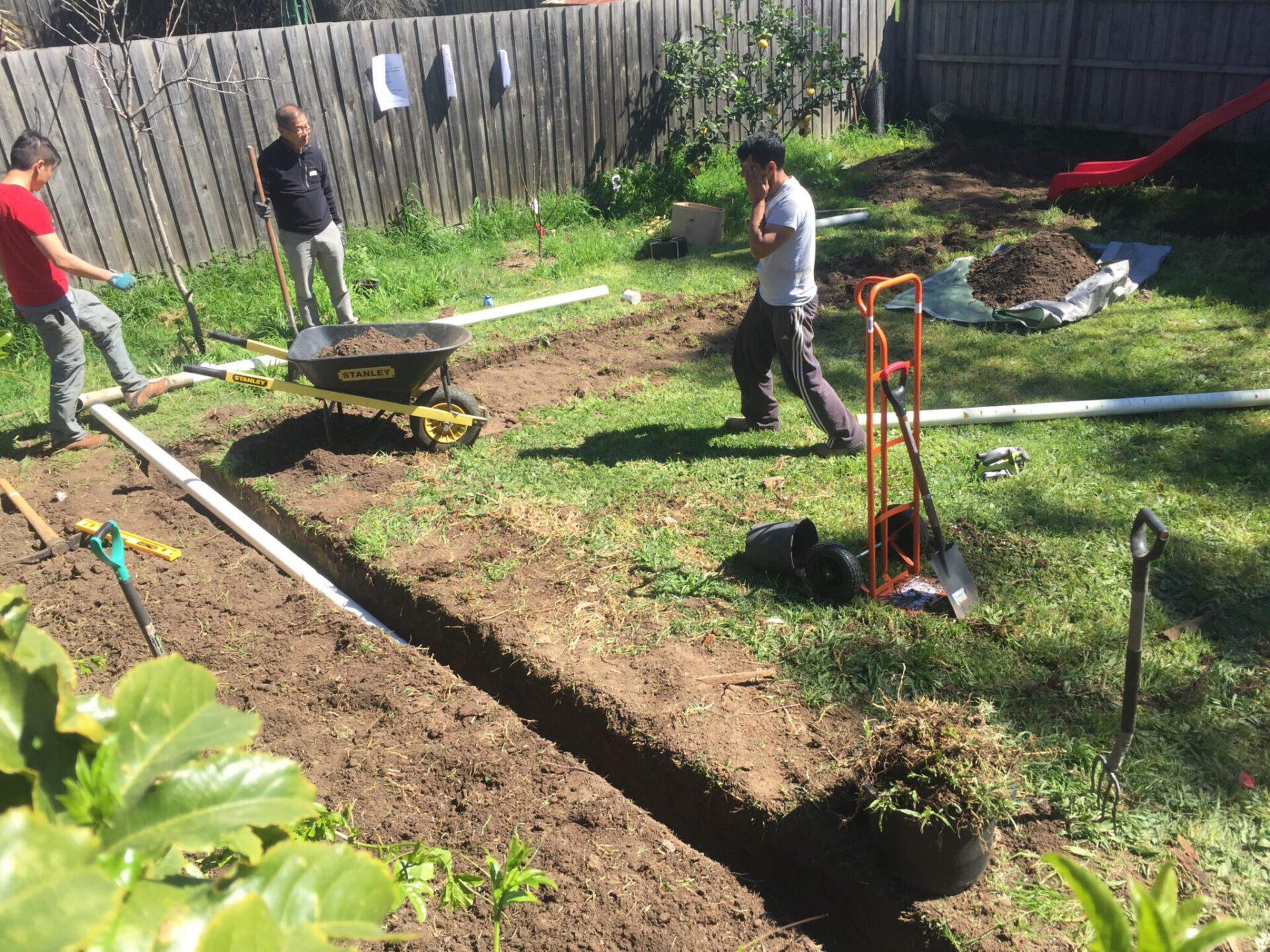 The day kicked off with the most arduous of tasks – couch grass removal! The volunteers worked long and hard to clear a patch in the yard for veggie beds and a path, and as the day went on their tenacity never faltered.