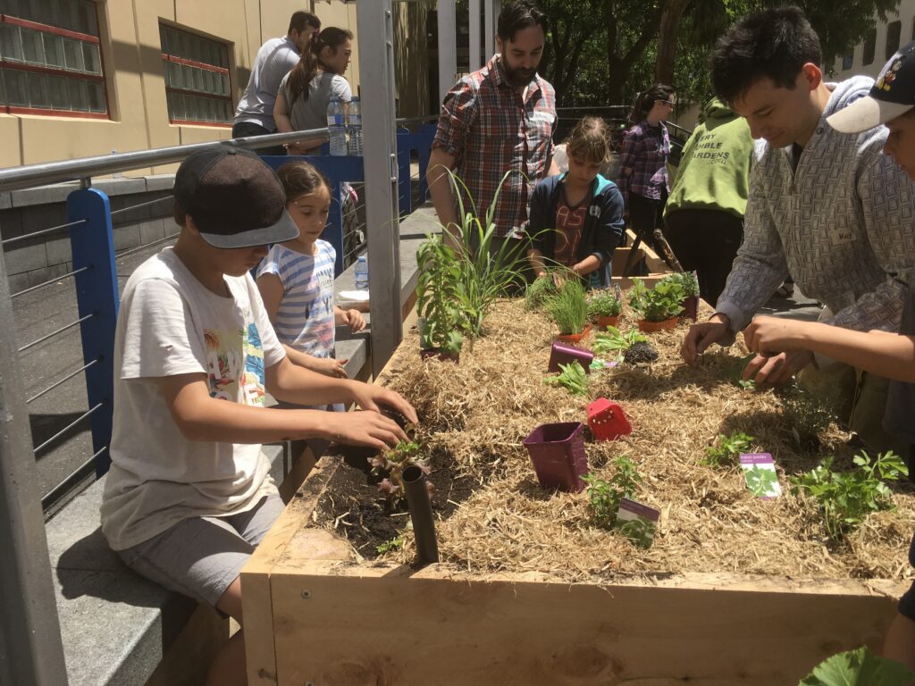 Before long it was time to plant the beds out with seedlings of herbs, veggies and plants that bring in the beneficial insects. Once again Jeremy led the charge, showing the kids how to plant out a bed (“big ones up the back, small ones in front!”) as well as offering best punnet-splitting techniques.