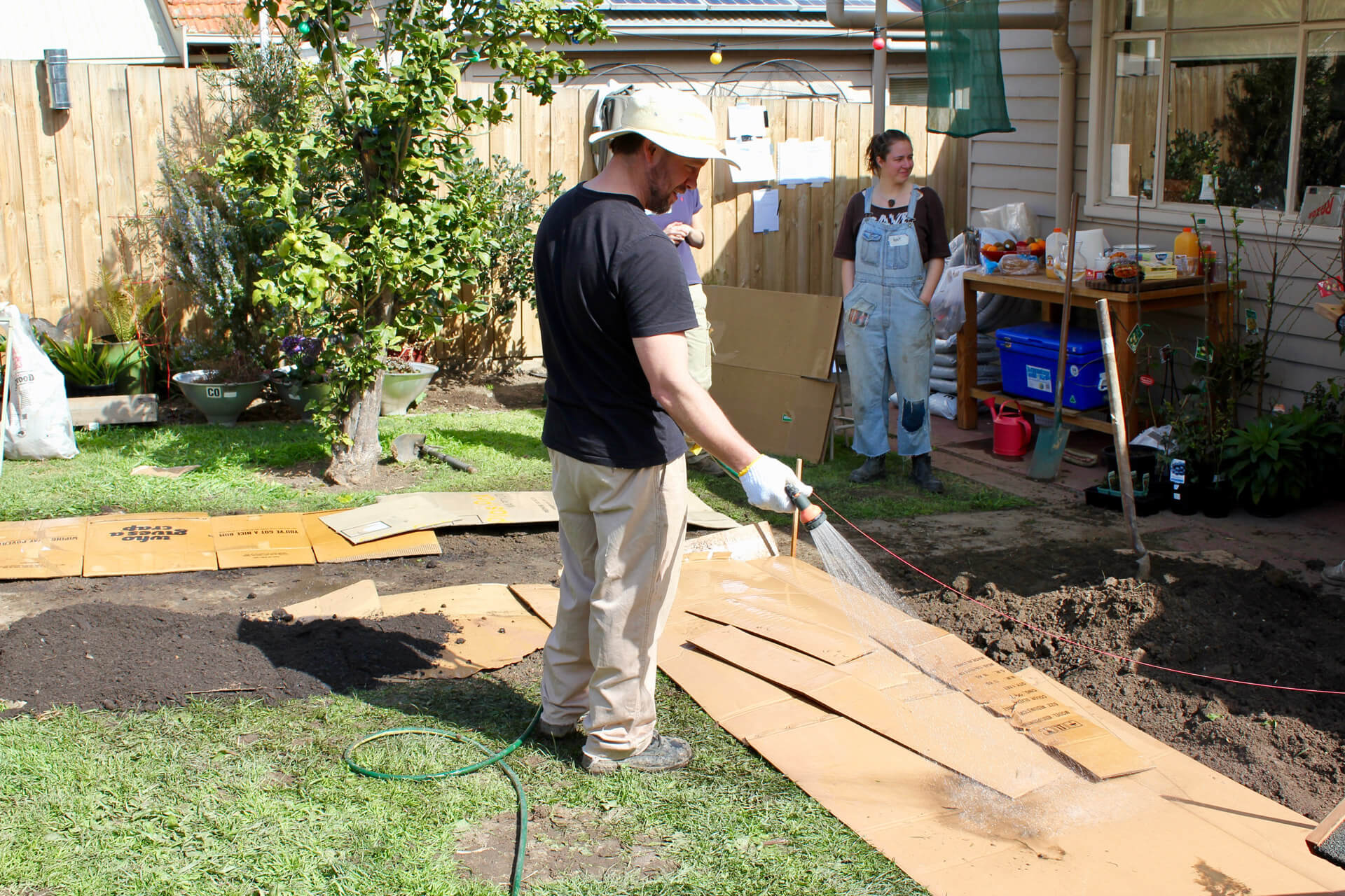 On a less smelly note, Anne has also tried steaming the troublesome grass and while it does kill the top part of the grass and makes it easier to remove, it will not kill the underground runners. At this blitz one of the tasks was to install two garden wings to make Sandy’s view from her writer’s den more pleasant. Leaving a lot of lawn for her dog to play, the issue of preventing kikuyu from re-entering the garden beds had to be solved. The design team decided to put cardboard along the edge and in the bottom of the dug out beds, noting that Sandy will have to do some weeding in the future once the cardboard has broken down and the roots of the grass start to penetrate the garden beds.