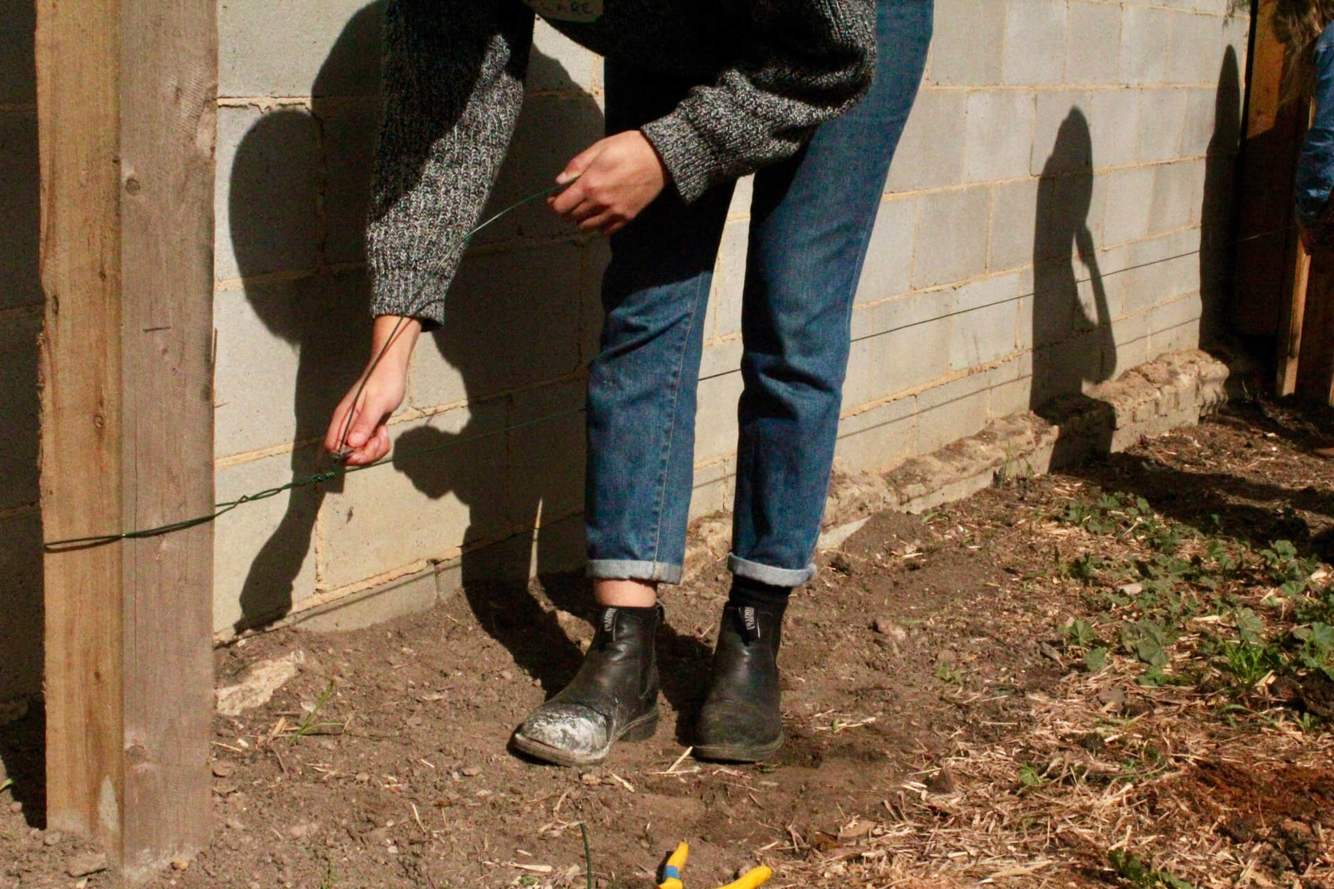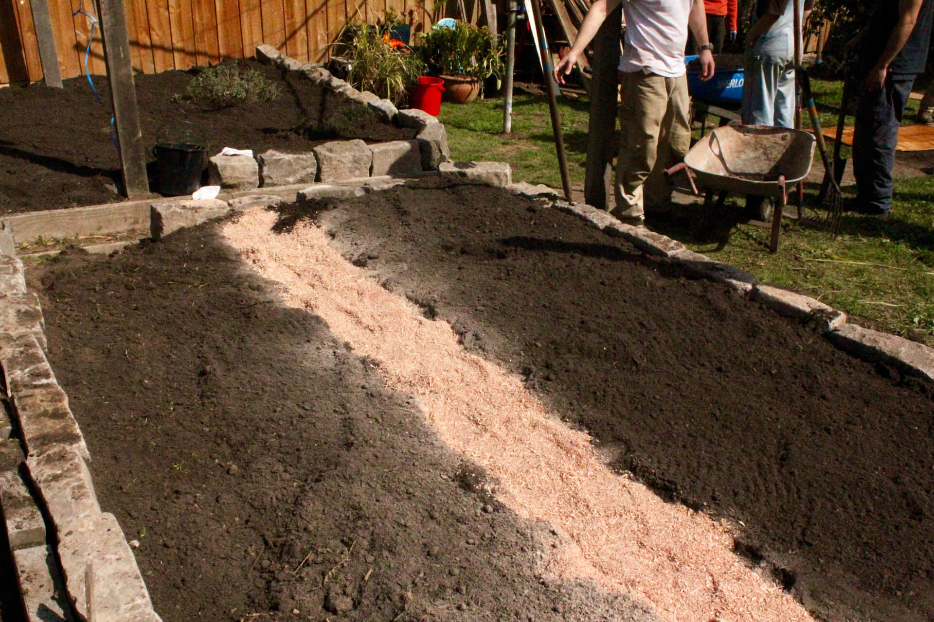 Terry held a great workshop on how to put in espaliers for fruit trees. This technique can be used to make the trees take up less space and to grow them close to a wall for thermal mass heating. The design team also cleverly created different rooms in the garden with the espalier as a living fence. Unfortunately there was a dear lesson learned during the day. Swinging mattocks and shovels around trellis wires is not such a good idea, but it has to be done if there is soil to be dug. Everyone was nodding in agreement when Terry pointed out that trellises should be put in after soil preparation…