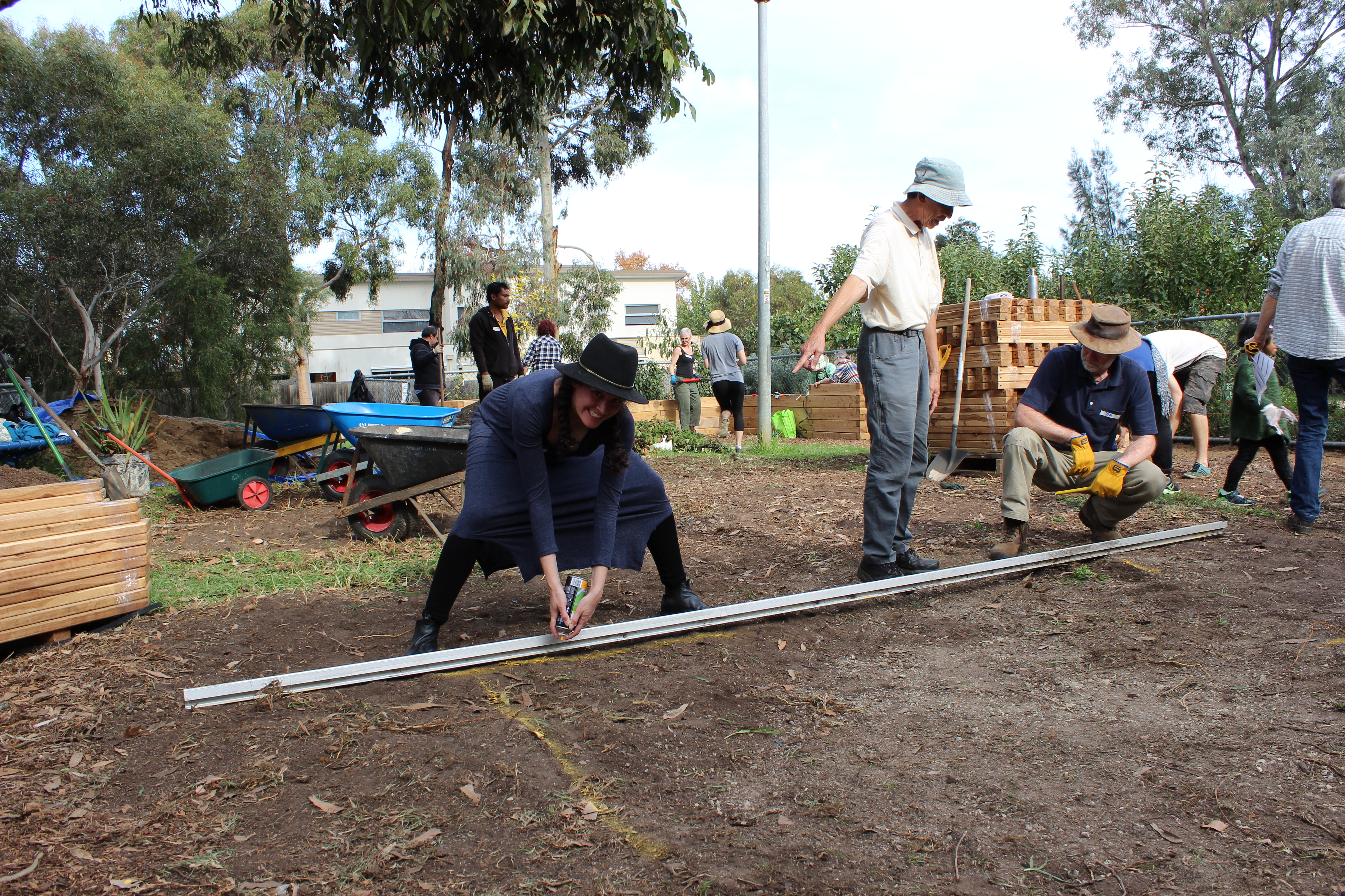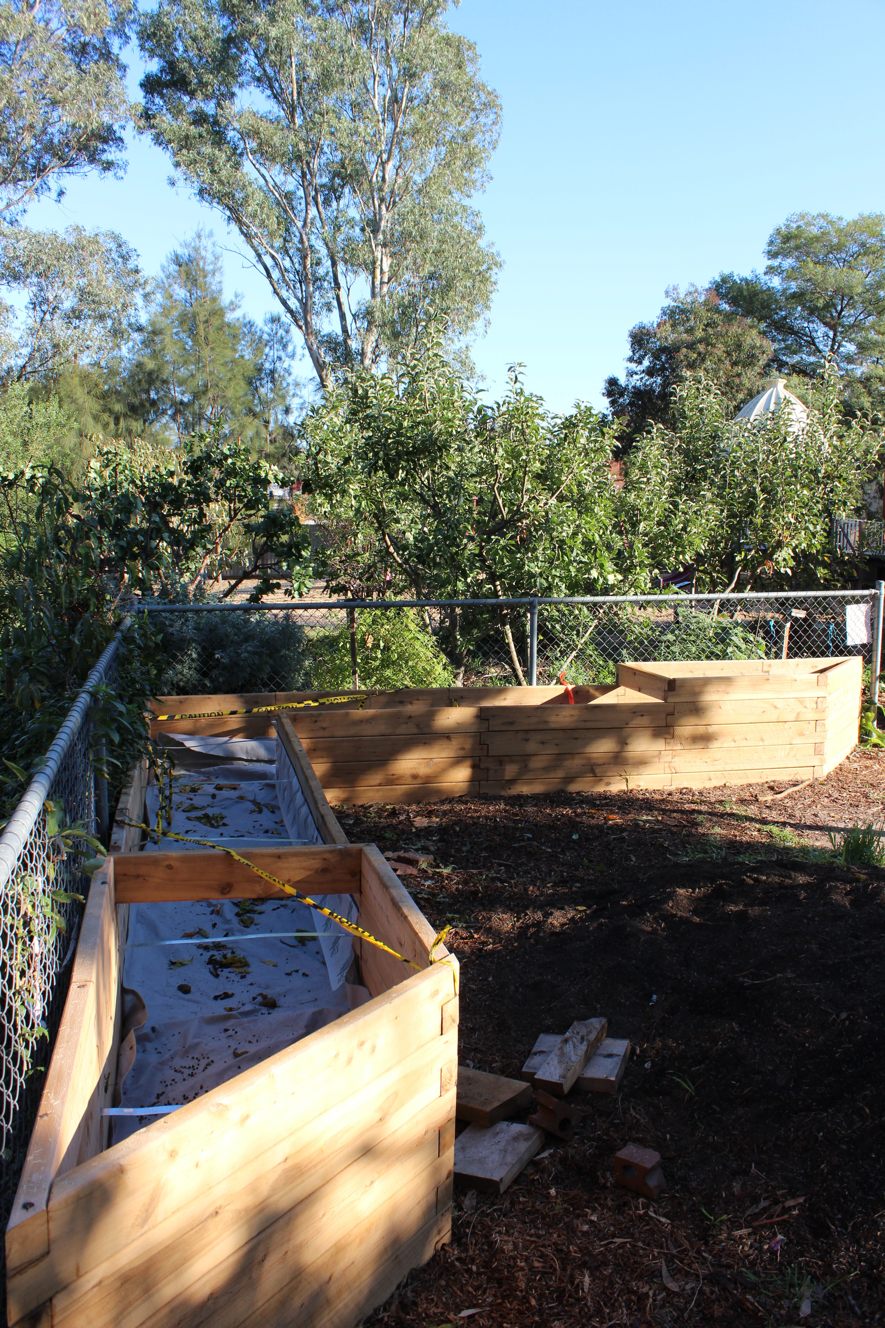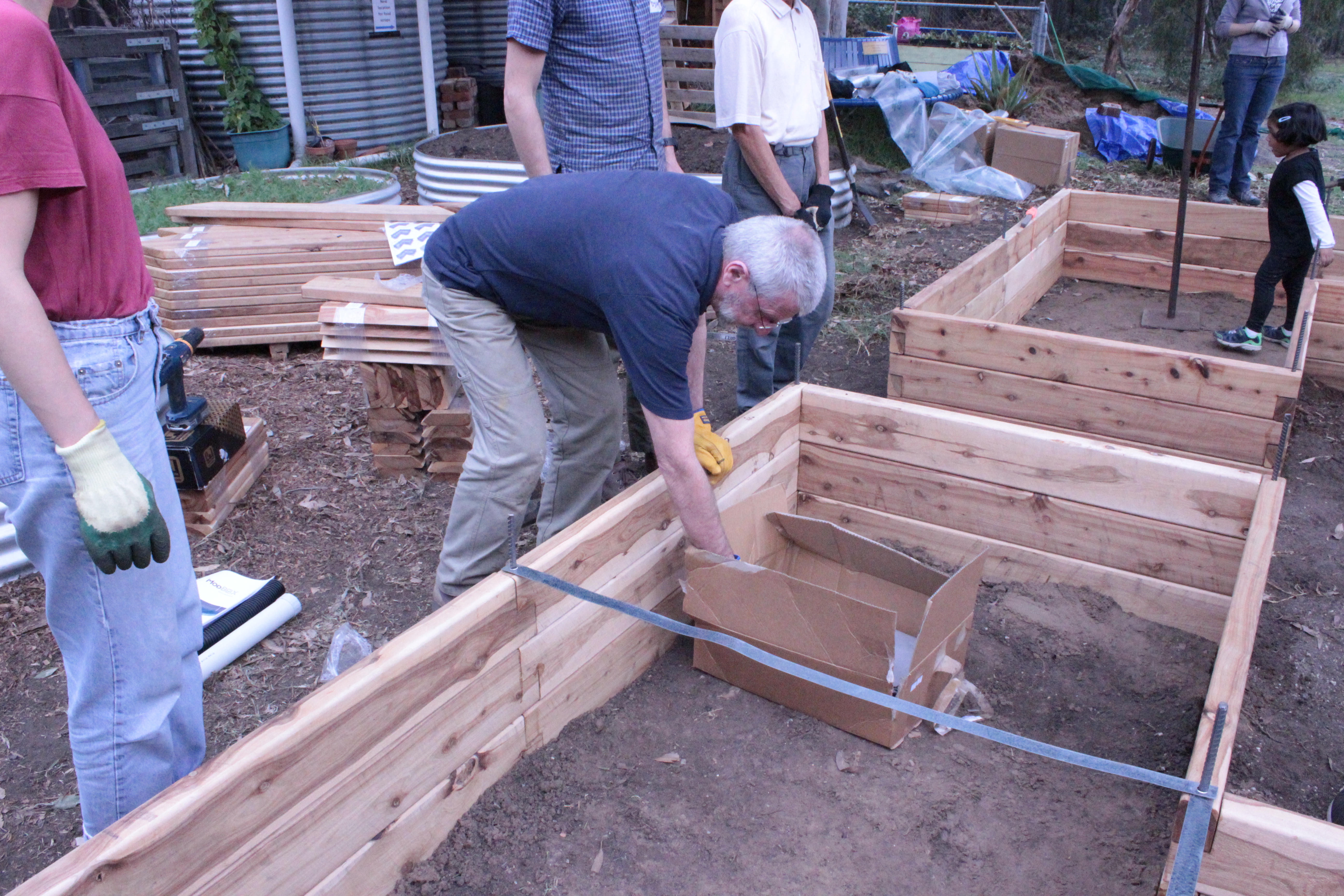 Finding solutions to site problems and sustainability are core considerations in a permaculture design process. Chatting with Jo of The Desert Echo, the author of the design plan for the blitz, I learned that the water uptake of the magnificent eucalypt towering up the centre of the site was one of the ‘problems’ needing to be solved. Other problems were the intensity of labour required for the watering roster over the summer months that could be difficult to sustain and ease of accessibility to the beds for the diverse community using them. The answer? Raised beds and Wicking Beds — of course!