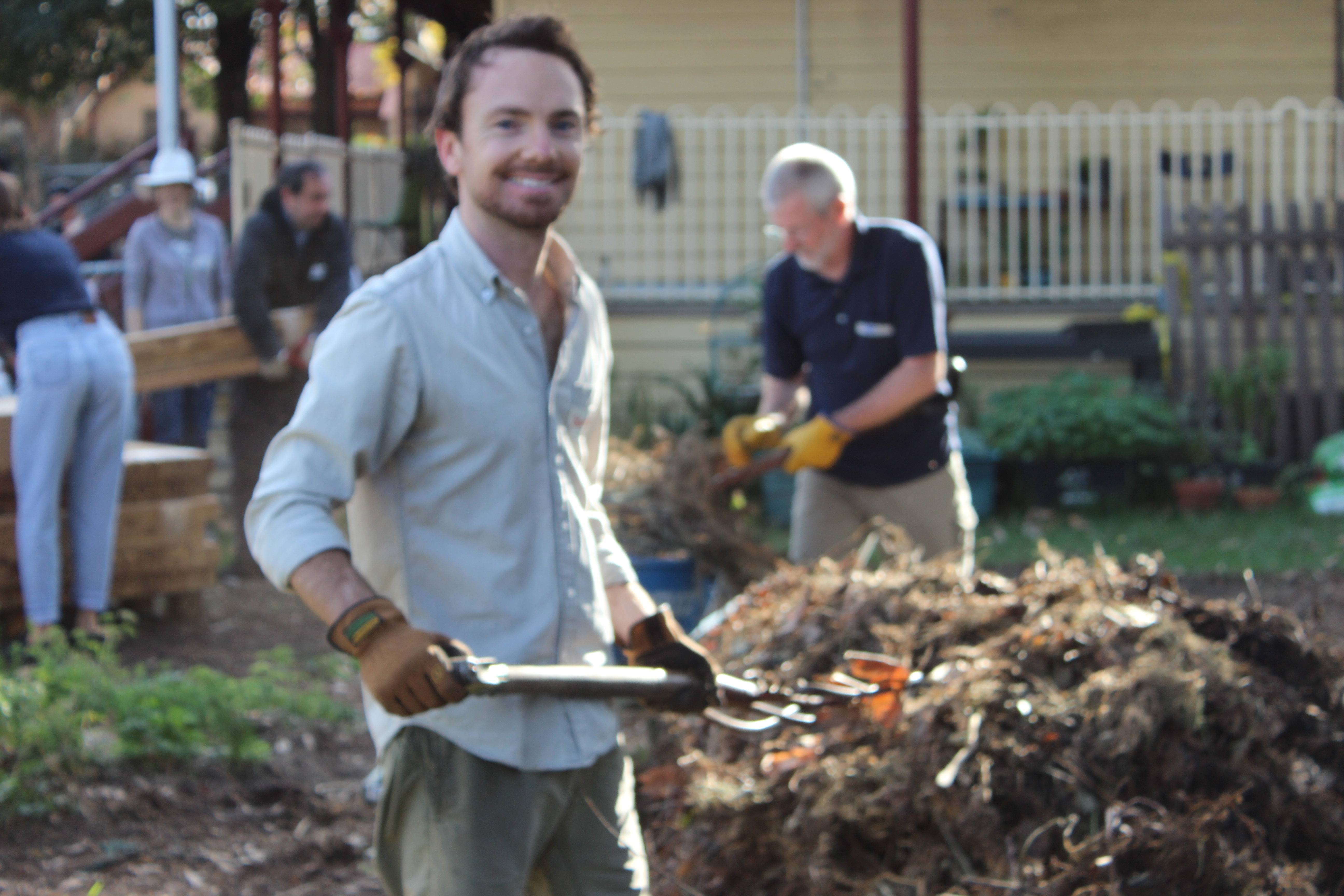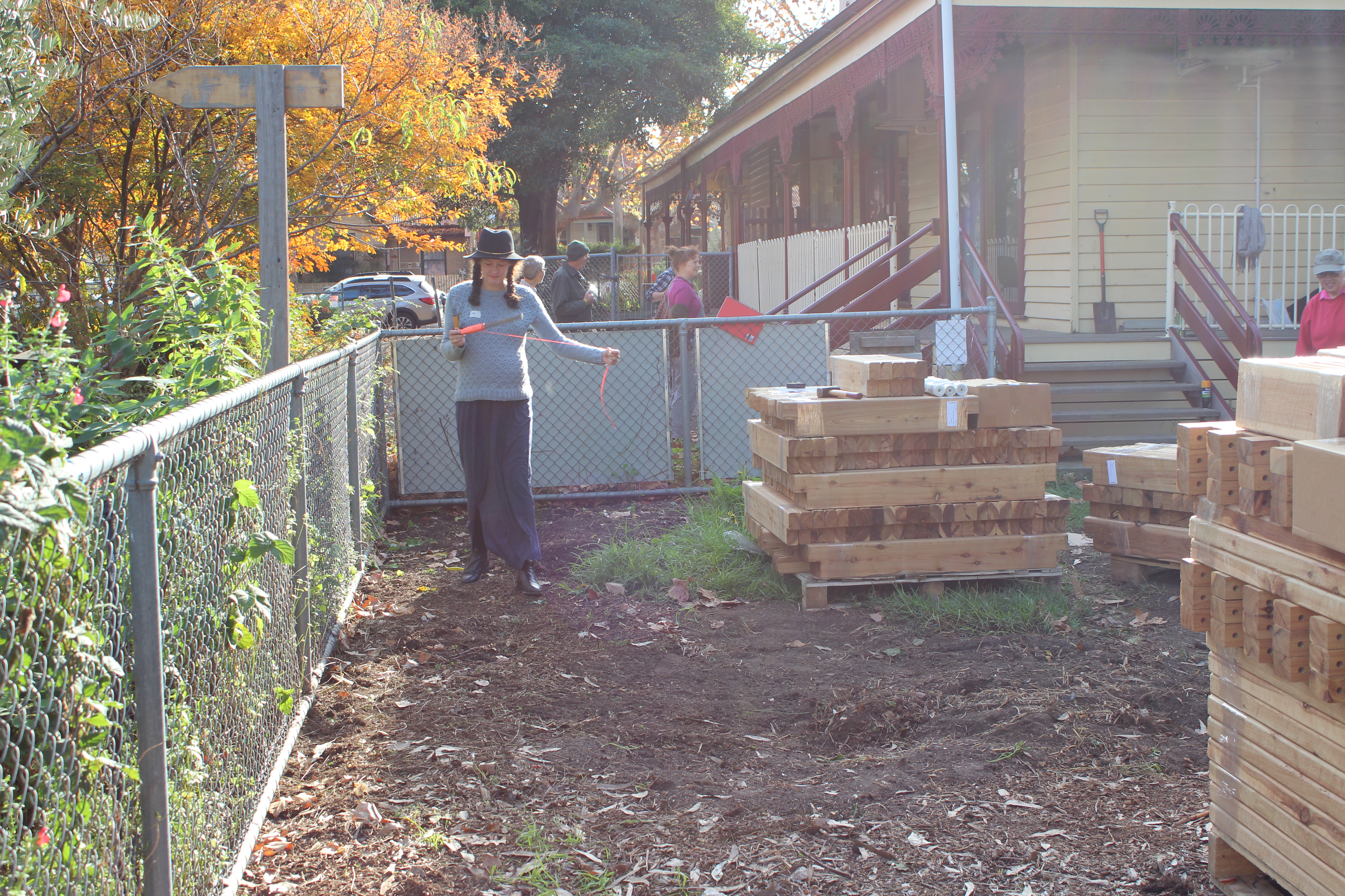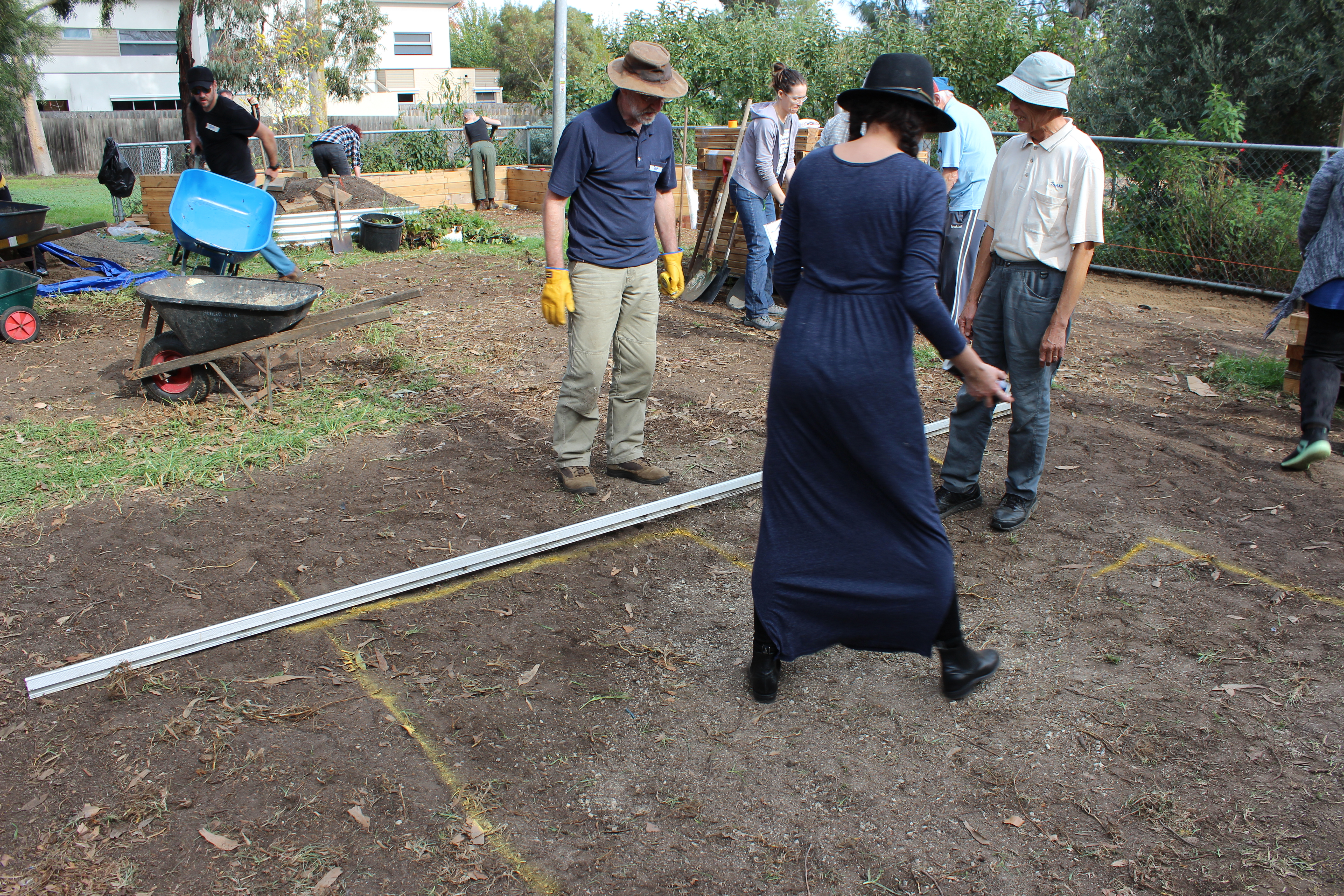 Finding solutions to site problems and sustainability are core considerations in a permaculture design process. Chatting with Jo of The Desert Echo, the author of the design plan for the blitz, I learned that the water uptake of the magnificent eucalypt towering up the centre of the site was one of the ‘problems’ needing to be solved. Other problems were the intensity of labour required for the watering roster over the summer months that could be difficult to sustain and ease of accessibility to the beds for the diverse community using them. The answer? Raised beds and Wicking Beds — of course!