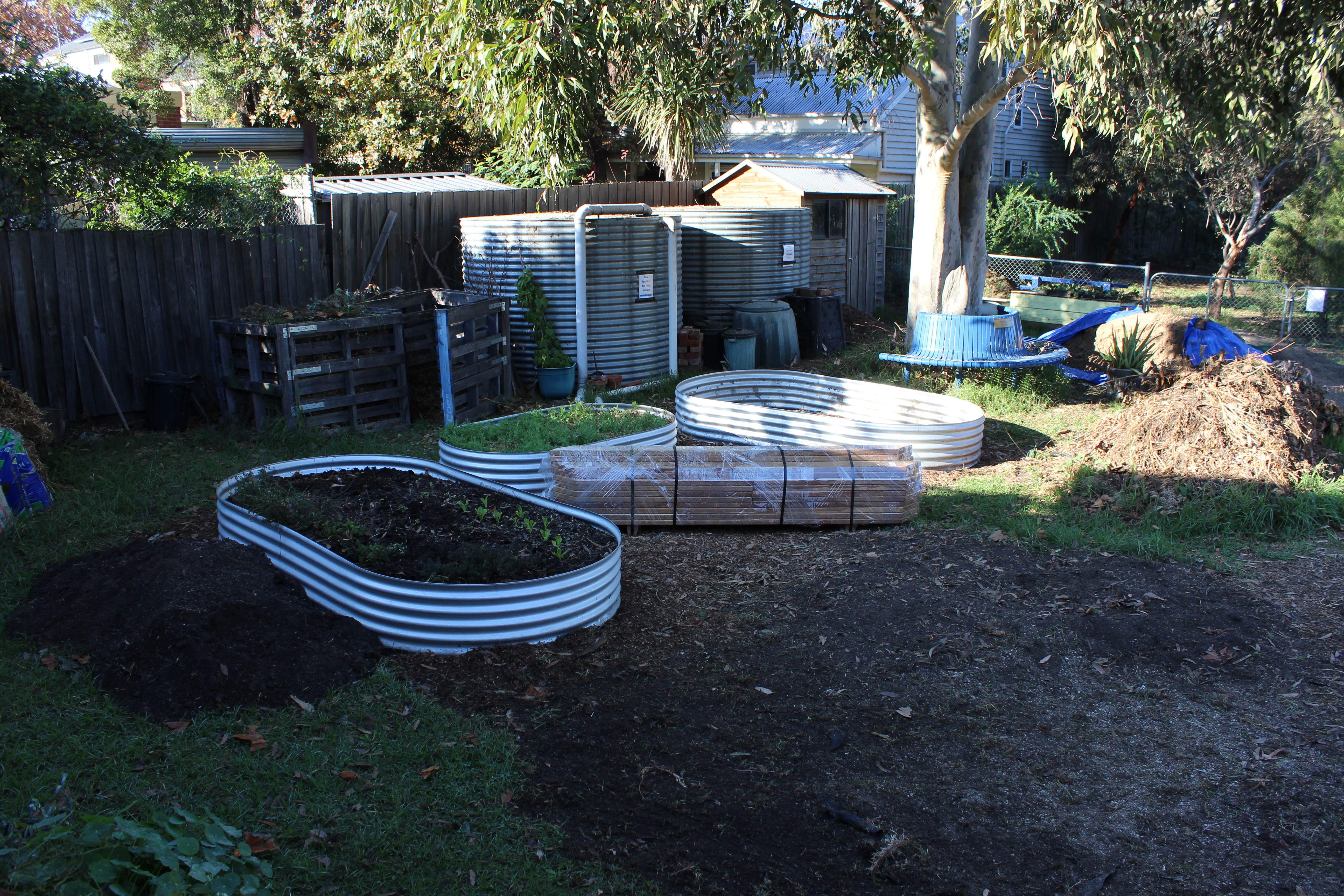 The raised beds—some of which will be watered by the existing drip irrigation and others by wicking—are built from a very nifty modular system called Modboxes. The raised beds around the perimeter will be watered by the existing drip irrigation (able to be set on a timer) reducing the labour required for watering and the wicking beds will also reduces labour as well as avoid the incursion of the eucalyptus on the available water for the intensive vege beds.
