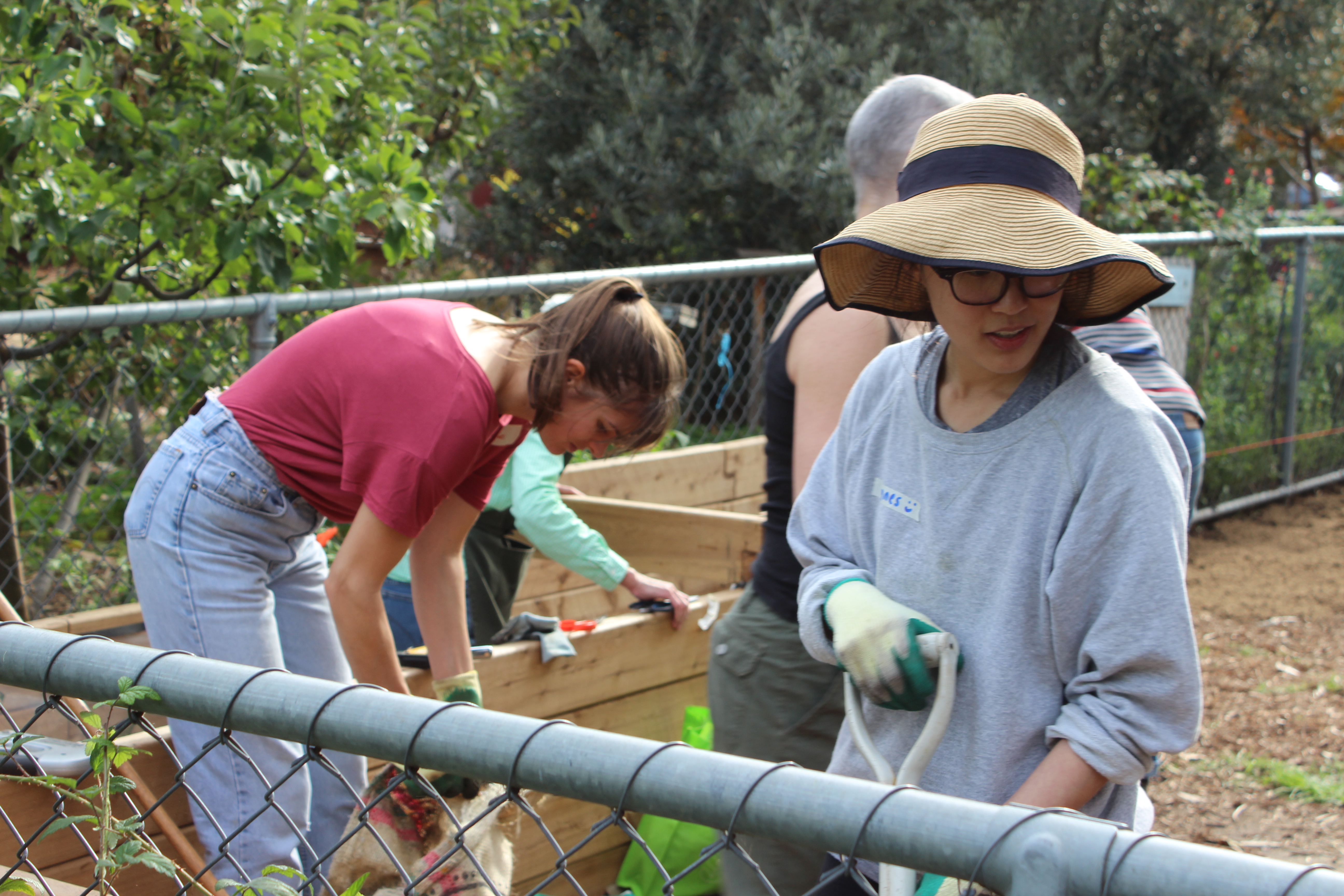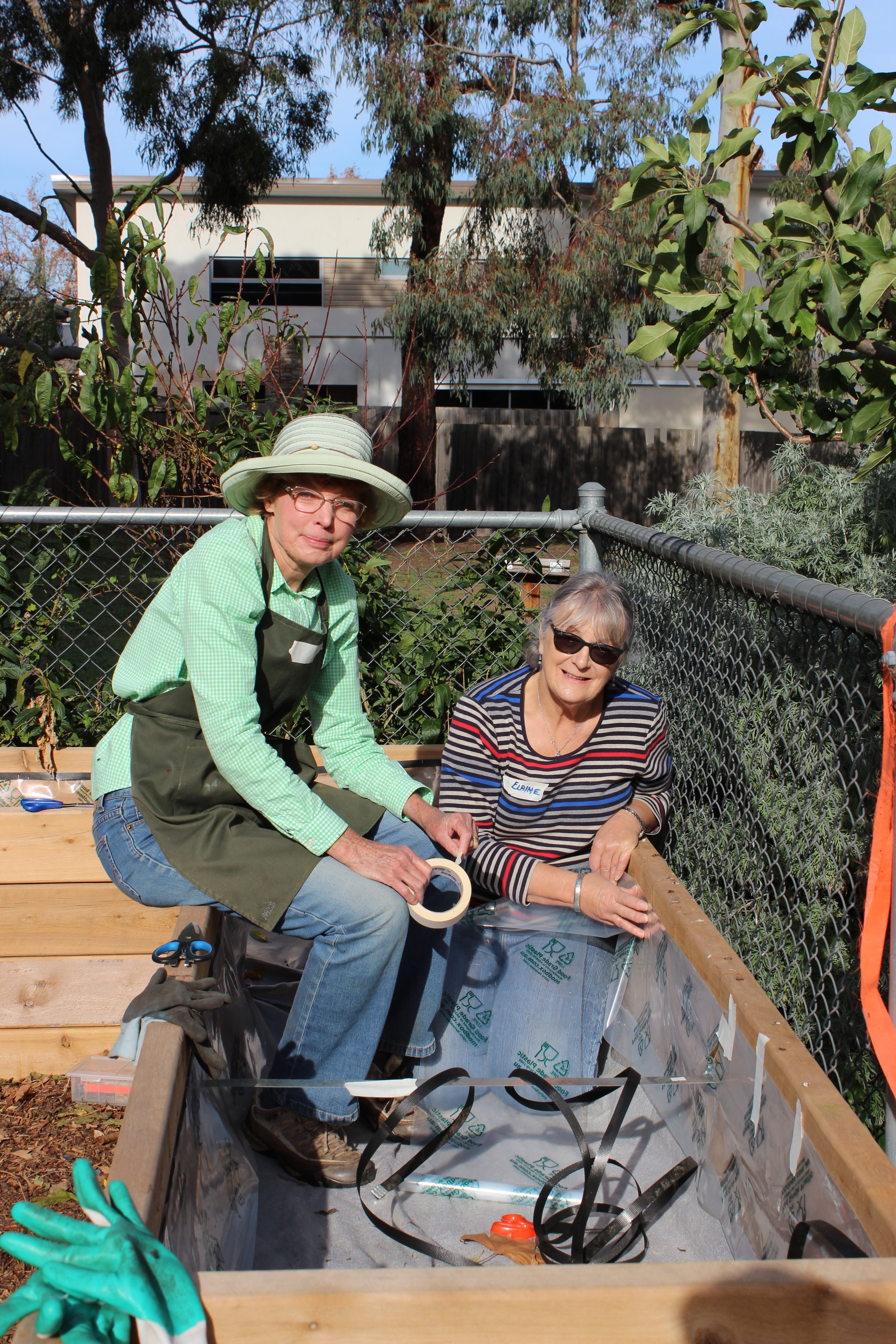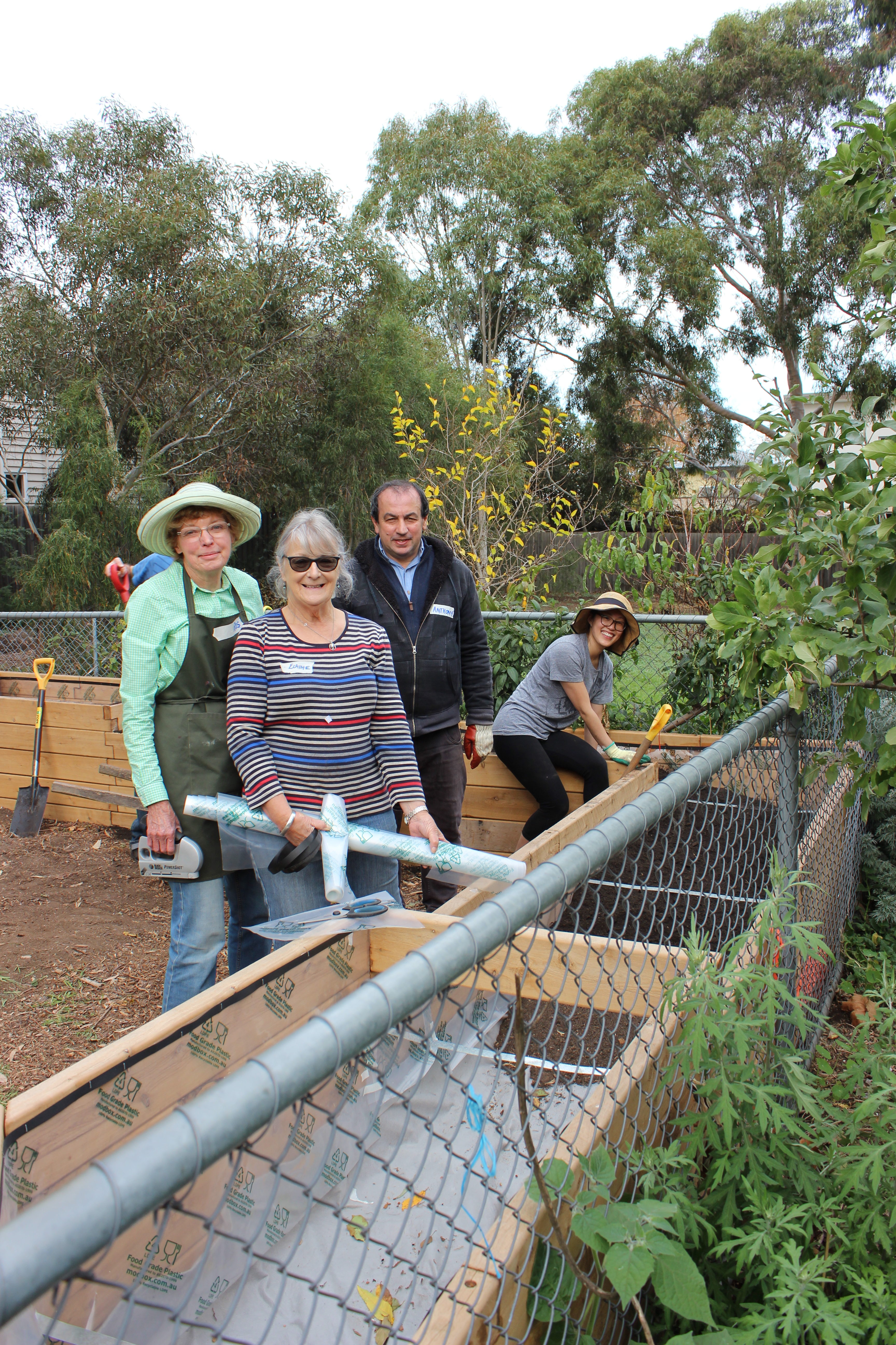 Some interested onlookers and Agnes and friend working on the attaching food grade plastic with a little help from Arissa and her mum, Sabrina. Loads of teamwork went into getting this bed ready for filling – some nice work by Ros, Elaine & Anthony.