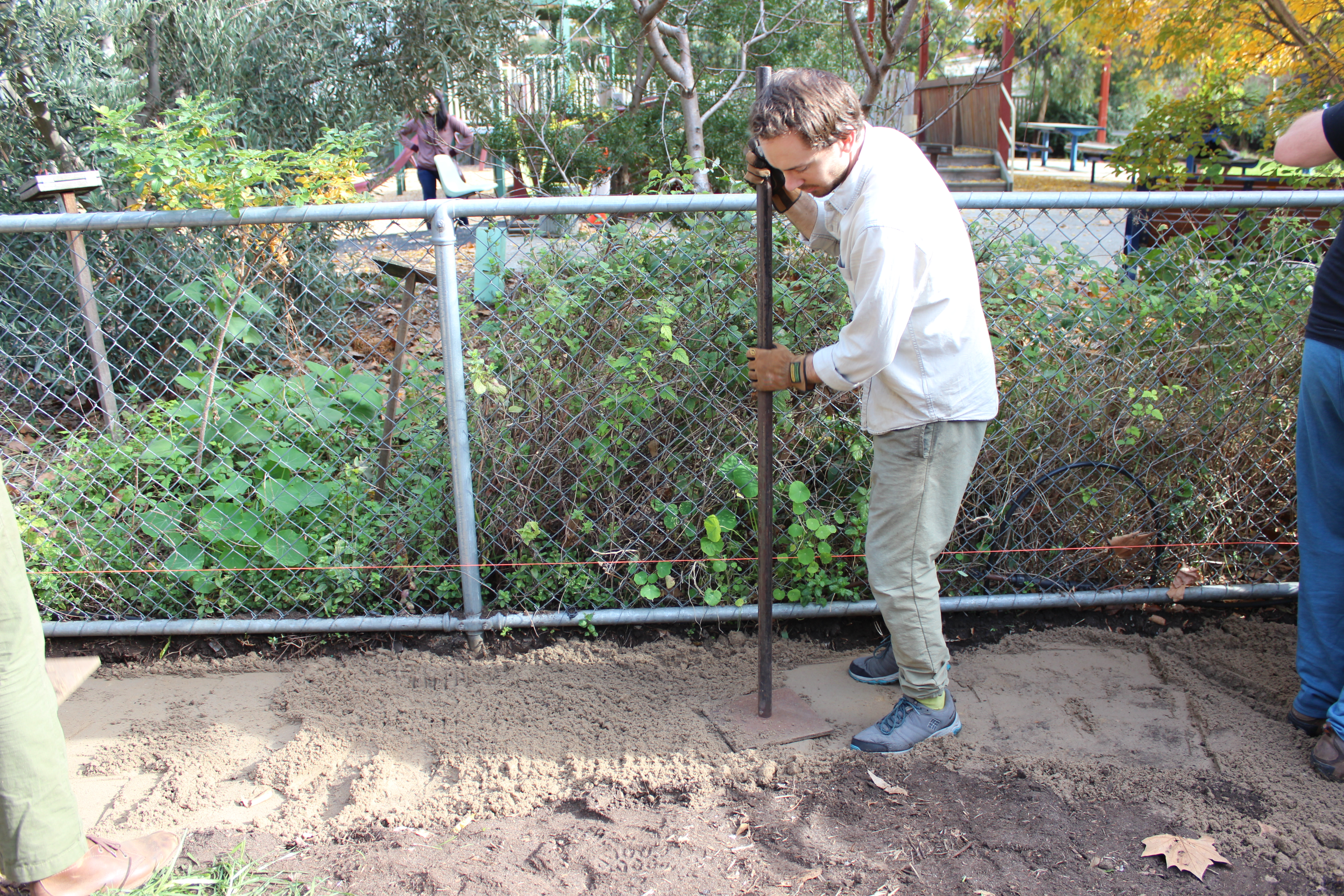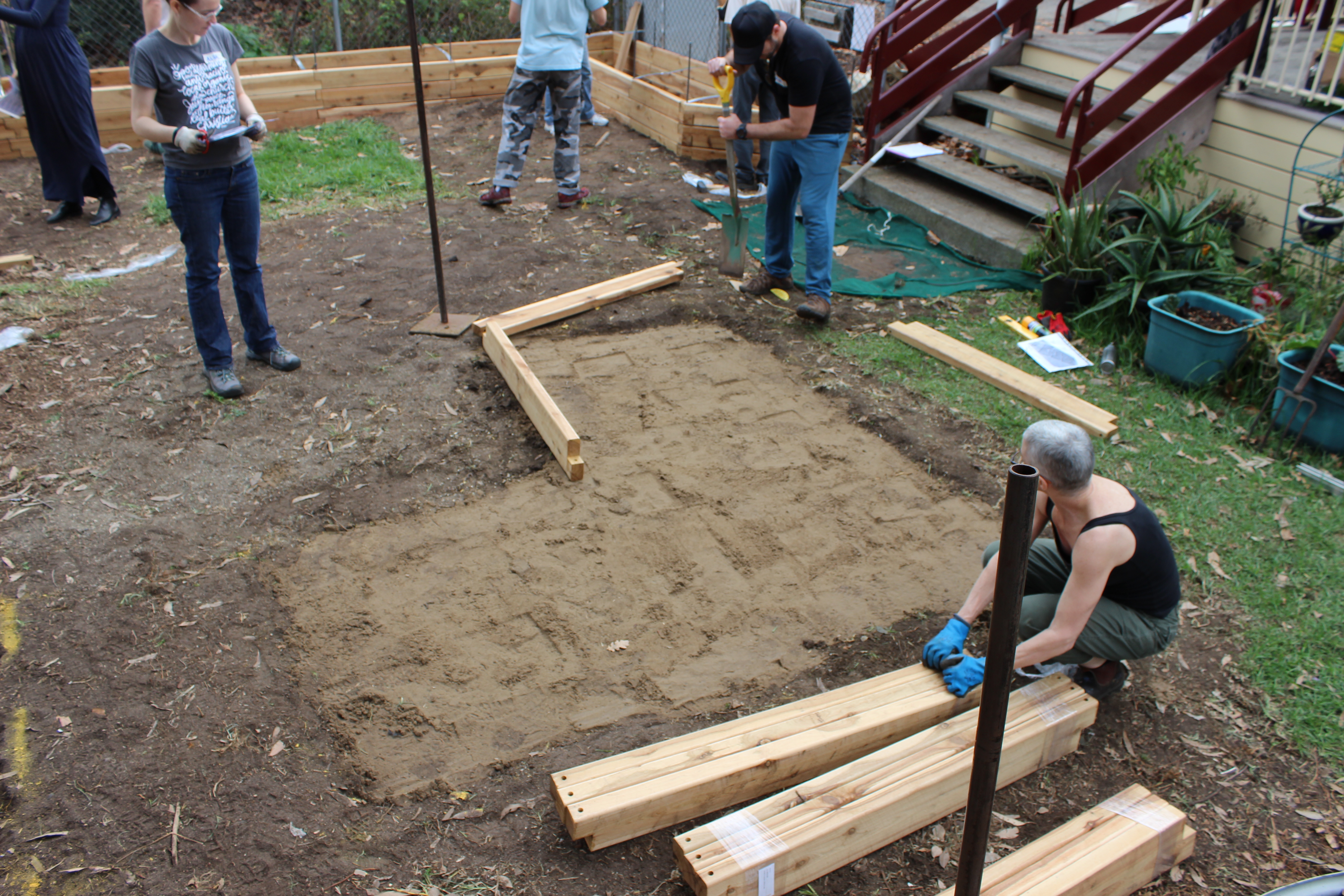 Dylan and Scott levelling the sand base out for the garden bed bases.