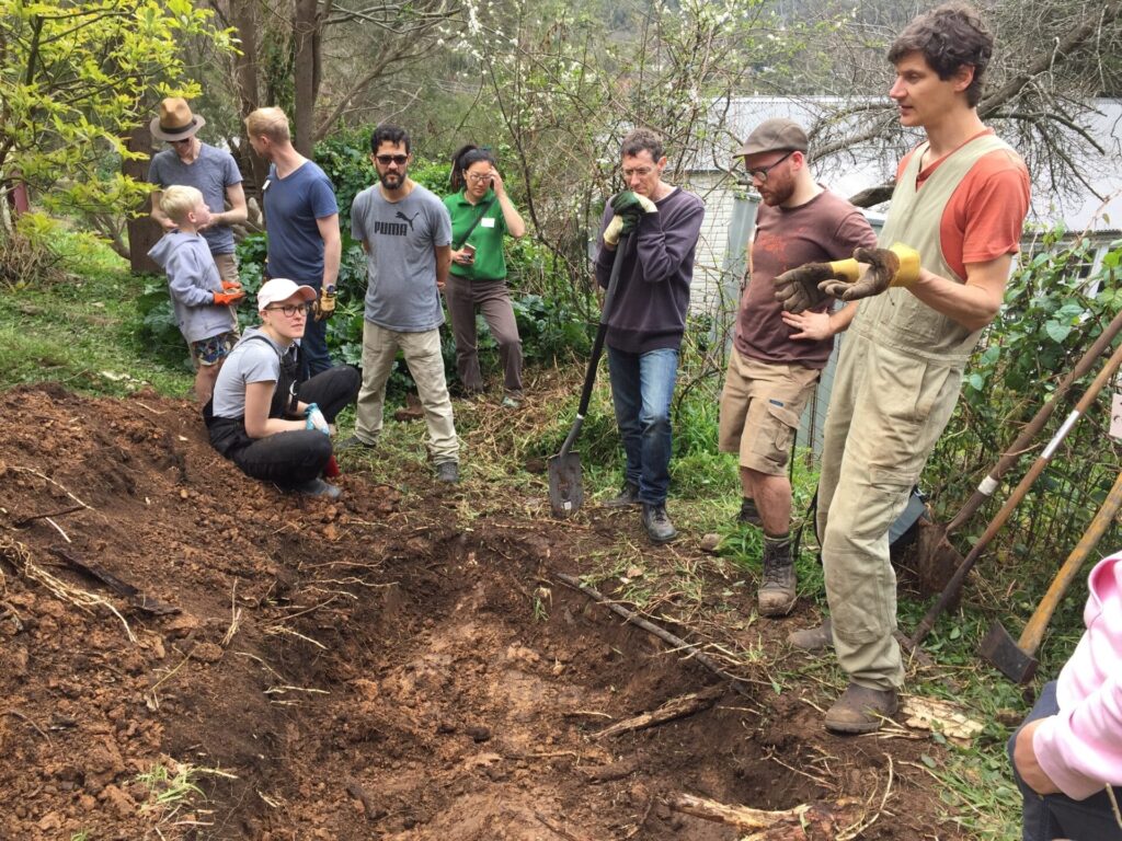 Another group dug a pit to start the hugel. By the end of the day it was filled with logs at the bottom, and smaller branches on top, and lots of mulch, weeds and soil to start the composting process. Hay was the top layer – some remarked that it looked like a haystack! Nonetheless, it will very slowly decompose into wonderful, rich soil. For now though, the warmth generated by the decomposition means that Ros can plant seedlings a little earlier than she could straight into the bare earth; nitrogen fixing plants work especially well here.