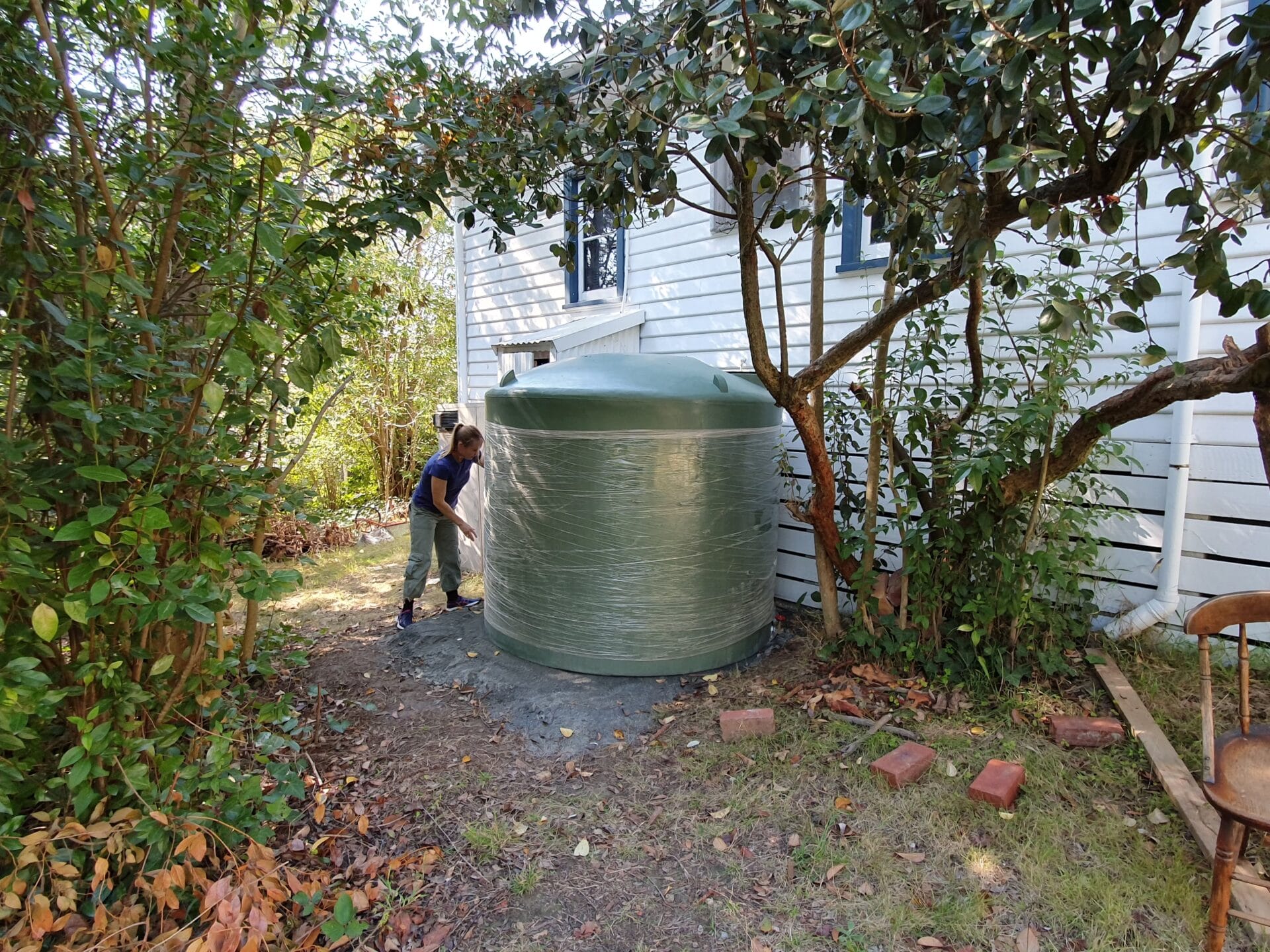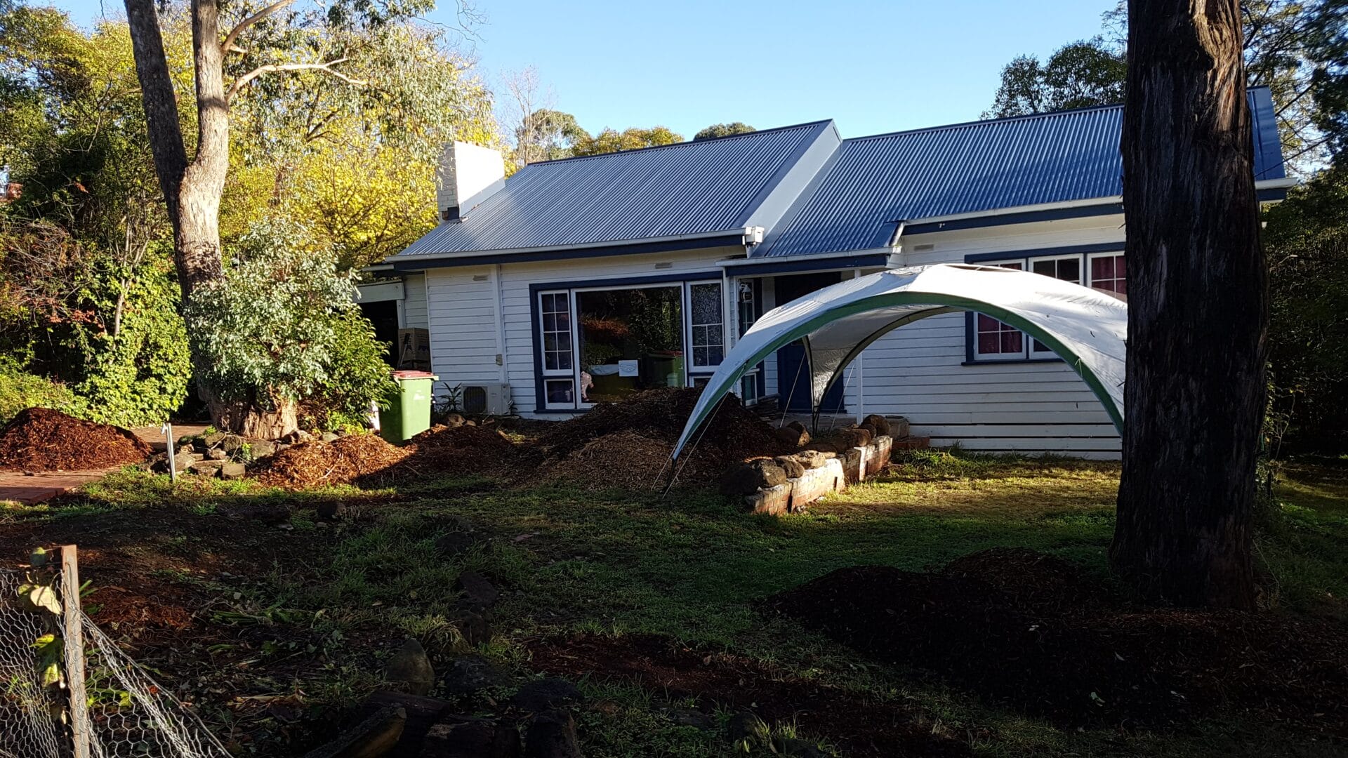 Kirri & Phi had been prepping for 6-8 weeks before the big day. Some of the prep work included the removal of numerous giant weed trees from the front yard (view from the street is pictured below), installing the water tank, sourcing all of the rabbit poo manure, mulch, wood chips, native plants, fence posts… I’m exhausted just writing about it!