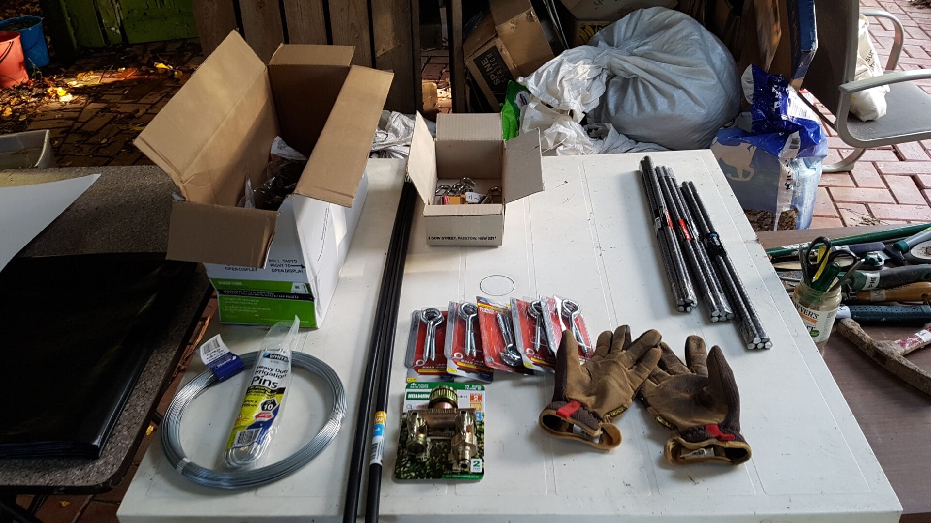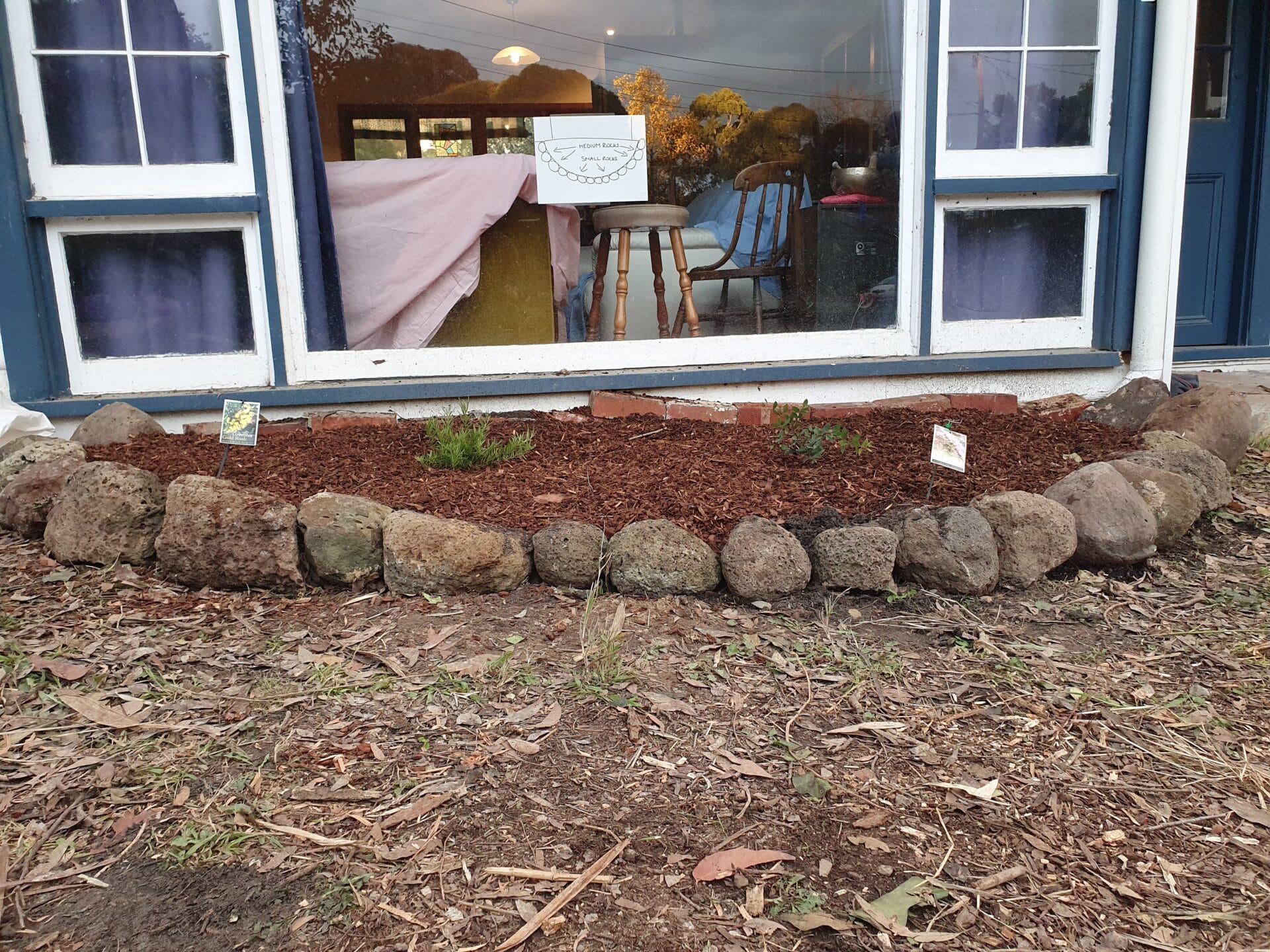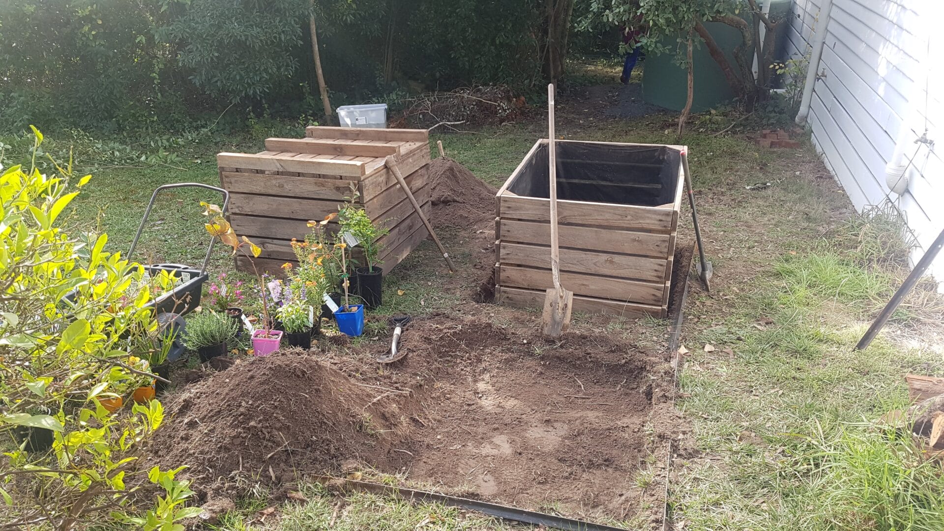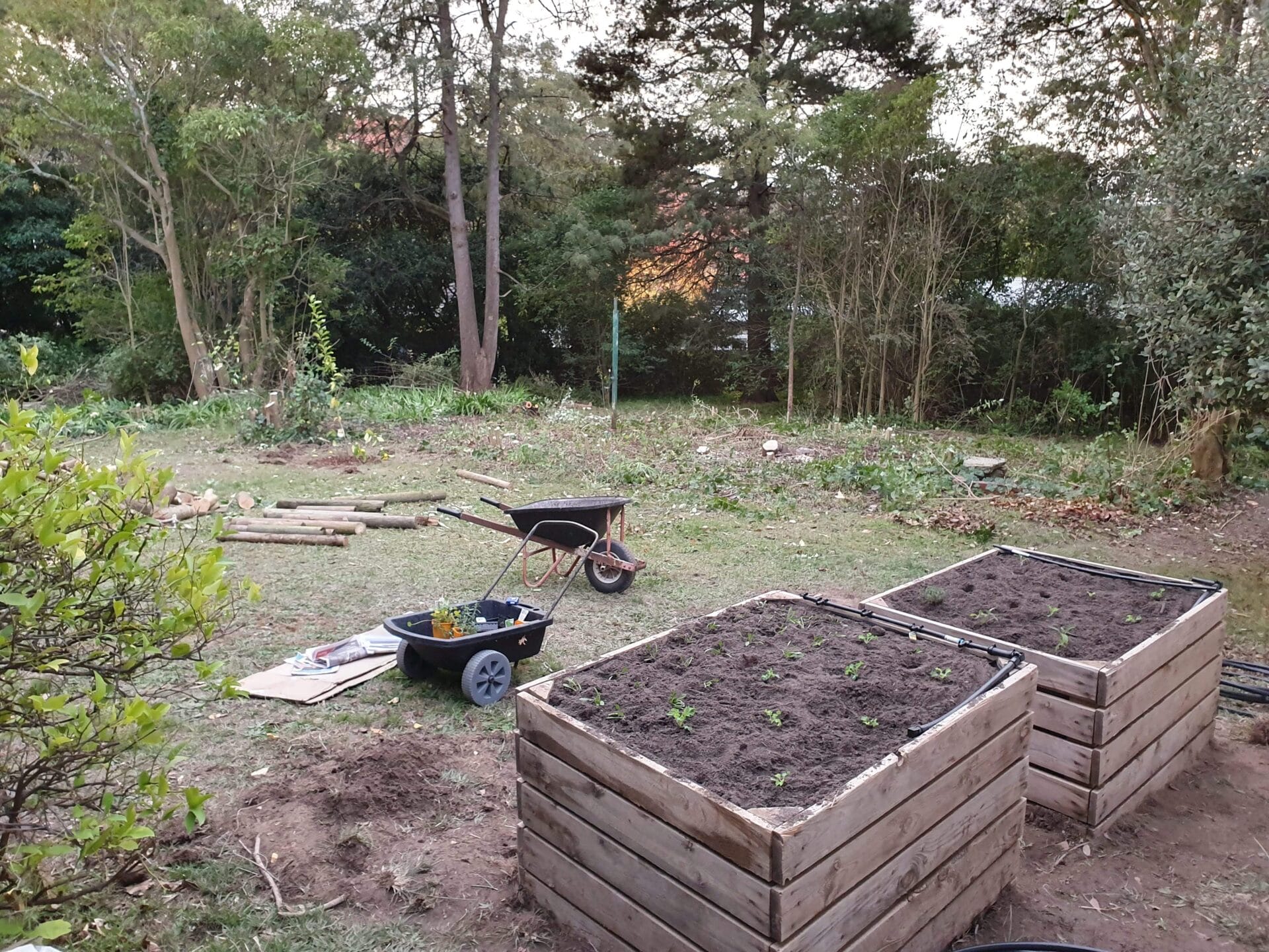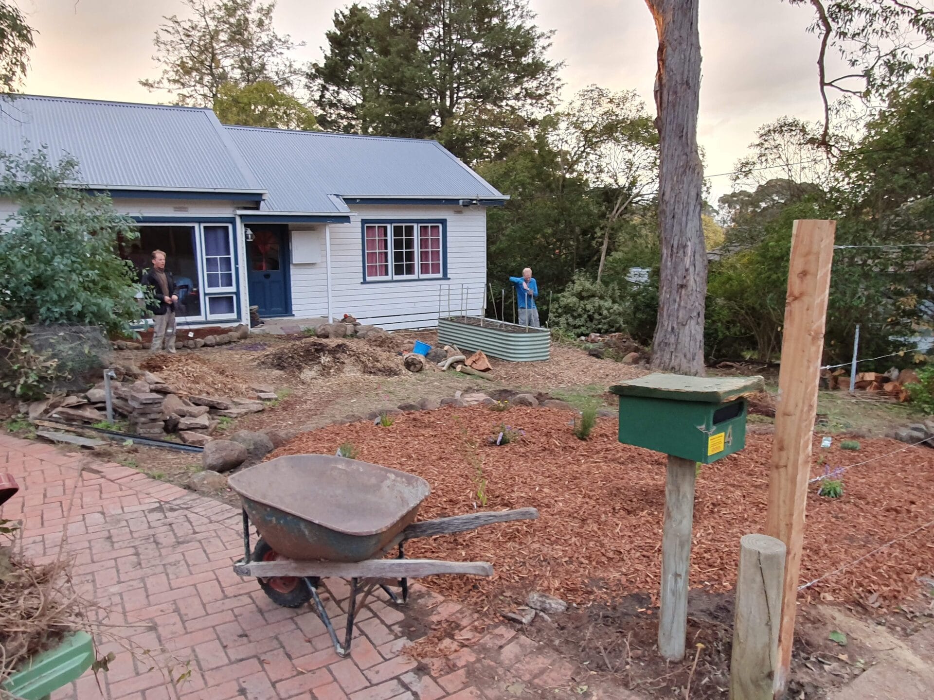 Kirri & Phi spent months sourcing 3 veggie beds, rabbit poo compost (for the hugelkulture beds), soil, mulch, woodchip, cardboard, all the native plants and shrubs for the front garden, netting, all bits and pieces necessary for the new wired fence and all the parts for the irrigation.