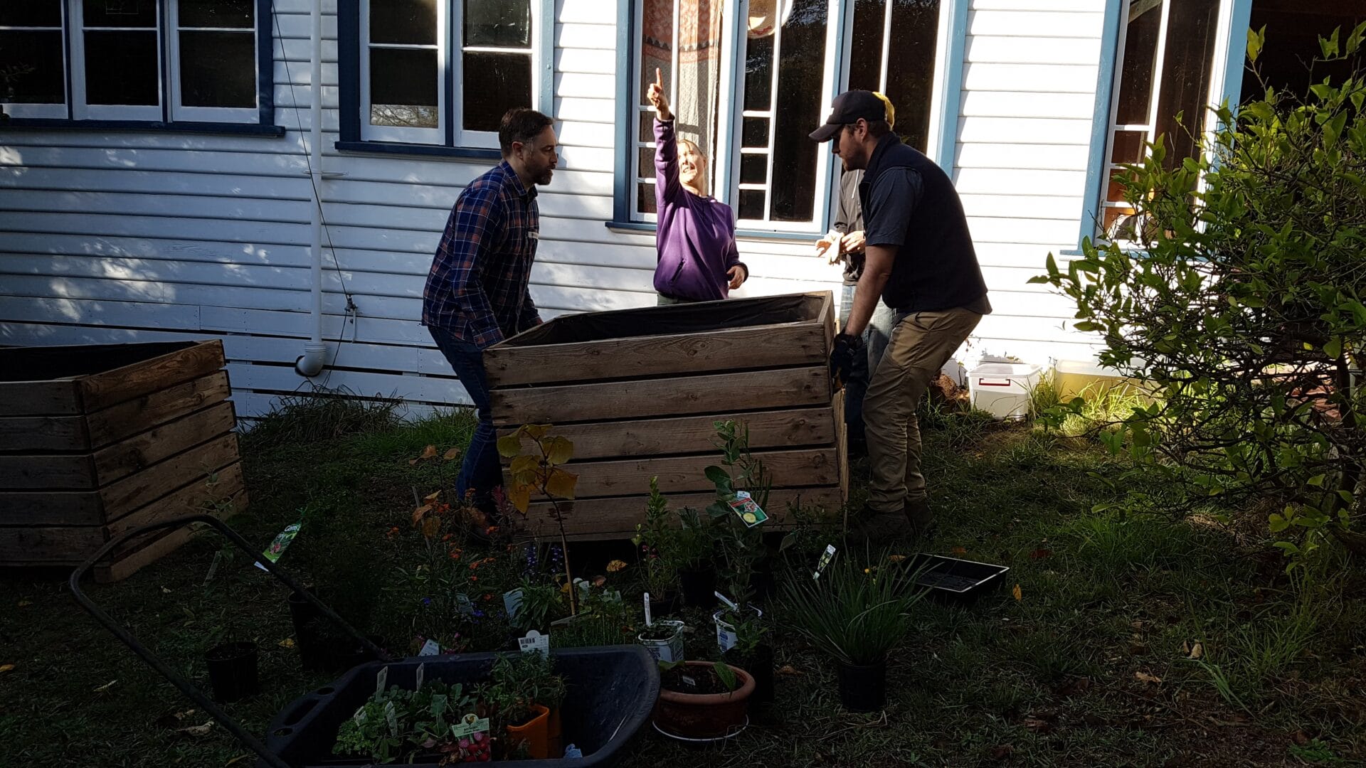 Before Tom & Josh can break ground and level out the veggie beds, Adrian and Kirri help work out the perfect position.