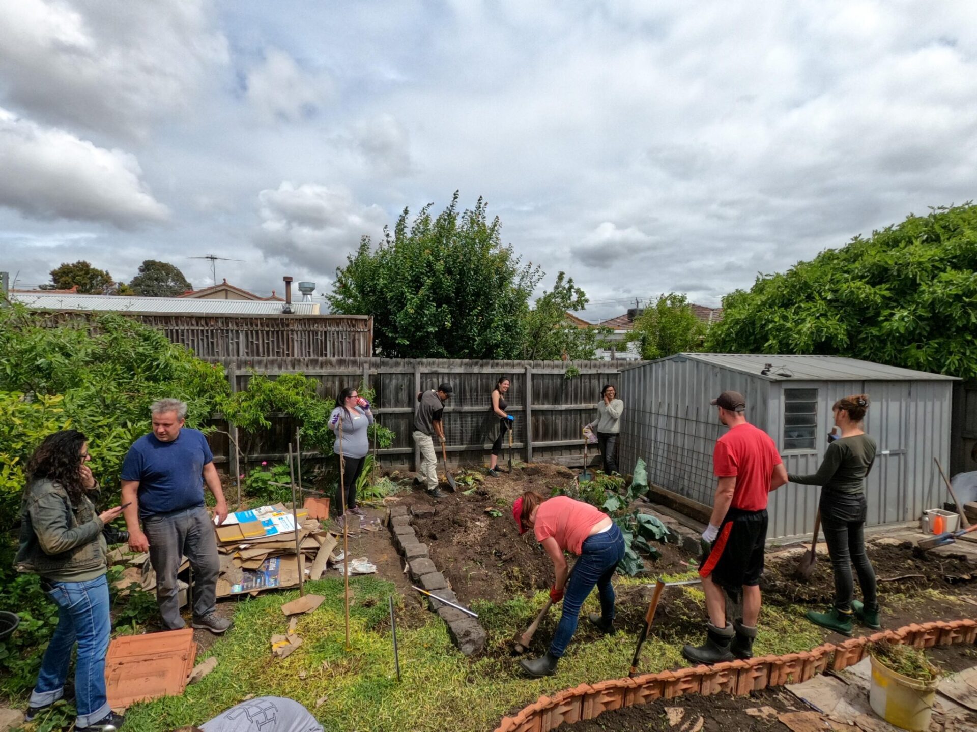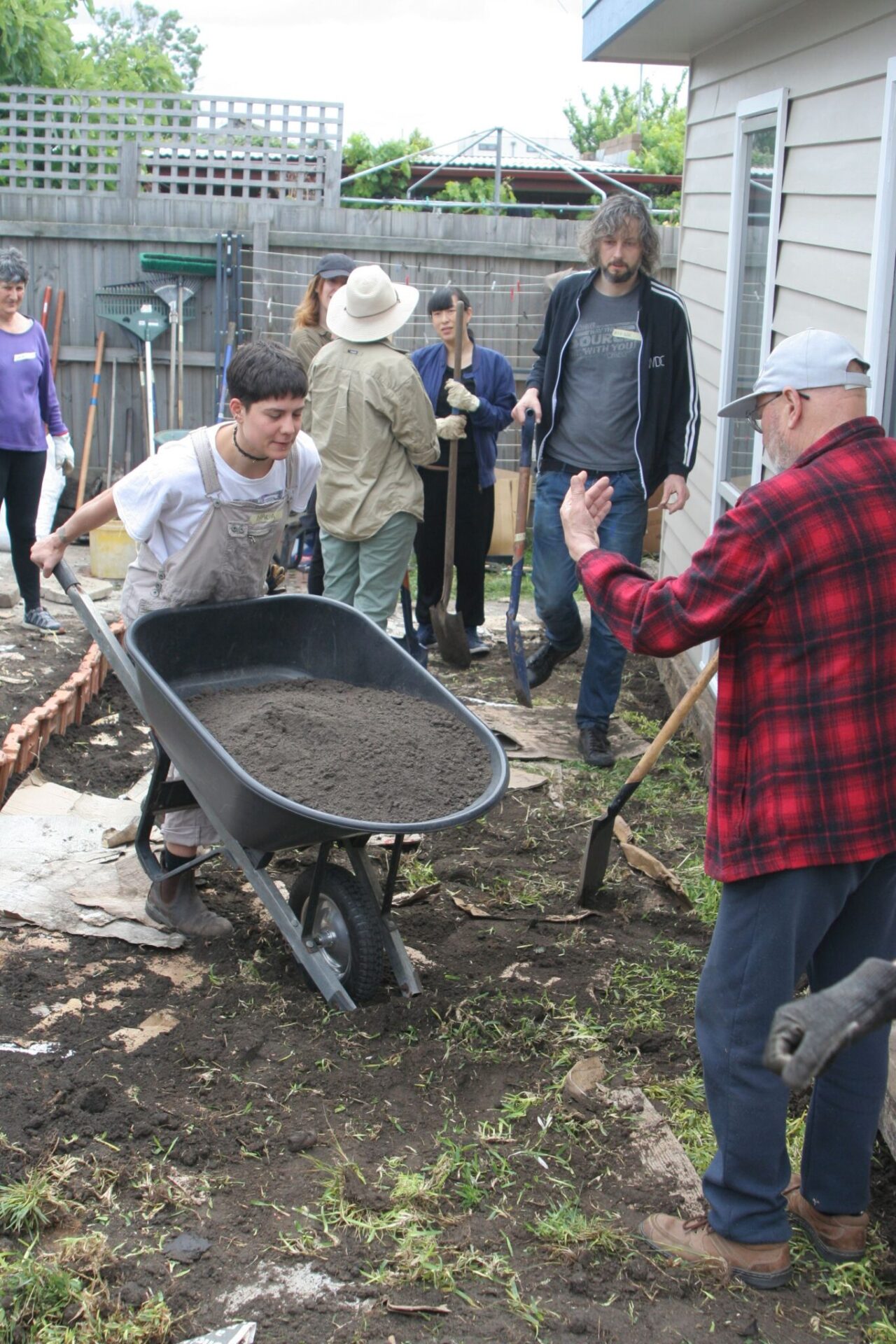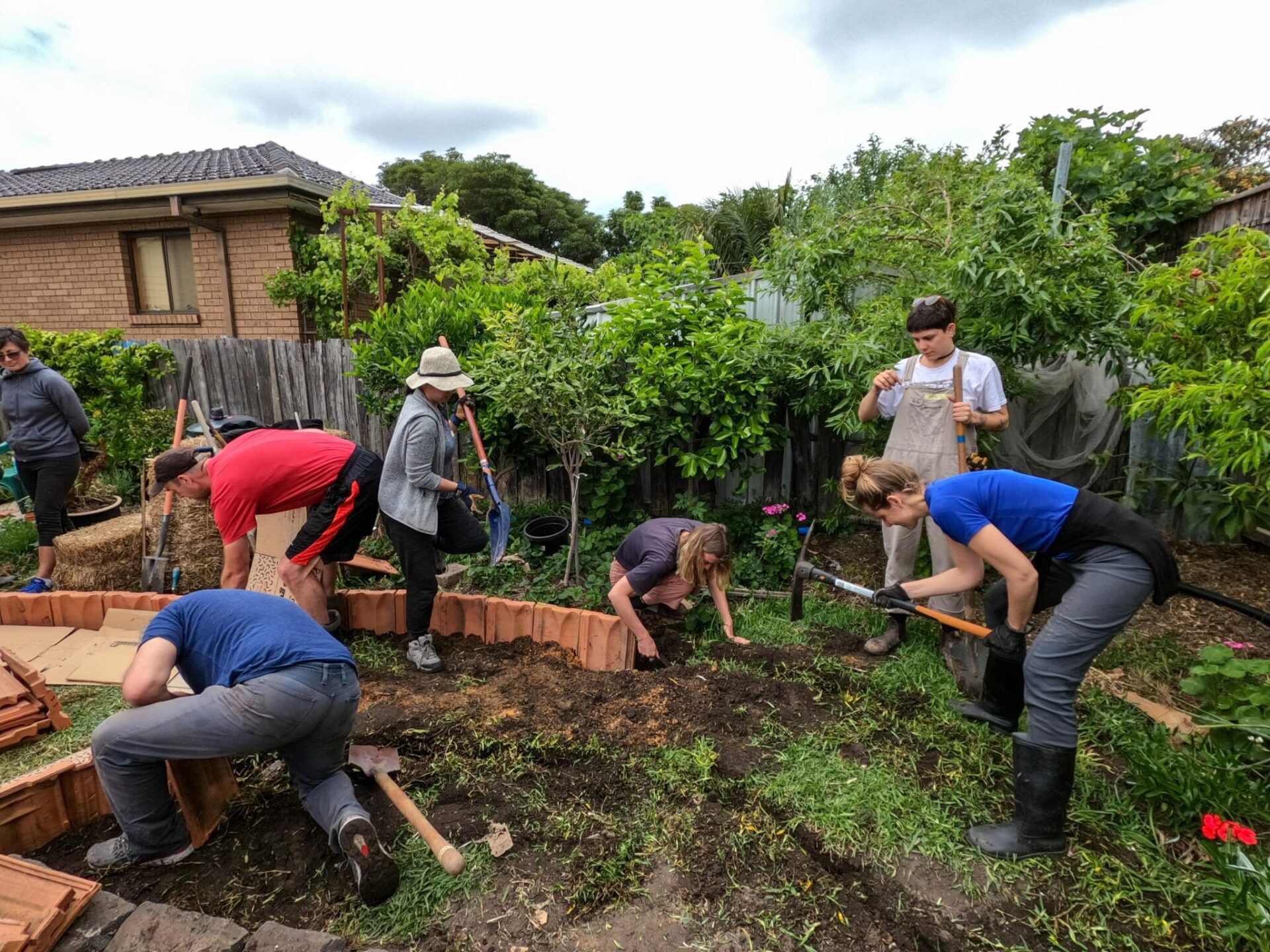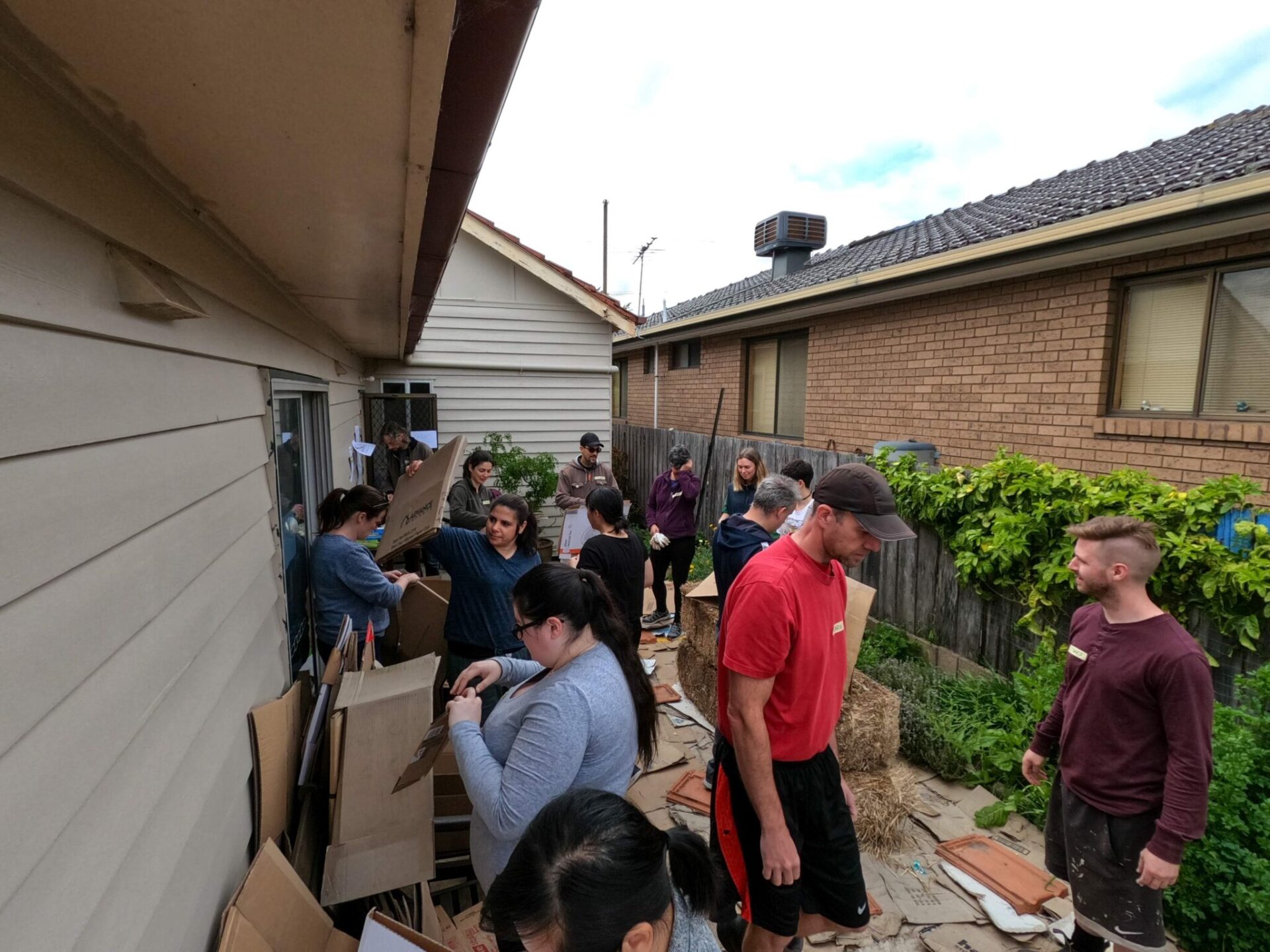 It’s a cool overcast Sunday in November, and we are at James’ house in Coburg for Permablitz #219. People trickle in from 9:30, labelling tools and putting on name tags. While we wait to get started there are cuppas, conversation and removal of tape from the huge quantity of cardboard boxes that James has collected (ready for use as sheet mulch).