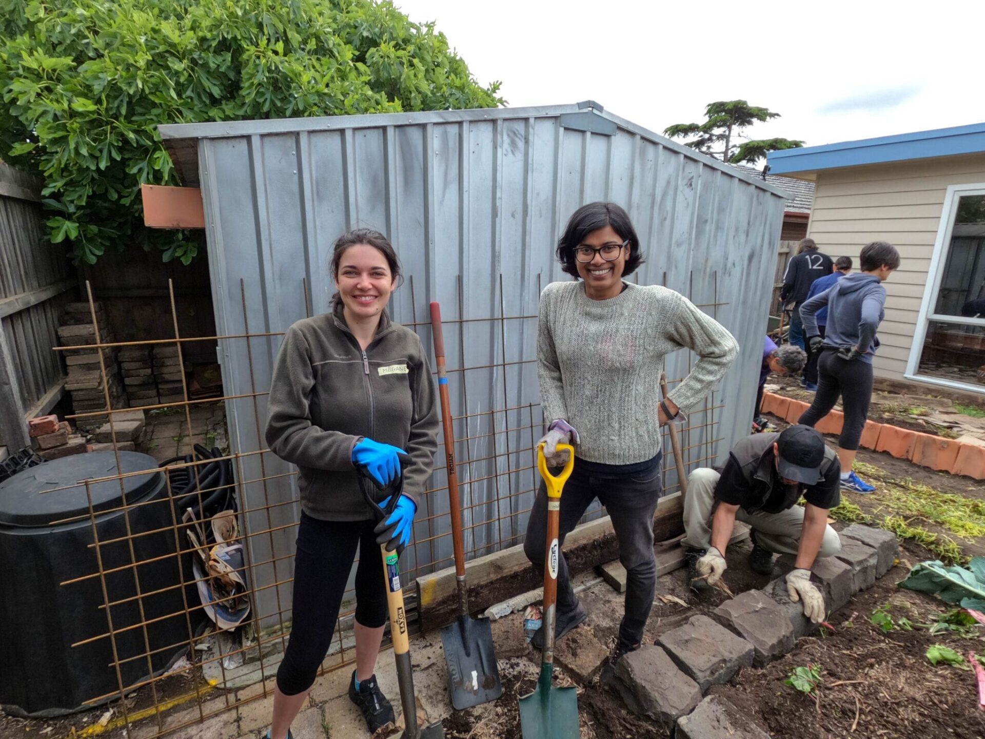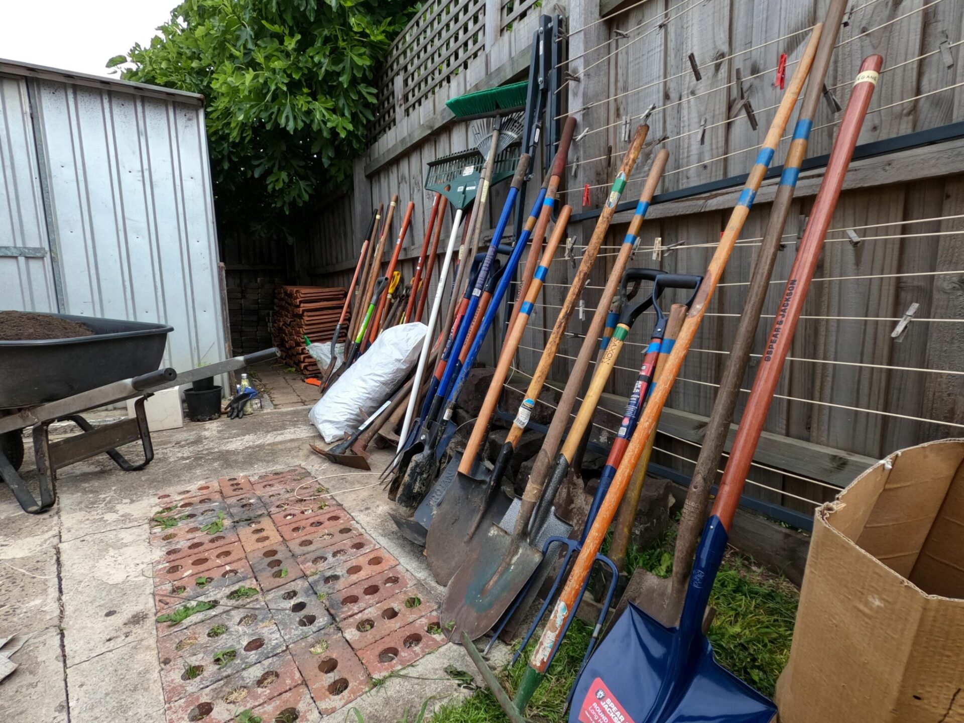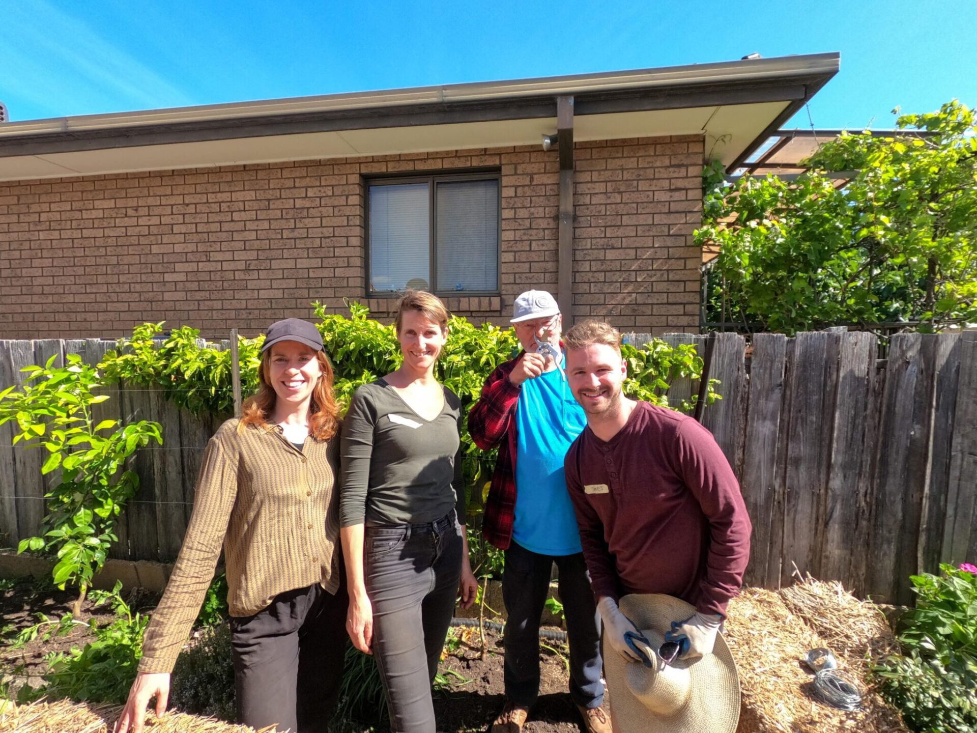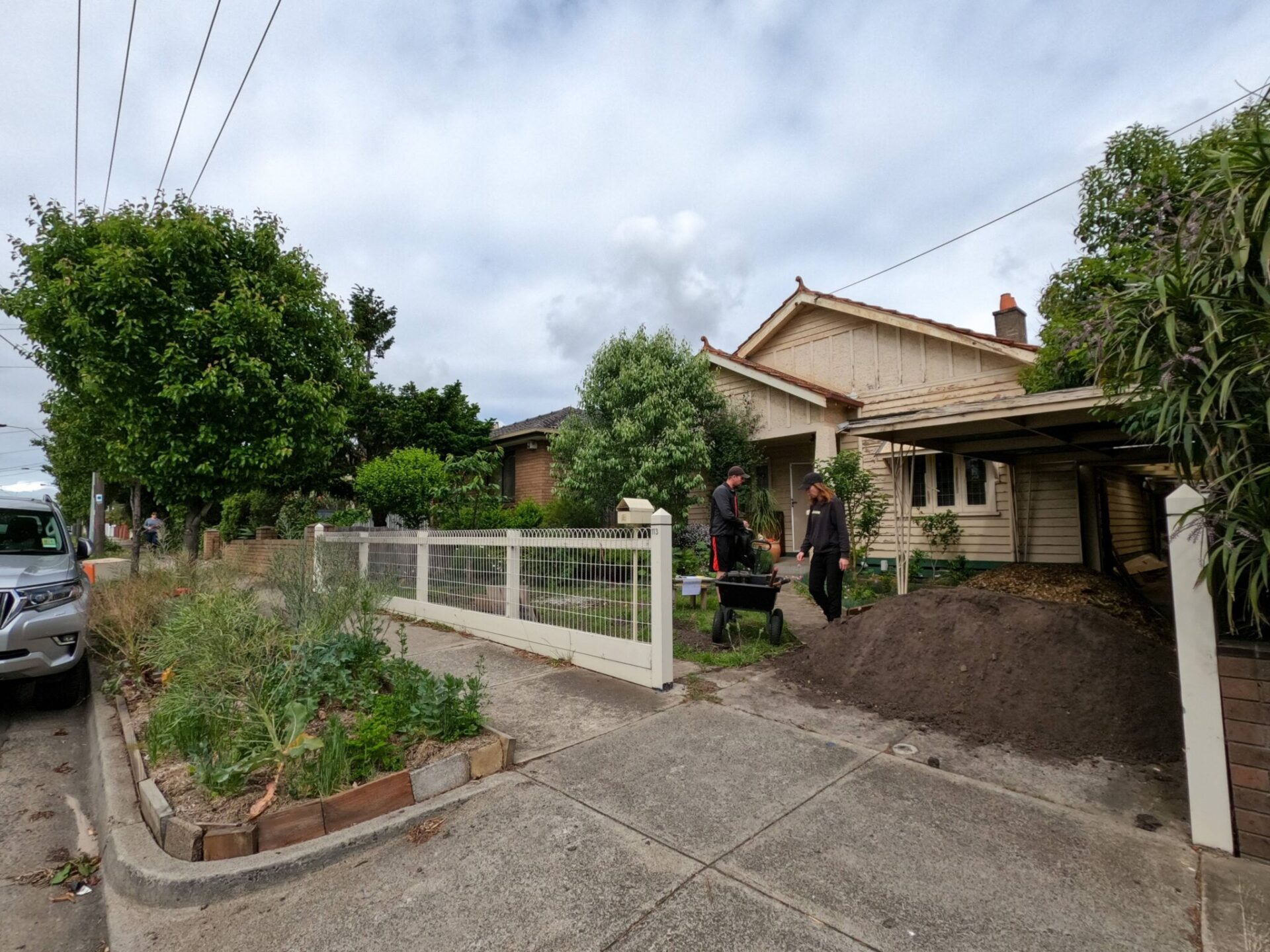 It’s a cool overcast Sunday in November, and we are at James’ house in Coburg for Permablitz #219. People trickle in from 9:30, labelling tools and putting on name tags. While we wait to get started there are cuppas, conversation and removal of tape from the huge quantity of cardboard boxes that James has collected (ready for use as sheet mulch).