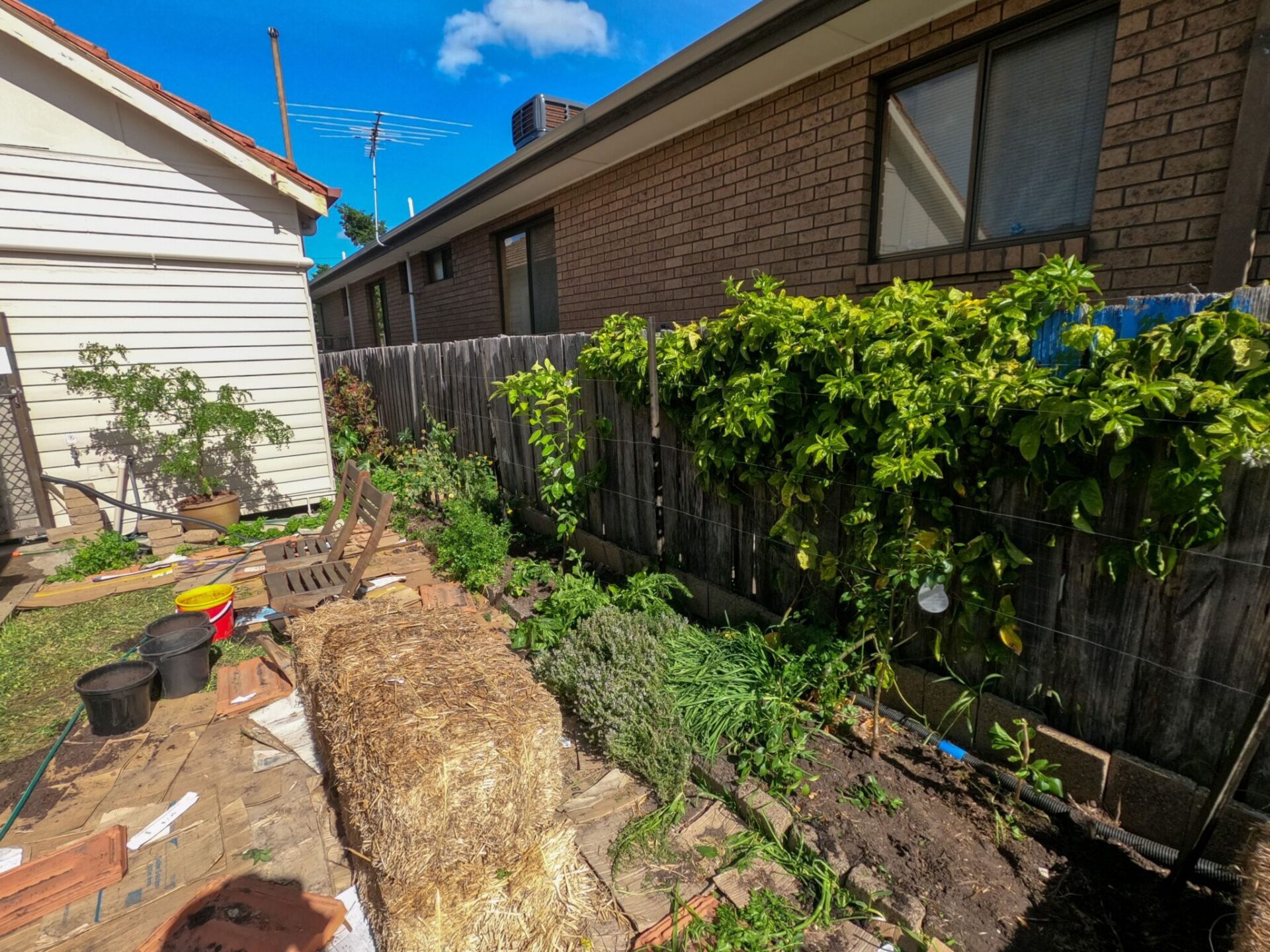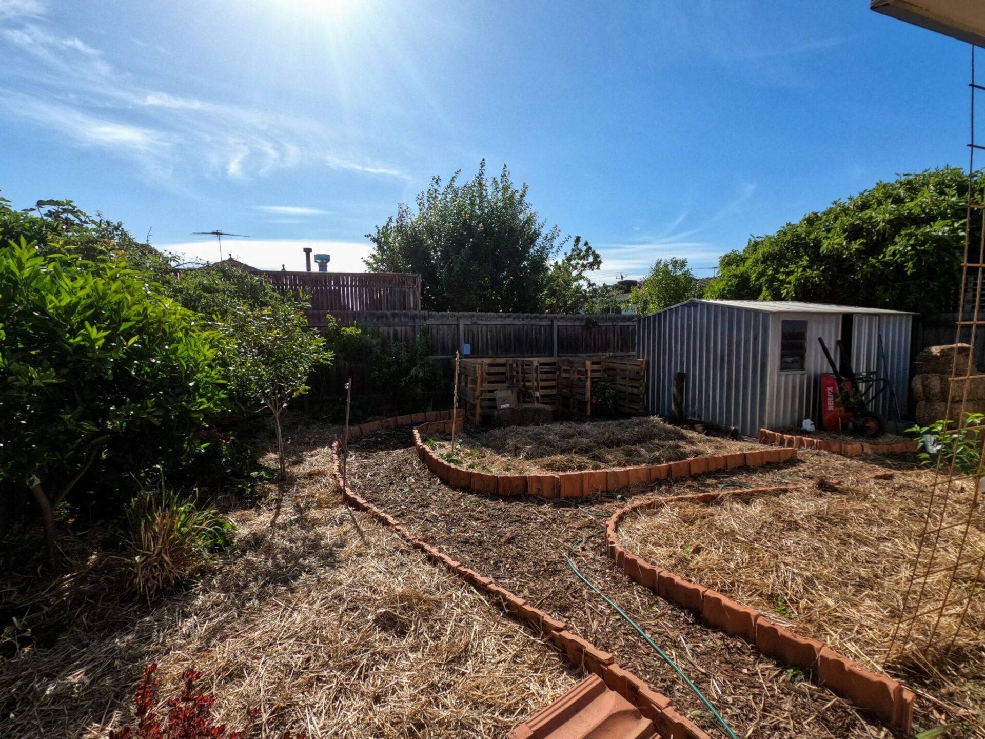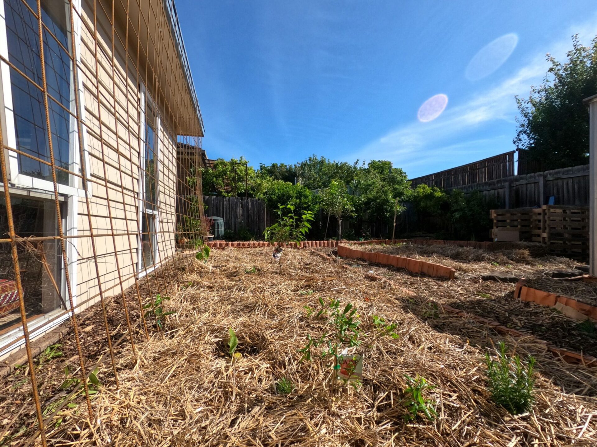 The couch grass in the backyard was sheet mulched over with cardboard. New soil was mixed with sheep manure and a thick layer of straw was laid over the top. Pomegranate, guava and mulberry trees were planted into these new garden beds, with understory plantings as well. Space was left ready for future additions to be planted into.