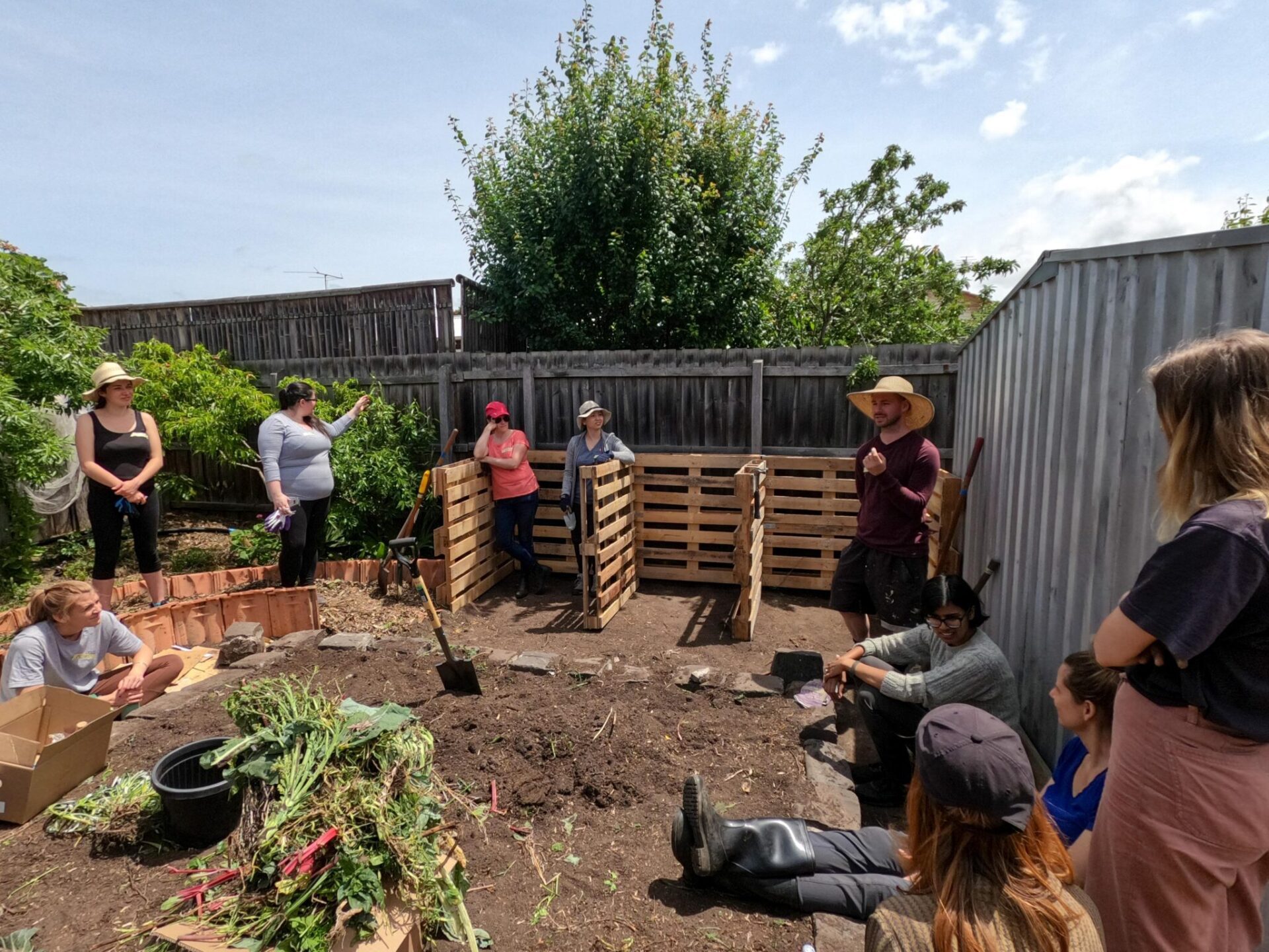 The bulk of the digging tasks were completed early in the day, before the sun came out. This allowed for less sweaty activities and a number of workshops to be run. James ran us through his composting system and how he intends to use his new setup. Inger and Prue presented on the seven different plant layers that can be integrated to create a food forest. Terry gave two demonstrations, one on planting fruit trees and another on building a frame for the espalier trees. These provided a great opportunity to share knowledge between the group.