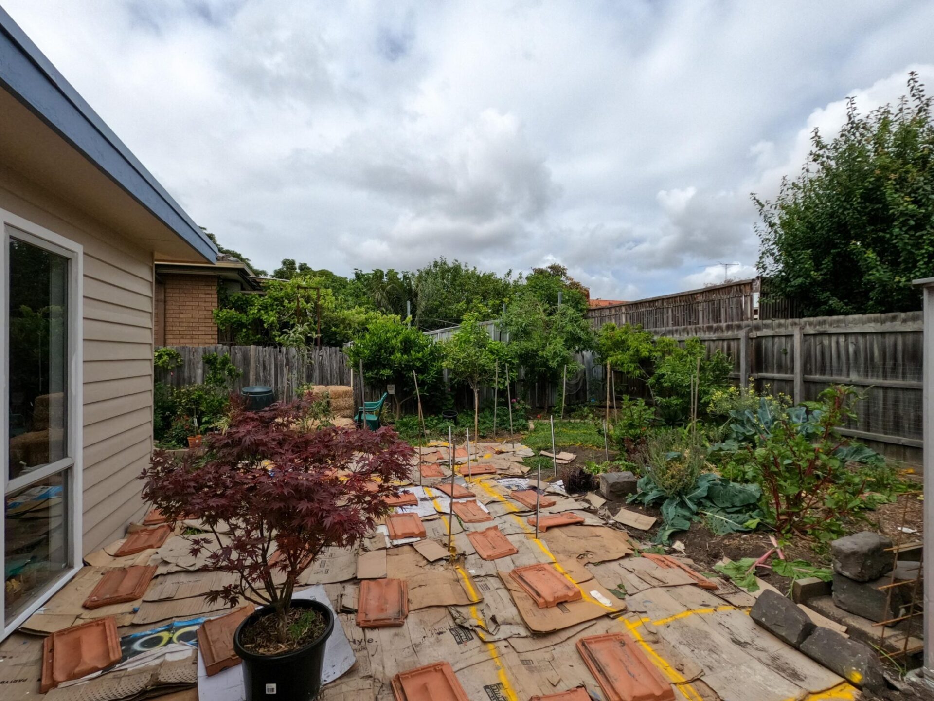James and his brother have been living in the house, a Californian bungalow with a weatherboard rear extension, for the past four years. James has an interest in permaculture and has already planted out one corner of the garden. His urban food forest contains almond, macadamia, nectarine and lime trees, as well as an understory of flowers and strawberries. The garden also has an annual vegetable bed and a shed, but the remaining half of the backyard is grass.
