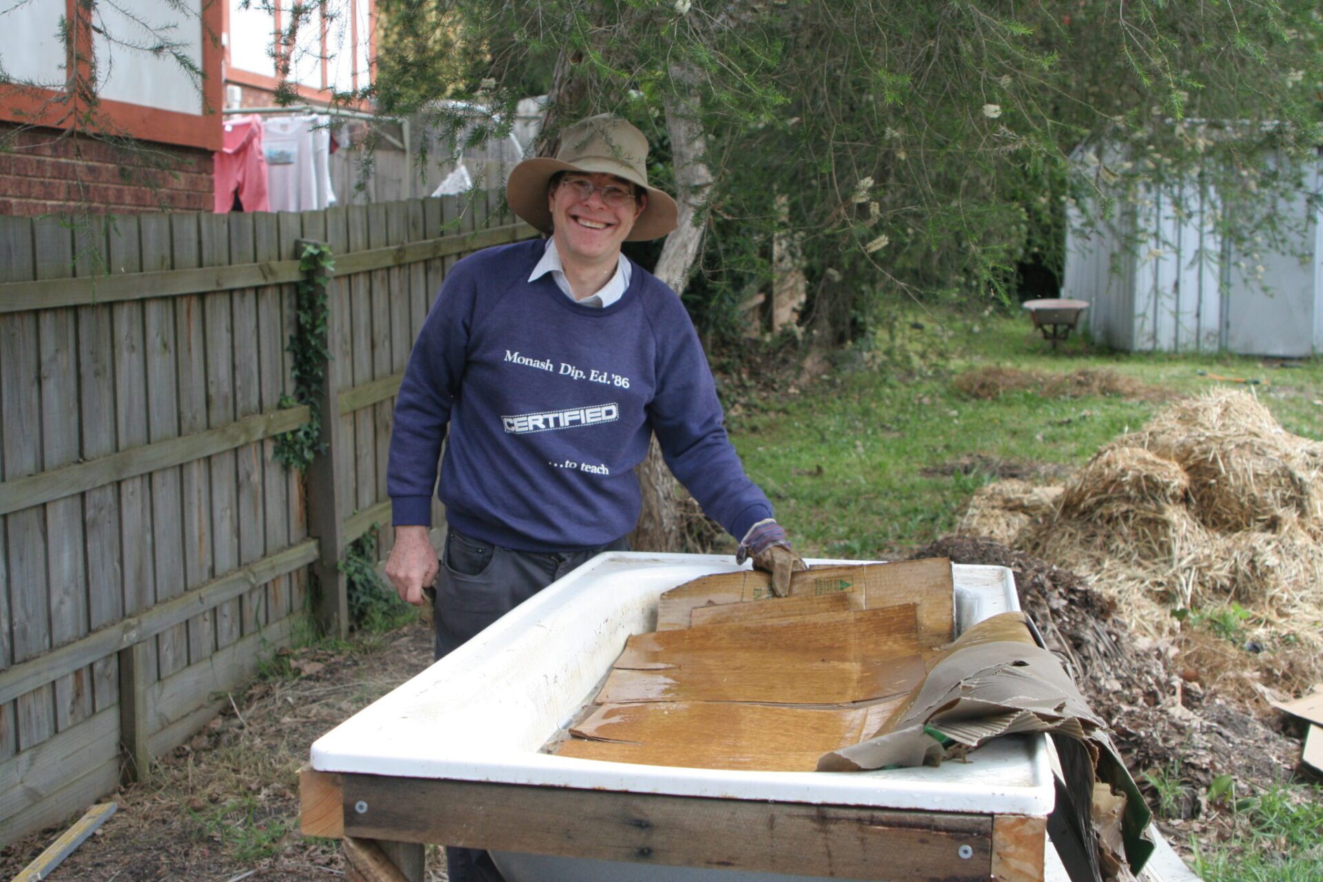 Before we break for lunch, Jon entices the kids over for a worm farm workshop, using a converted old bathtub as an example of repurposing disused items. The children are excited to pick up the worms and place them in the prepared bed, along with food scraps.