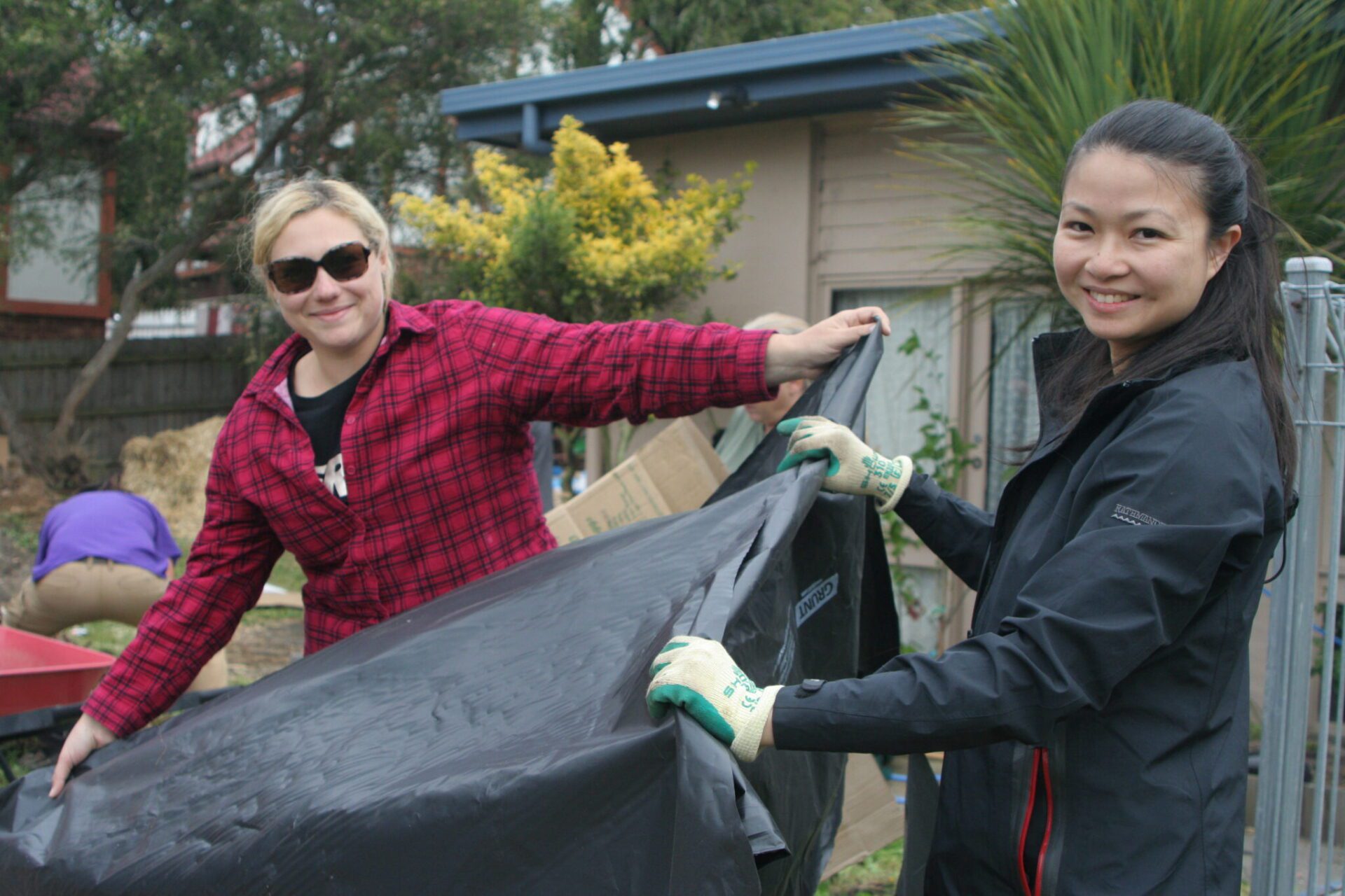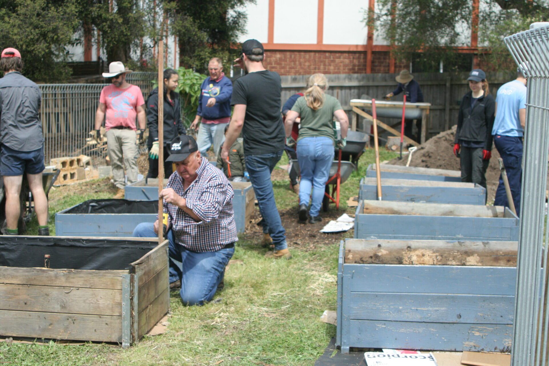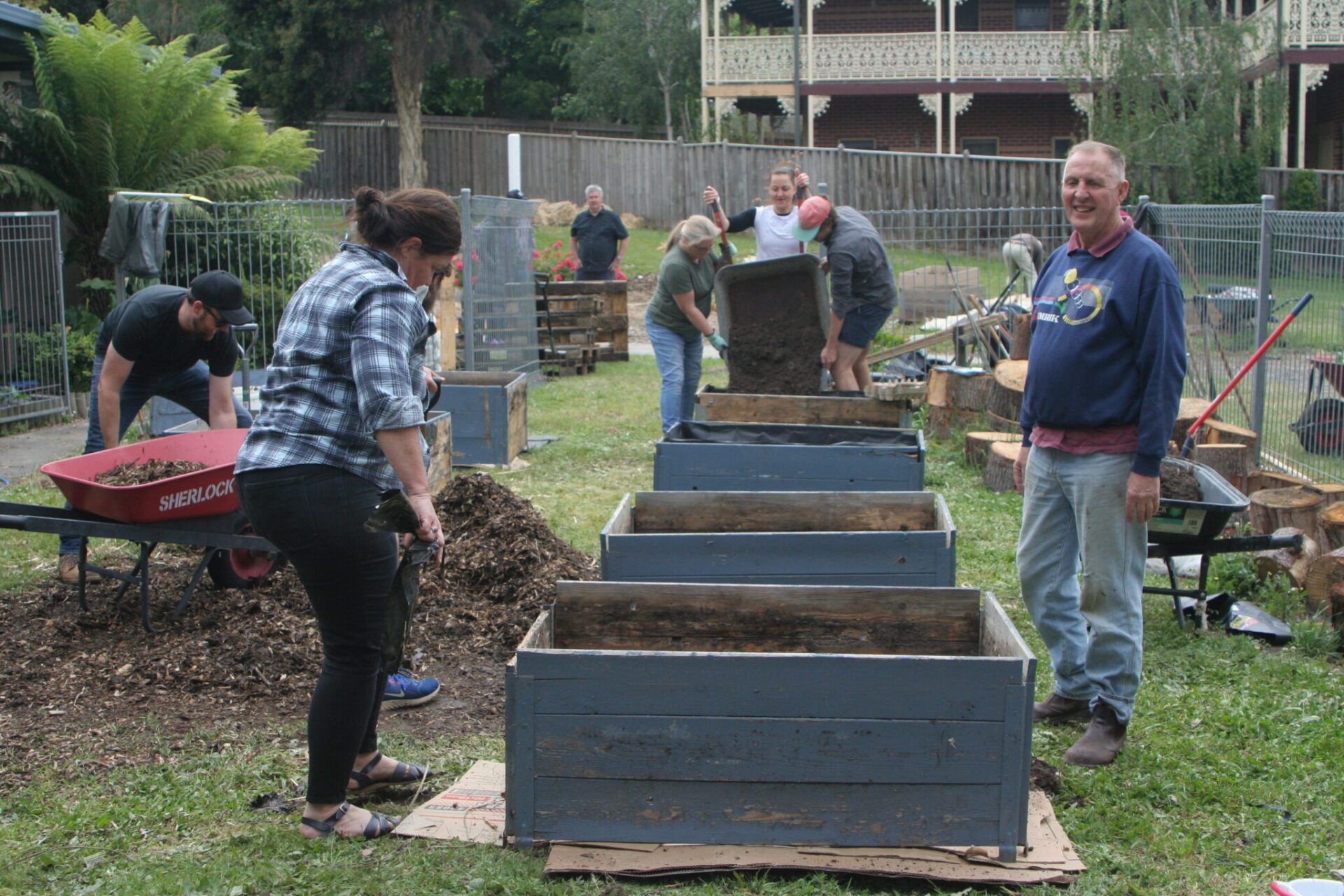After Emma announces a rundown for the day, the enthusiastic volunteers set off, starting with the fenced-in children’s area. A pile of raised garden beds, donated by Bunnings several years ago, is put to use once again, with volunteers assembling eight of the beds. Each is lined with a textile barrier, then layered with cardboard, egg cartons, newspaper and compost using the lasagne method. Volunteers bend wire mesh into arches and install them between some of the beds to grow climbing plants, such as raspberries. Along the fence, logs of wood are re-purposed into steps for children to play on. Strawberries are planted into the nooks and crannies between them.