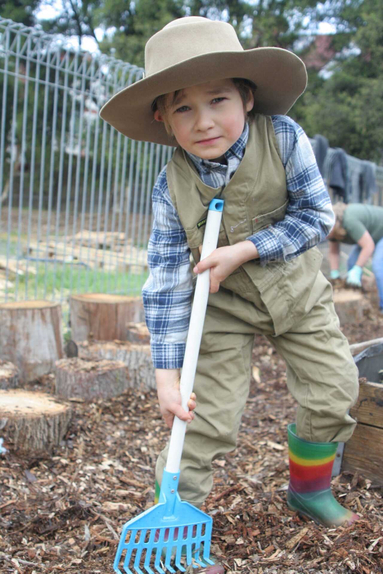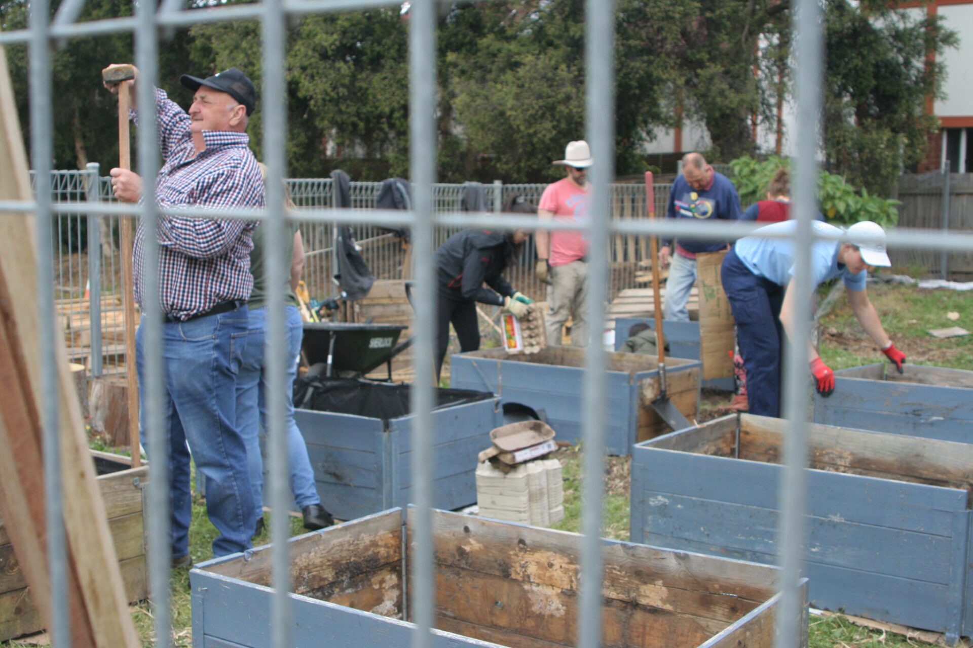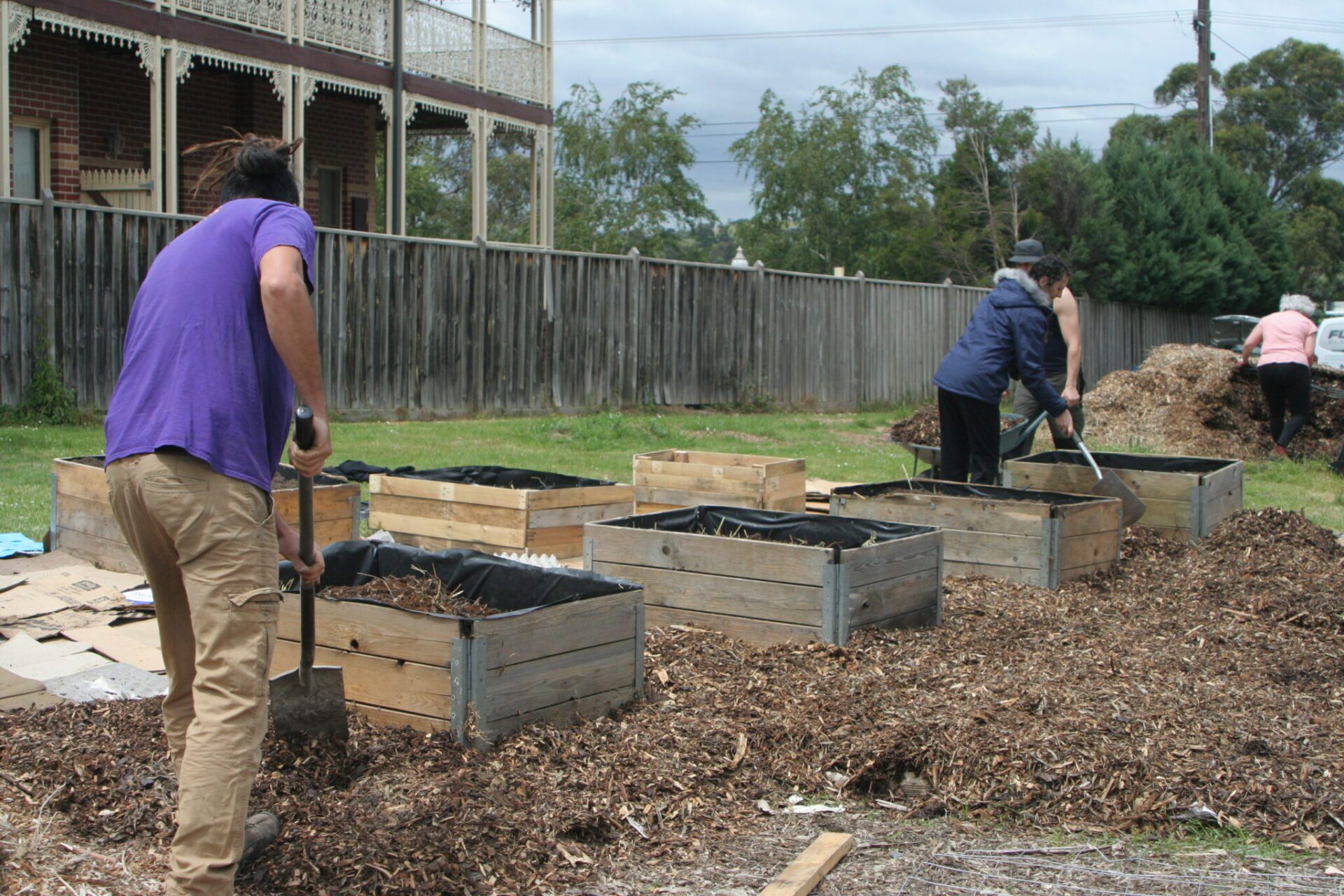 In just two hours, the overgrown weeds are gone and the rejuvenated garden has taken shape. While the volunteers work away on the garden, Emma’s partner installs a rain tank, paid for through a grant with Knox City Council. Another volunteer with carpentry experience dismantles old wooden pallets and transforms the planks of wood into a mud kitchen for the kids. Near the entrance of the church, a group of volunteers work away on a large area of grass, installing more raised garden beds and wheelbarrows of mulch between them.