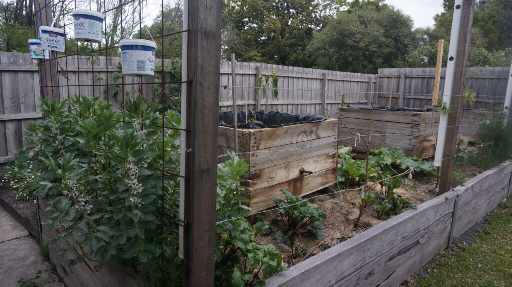 It takes a while for a garden (and the gardeners) to mature so Alex and Nicole are experimenting a lot with plants and where to put them. Artichokes, for example, are growing rather well, but they have realised that these are not their favourite vegetables. A fig tree and other plants that weren’t happy have been transplanted and one of the wicking beds is currently a hospital for the ‘infirm’. Rhubarb wasn’t happy in the back layer of the garden but loves being between the wicking beds.