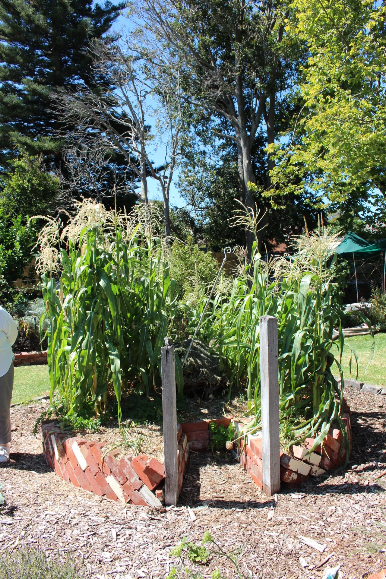 The standout for me was the African Keyhole bed, which was built up using a decorative array of bricks in a circle, with an opening (keyhole) so that a person can step in to dump vegetable scraps, lawn clippings, etc. into the wire basket in the centre for composting. No further work is necessary as the composted goodness seeps into the earth around it to nourish whatever is planted there.