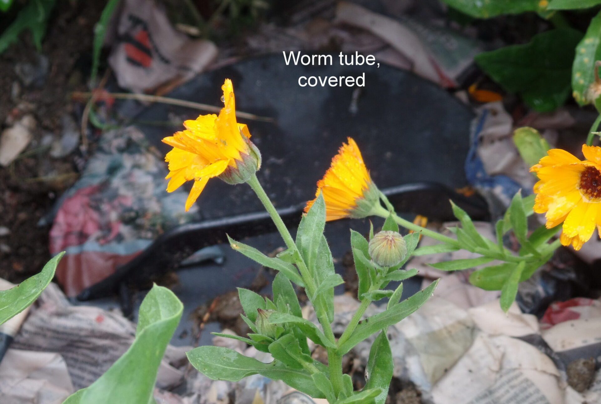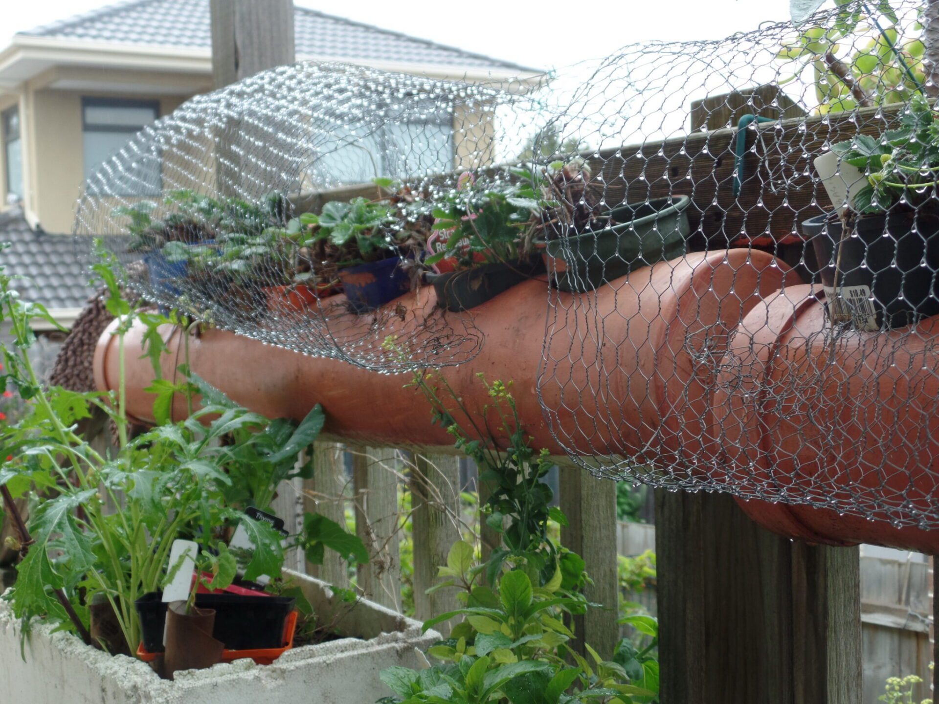The only element of the original permablitz that didn’t work was the bathtub fish pond in front; the tub leaked so the pond was turned into a raised garden instead – a great example of “the problem becoming the solution!” The compost bins did their job, but the rats are difficult to discourage, and the worm tubes work really well. As a result the bins are now upside down, growing things.