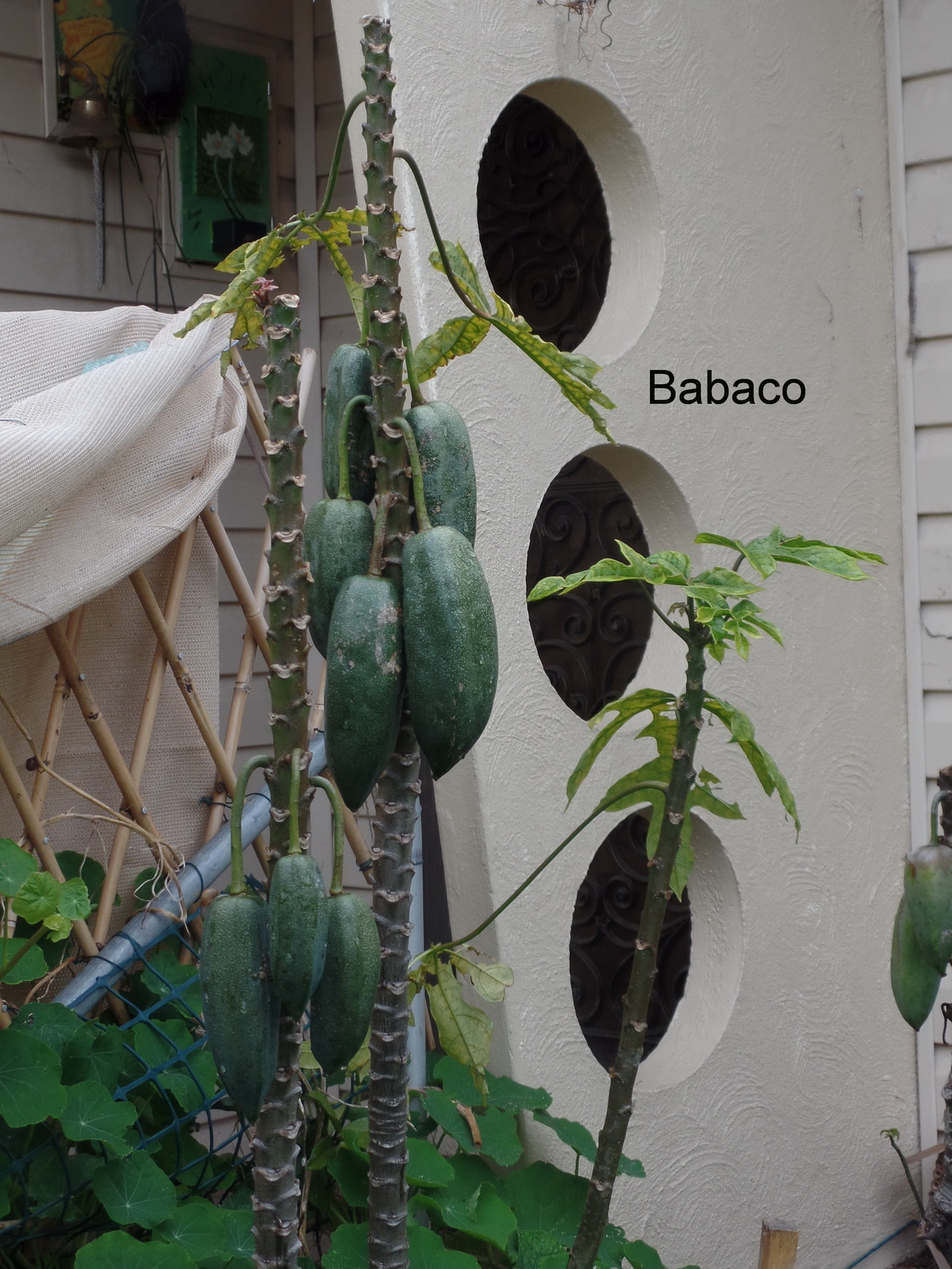 On his small suburban block, Damian easily provides for his needs for much of the year. In addition to all the usual tomatoes, strawberries, pumpkins and so on, he has sourced many things we don’t usually find in the local shops, all of which are growing like mad. Pepinos, tamarillos, two types of mulberry, loquats, several guavas and a babaco are just some of the more exotic fruits. The babaco is a native of Ecuador, but grows well here and produces a long fruit from a single, tall stalk (see the photo above). There are muntries – a native berry not often grown in city gardens, warrigal greens, fig trees (kept small for the space), nasturtiums for colour and salad, parsley by the front step, strawberries in pipes on the back deck above the rocket and lettuce planted in boxes.